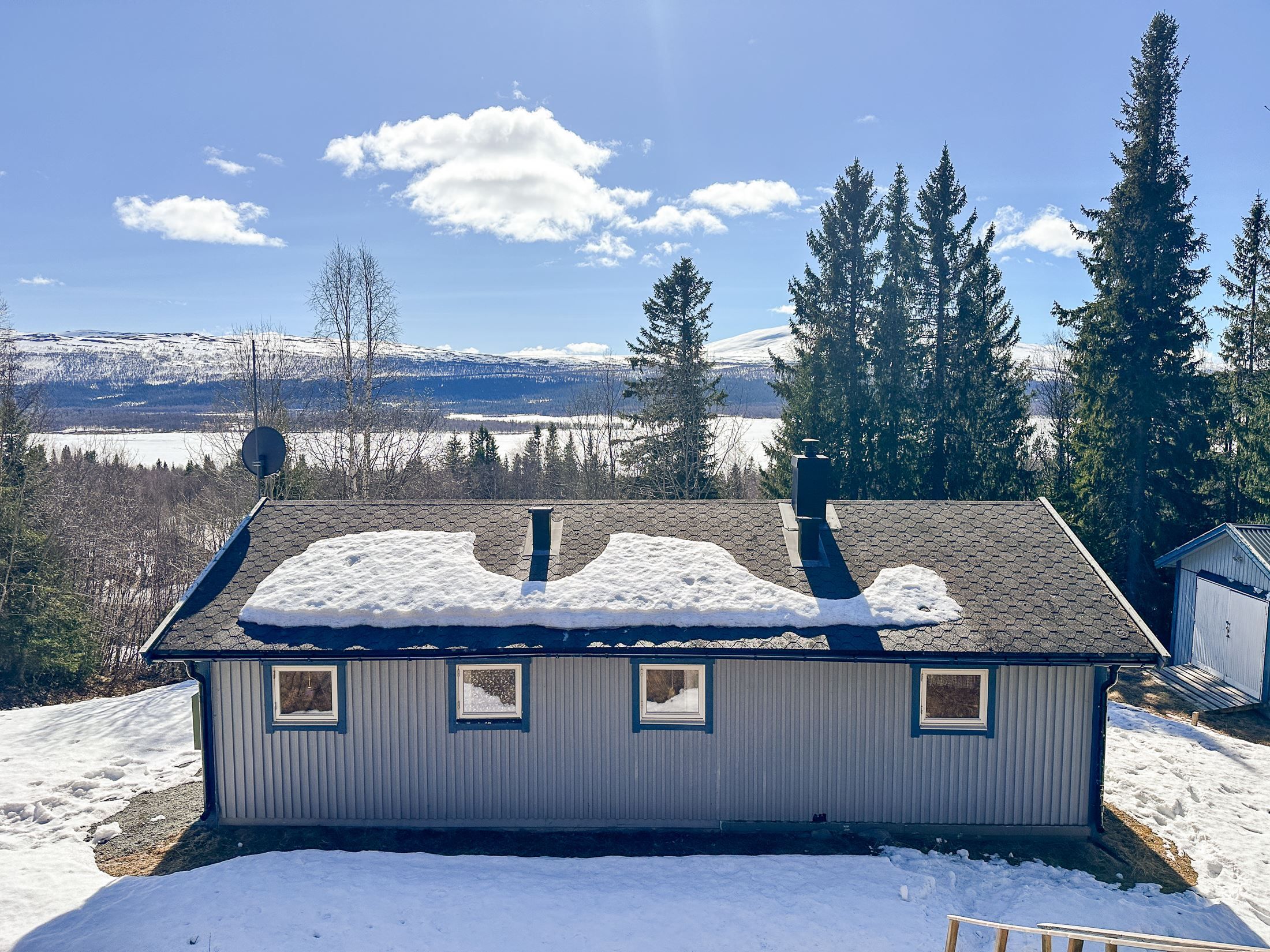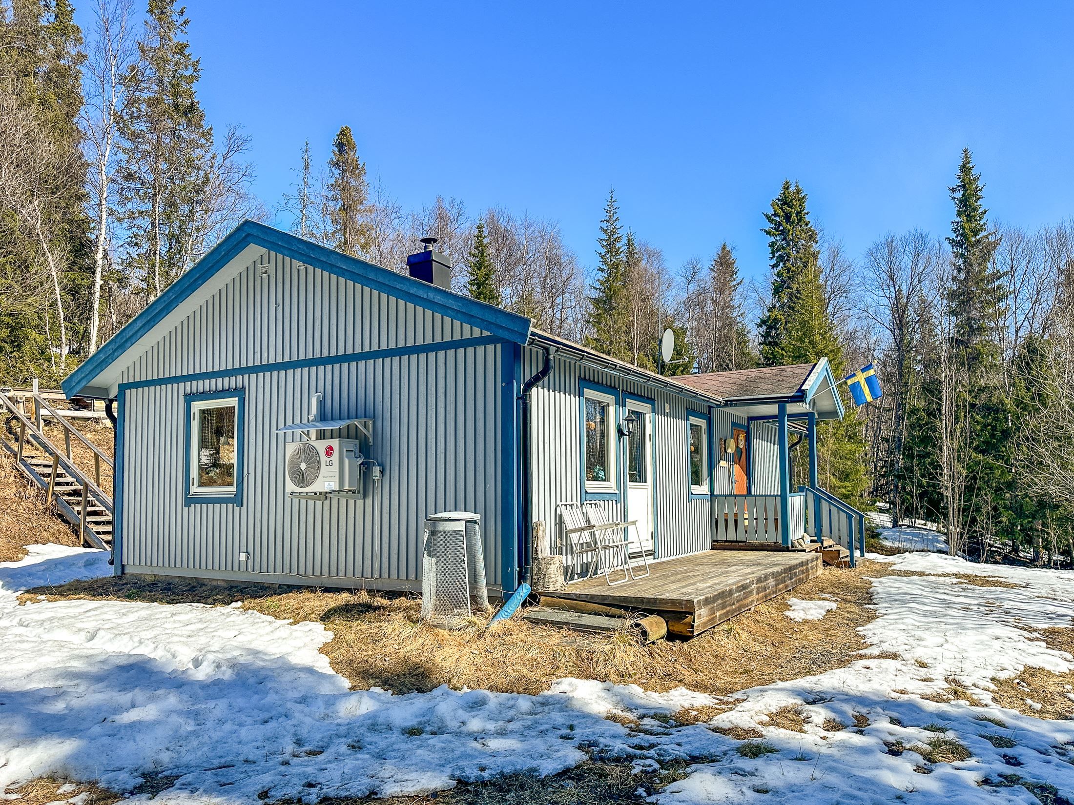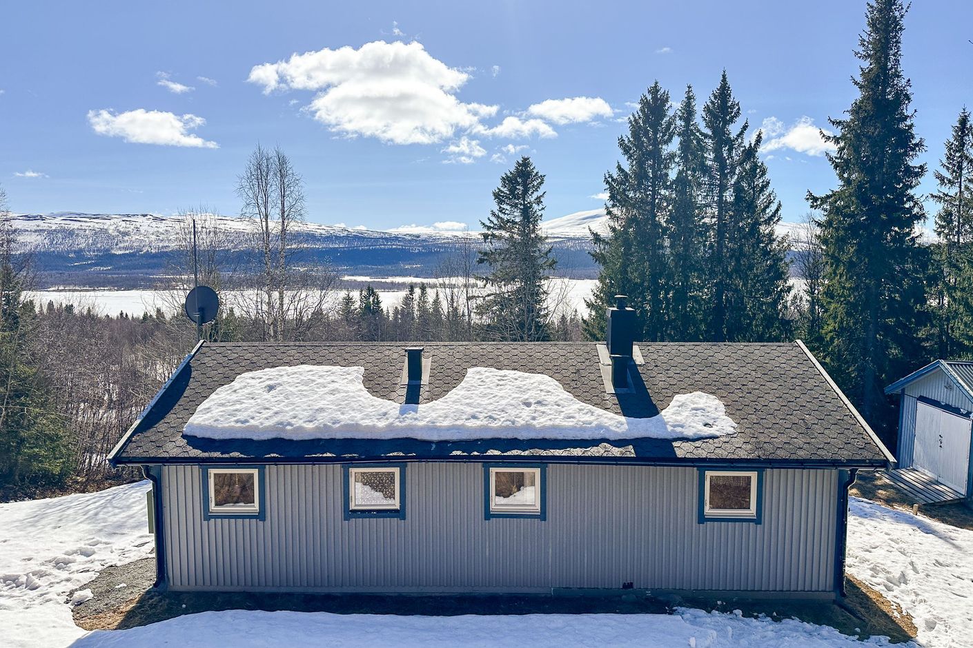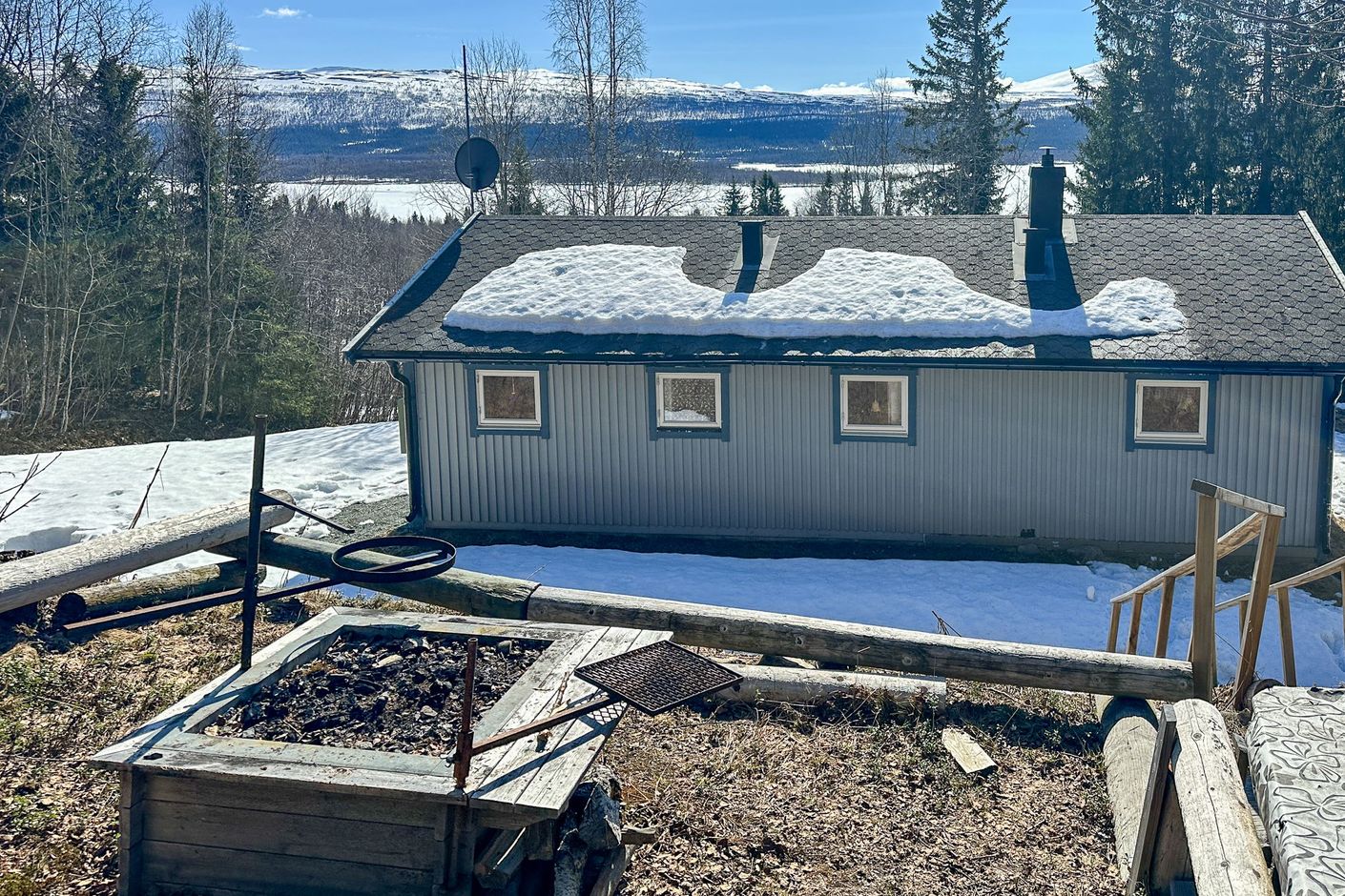 Utomhusmiljön bjuder på en trevlig grillplats på baksidan. Till fastigheten hör även ett garage som erbjuder goda möjligheter för förvaring av snöskoter, utrustning och annan friluftsutrustning.