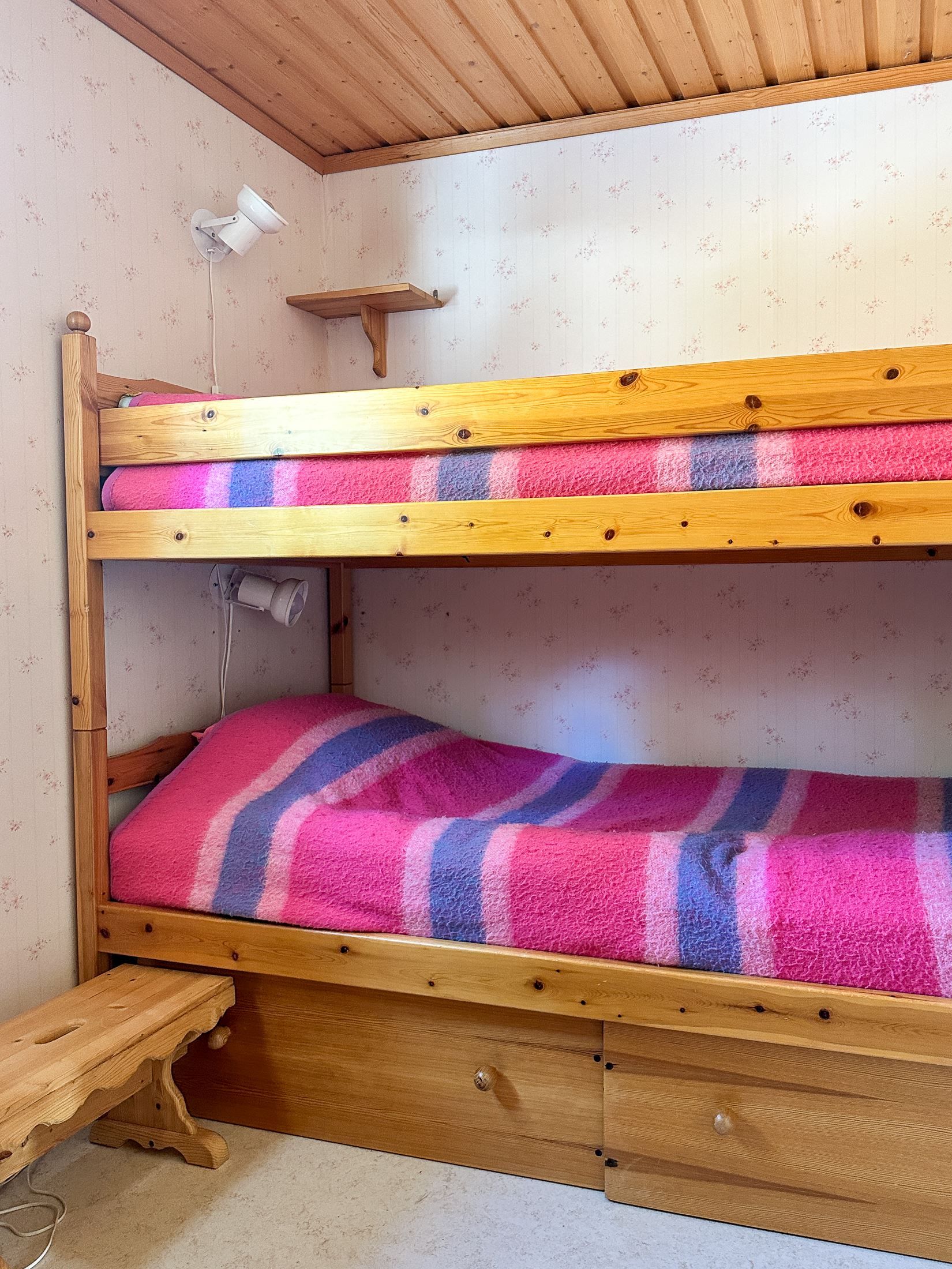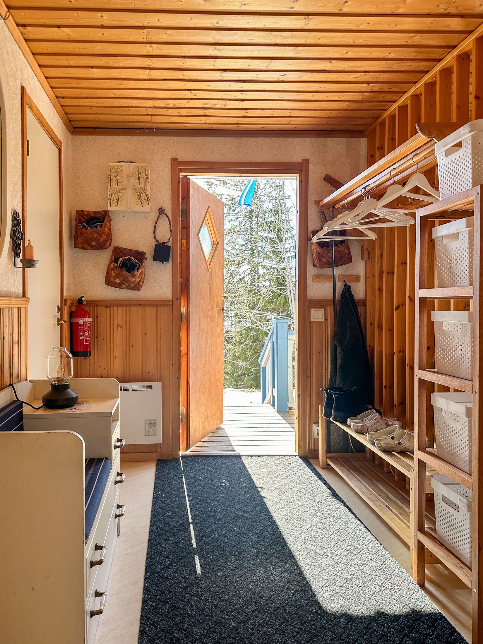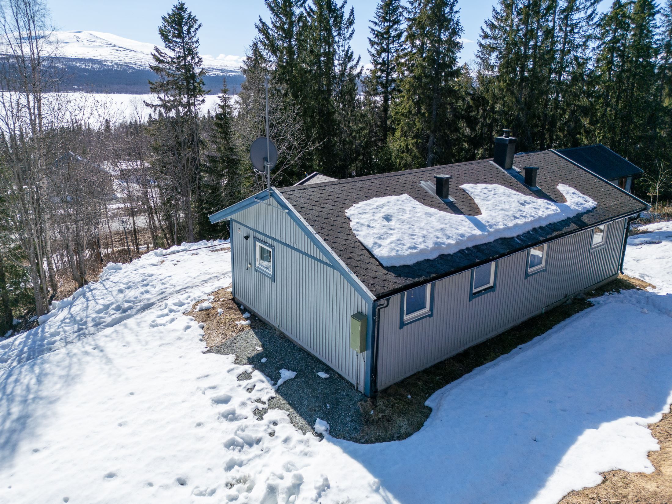 Huset erbjuder tre sovrum, vilket gör att det finns gott om plats. Allrummet är ett öppet och inbjudande sällskapsutrymme med breda trägolv, bröstpanel samt fönster och balkongdörr i sydvästläge som släpper in generöst med ljus. Härifrån blickar du ut över det vackra fjällandskapet och sjön nedanför. Braskaminen ger en extra värmekälla och bidrar till en ombonad känsla, särskilt under vinterhalvåret.