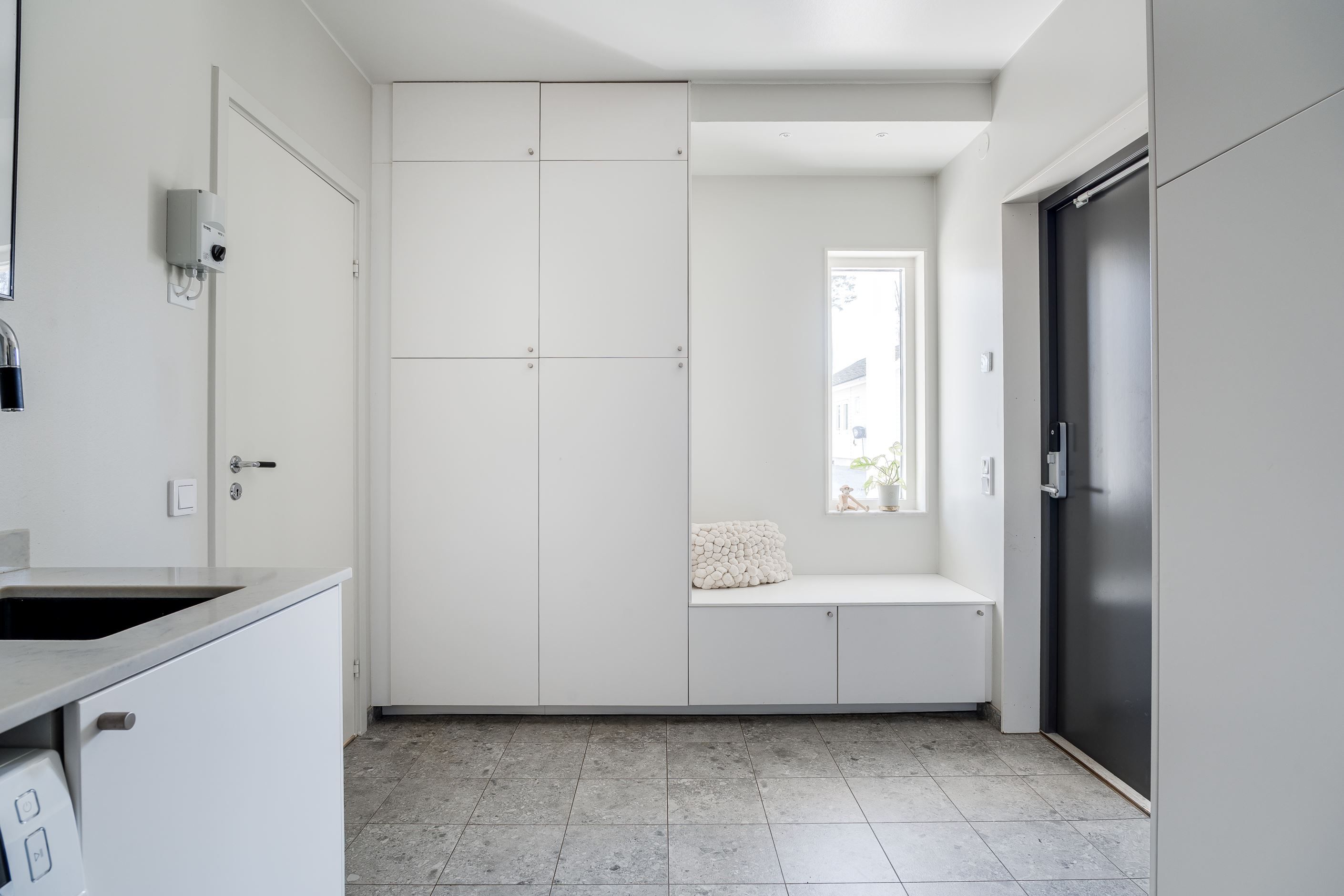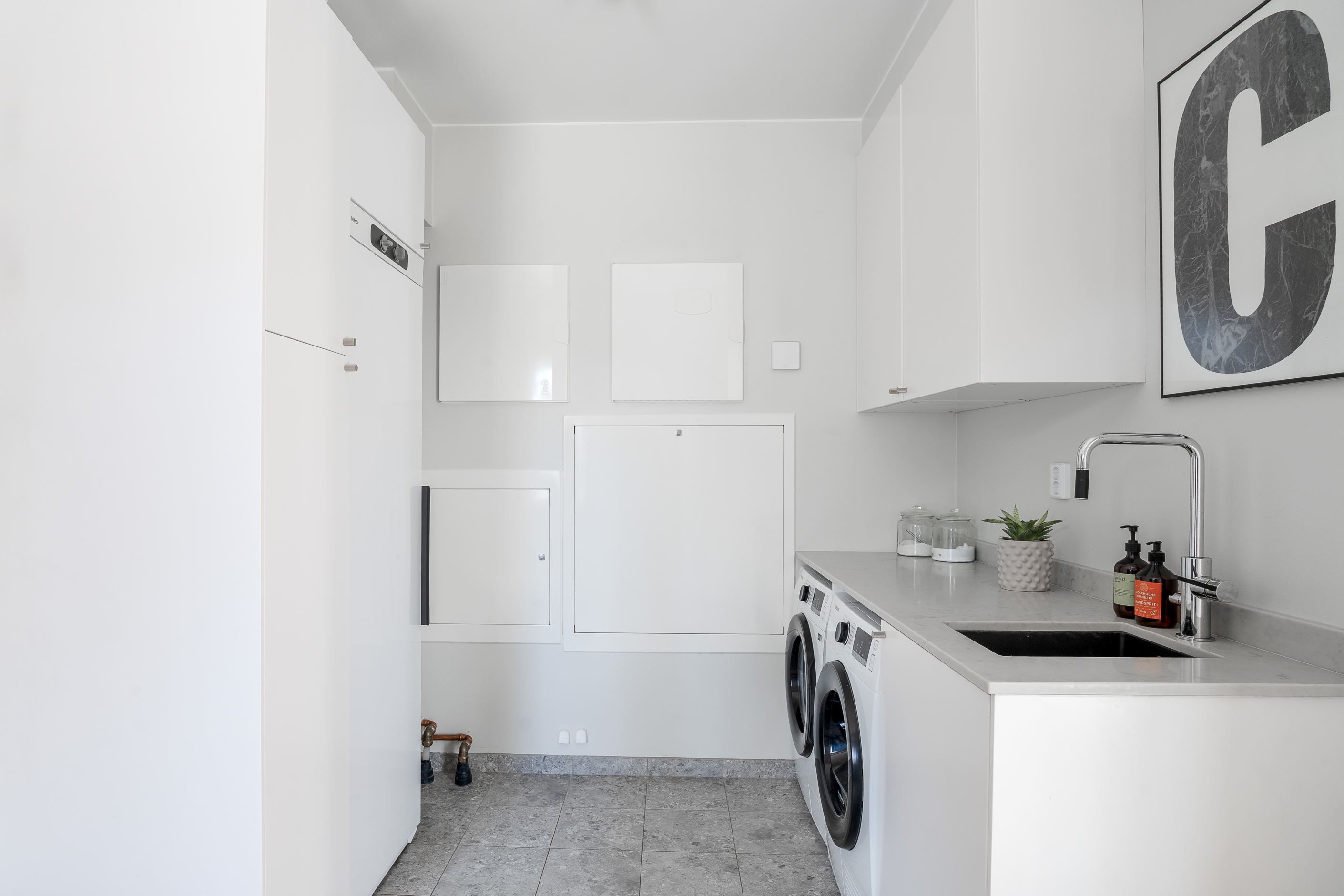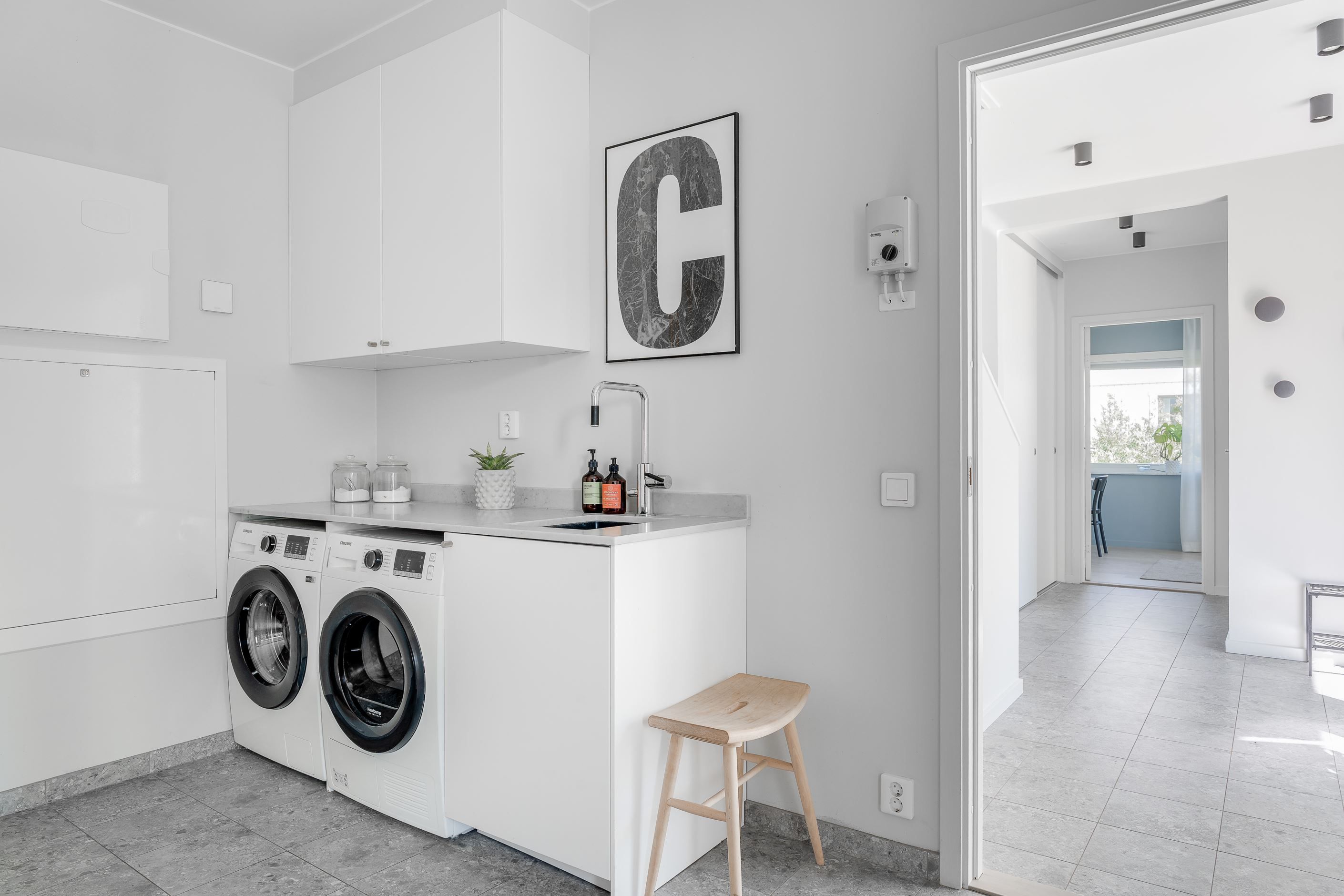 Det stora badrummet är en riktig spa-oas med både badkar, dusch och dubbla handfat – perfekt för vardagslyx och familjeliv. Tvättstugan är lika genomtänkt med stenbänkskiva och goda förvaringsmöjligheter samt groventré som underlättar vardagen.