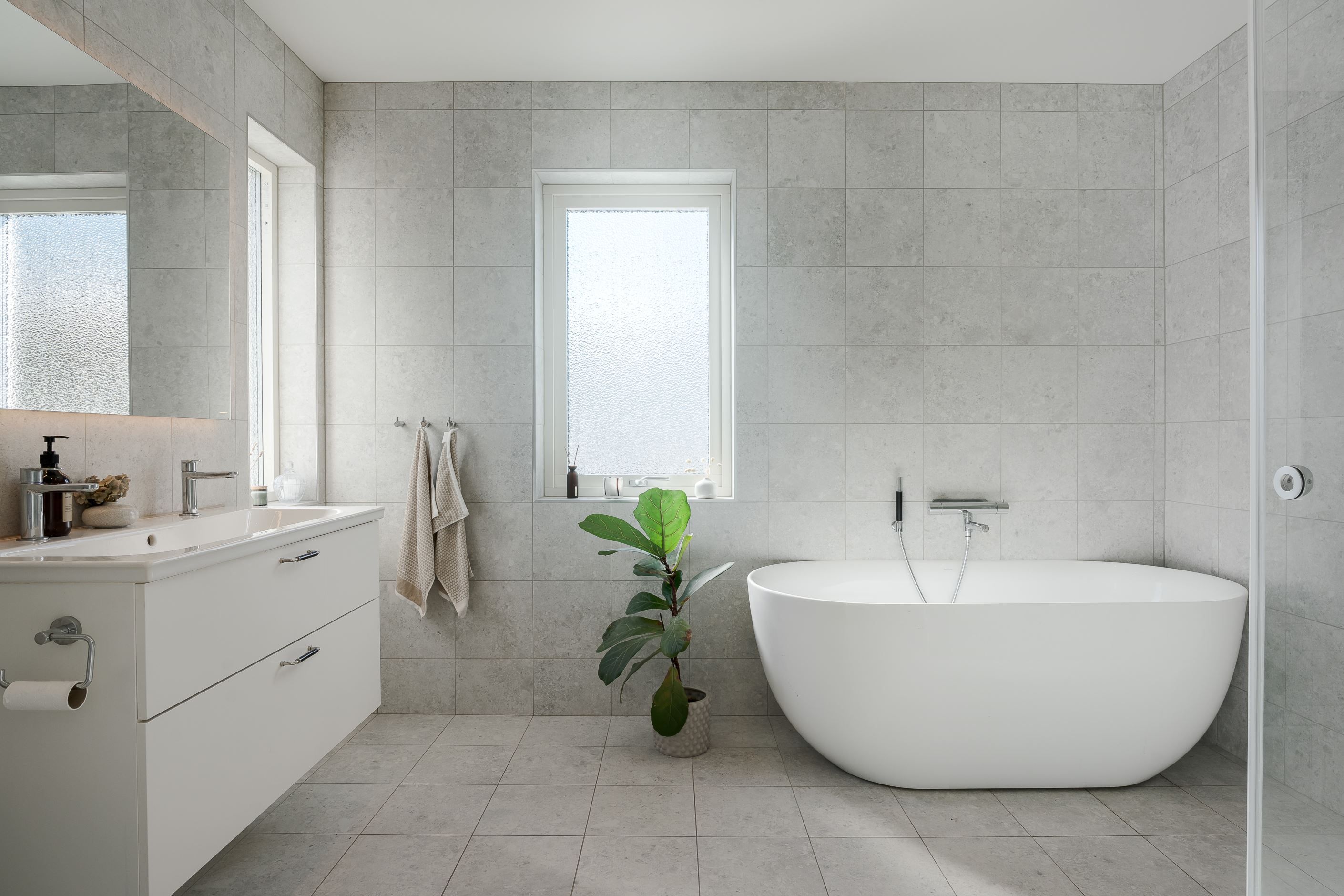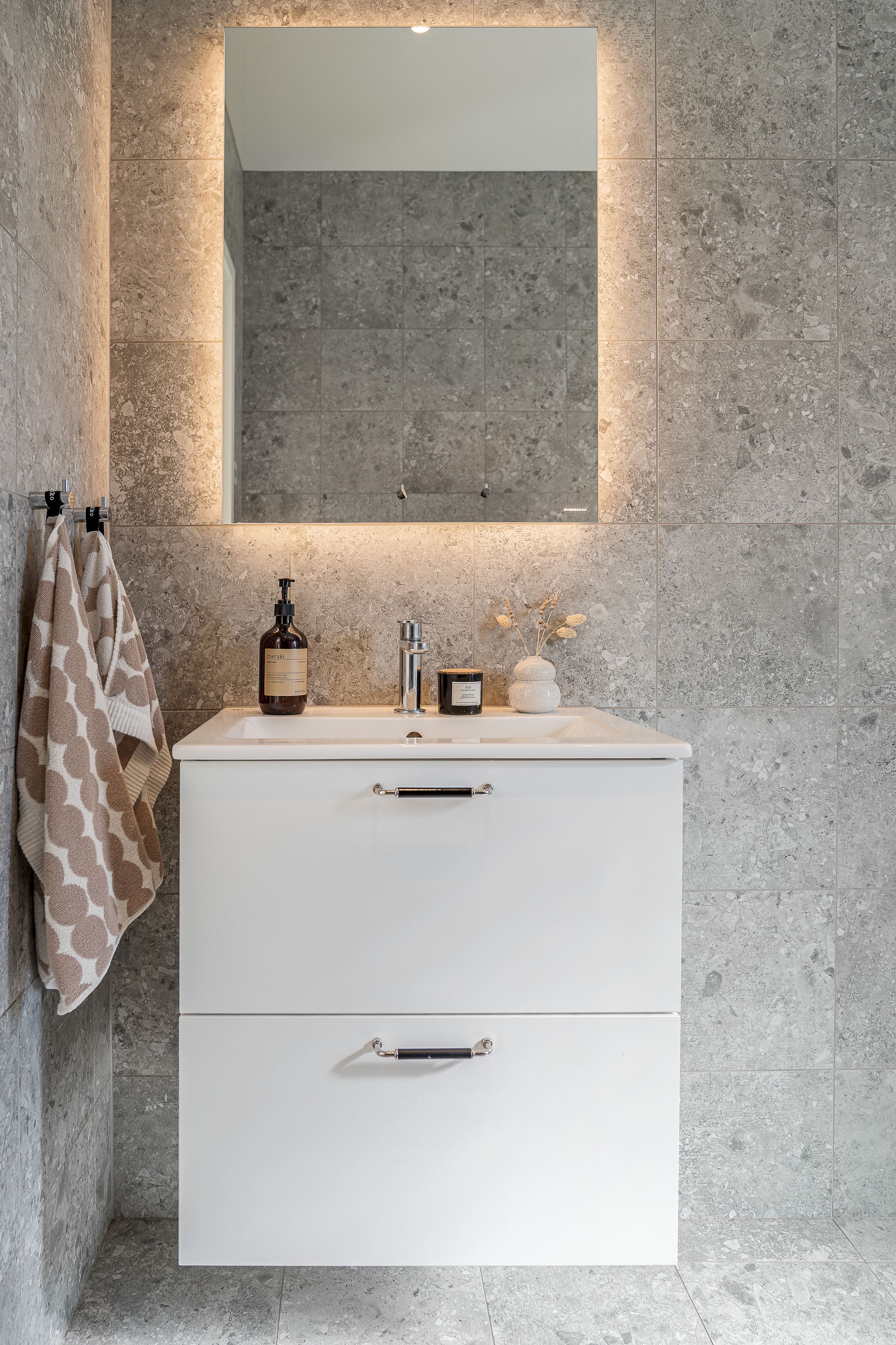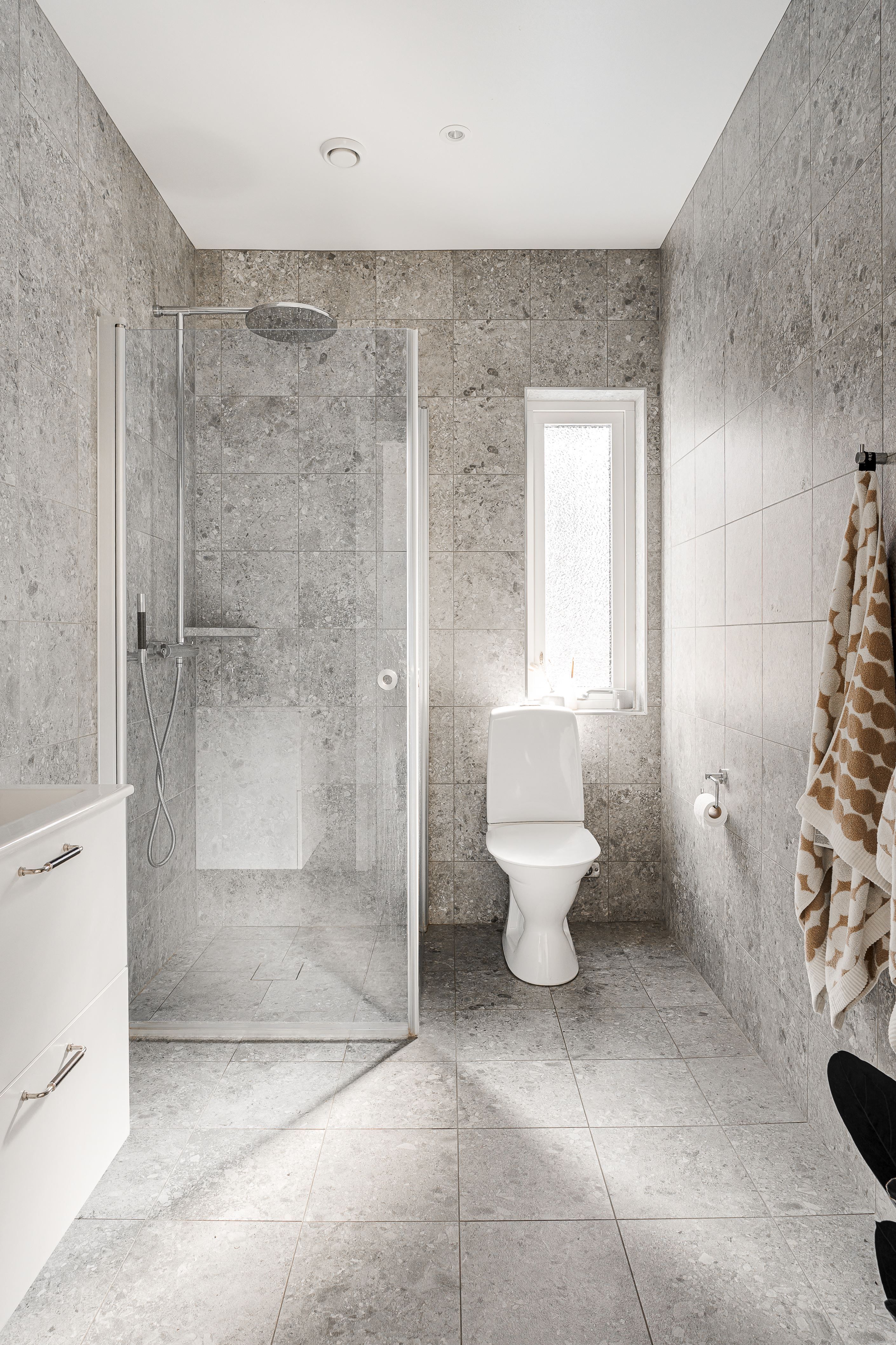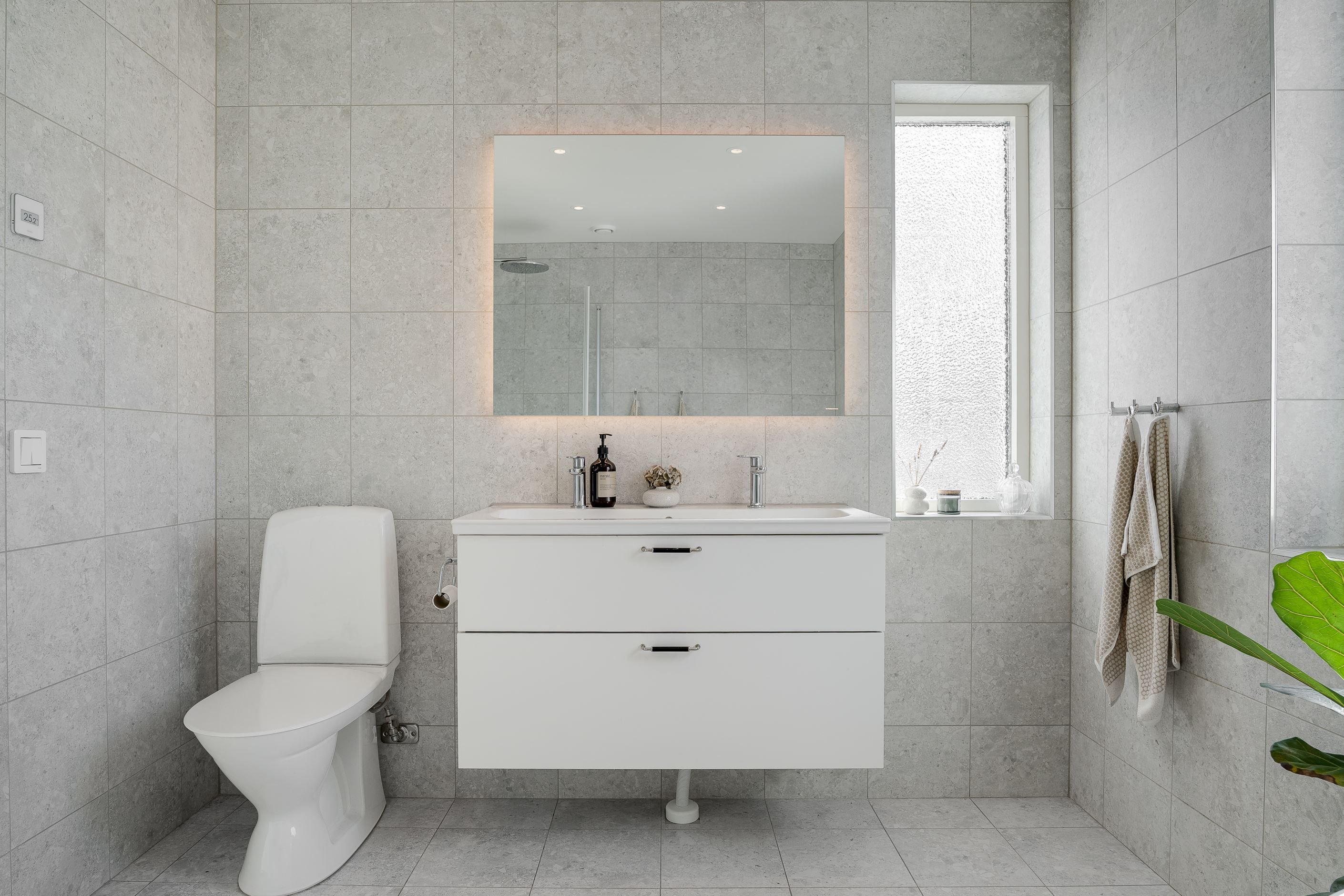 Det stora badrummet är en riktig spa-oas med både badkar, dusch och dubbla handfat – perfekt för vardagslyx och familjeliv. Tvättstugan är lika genomtänkt med stenbänkskiva och goda förvaringsmöjligheter samt groventré som underlättar vardagen.