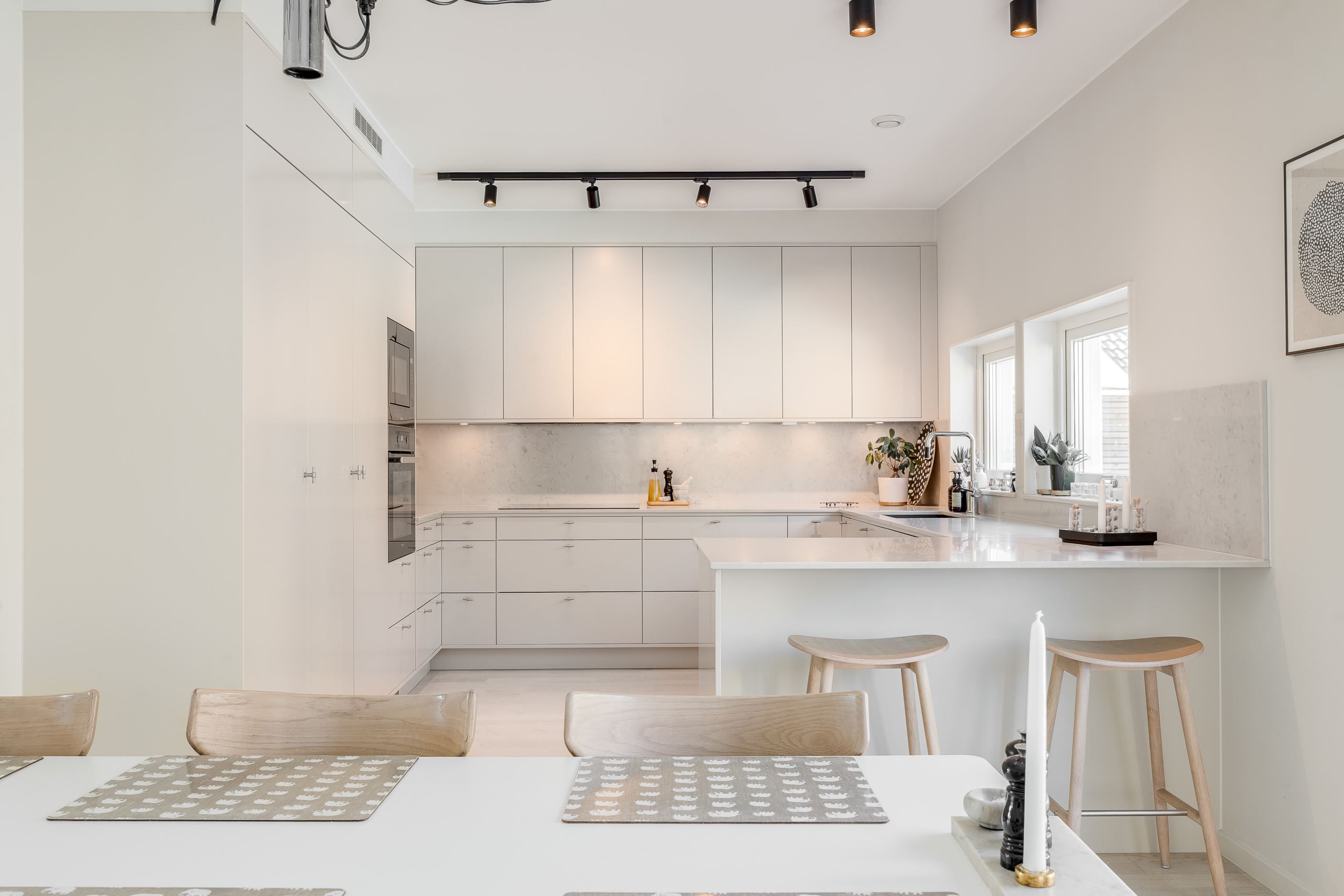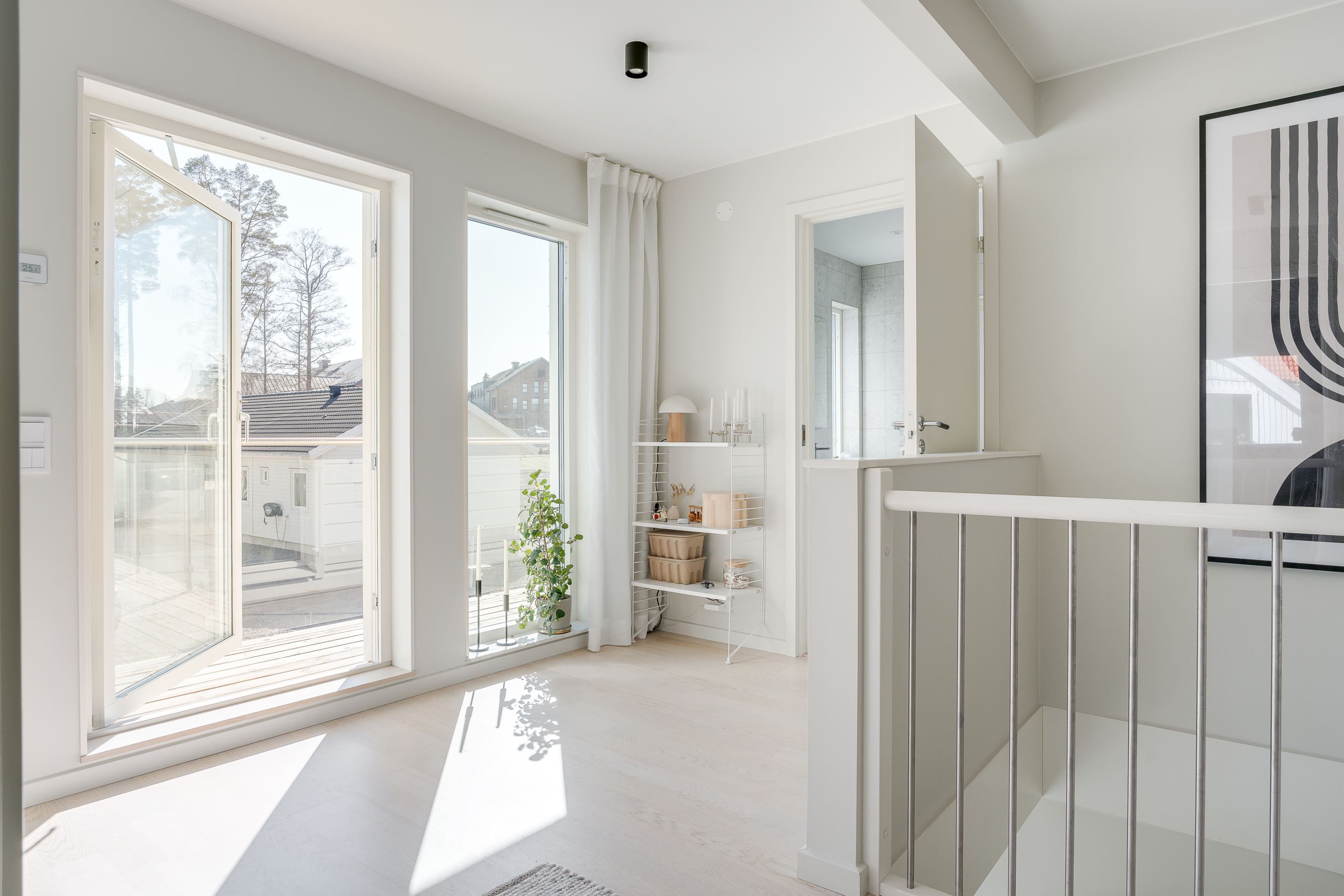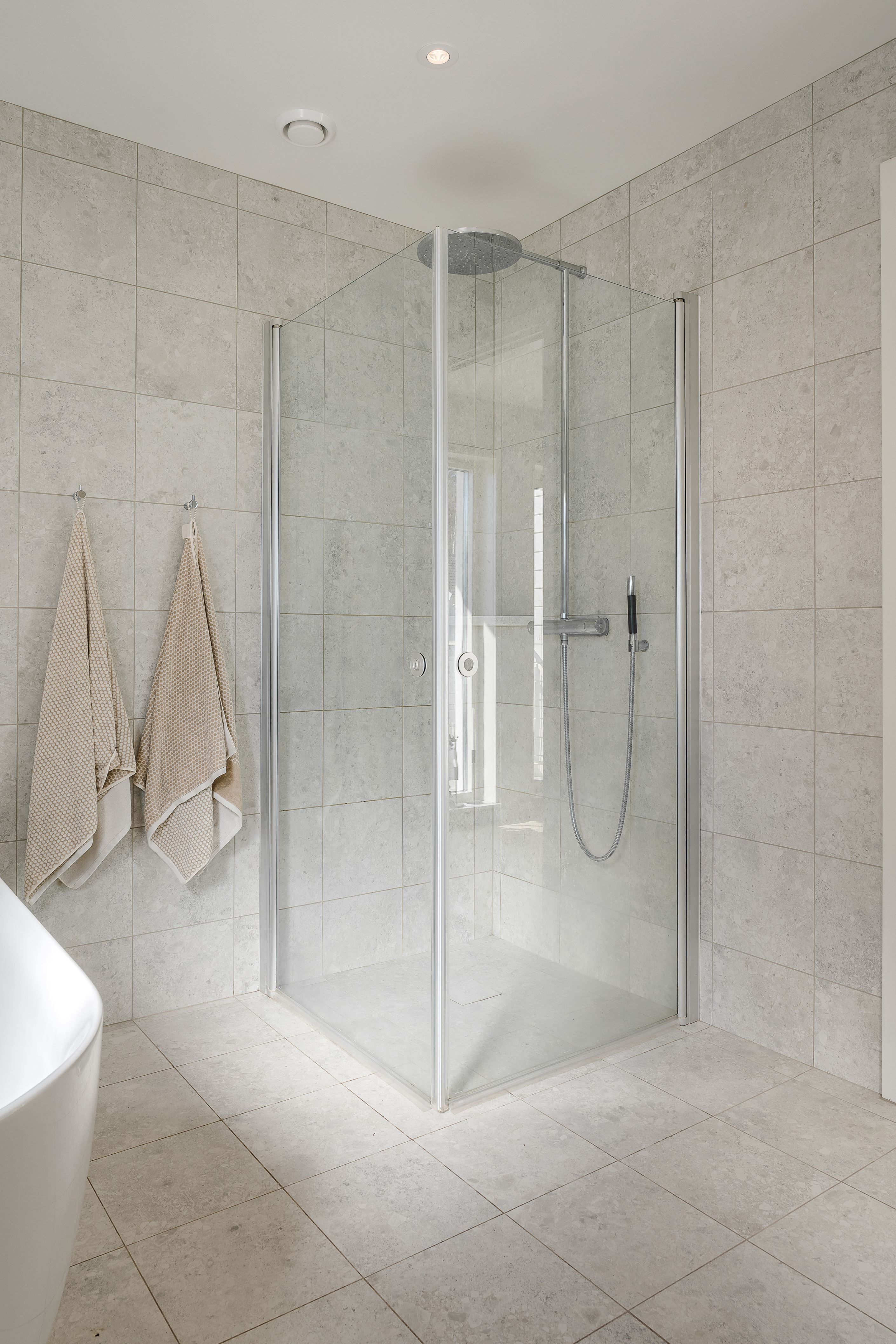 Köket från Vedum är en naturlig samlingspunkt i hemmet, med exklusiv stenbänkskiva i kvartskomposit samt matchande väggplatta. Genomgående återfinns detaljer som Tapwell blandare och spotlights vid garderober som förstärker den genomtänkta helheten. Den vattenburna golvvärmen i båda plan ger en behaglig komfort året runt.