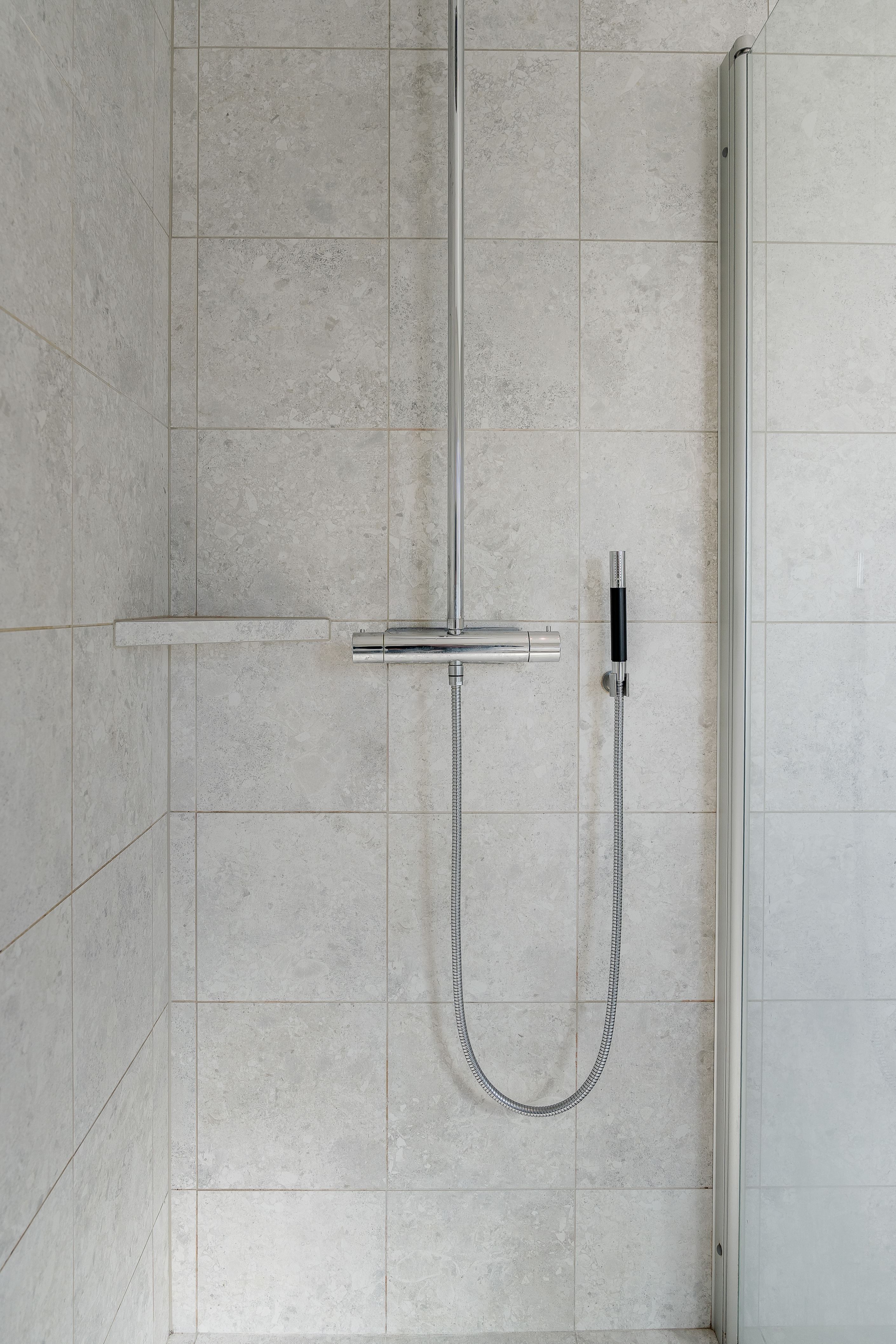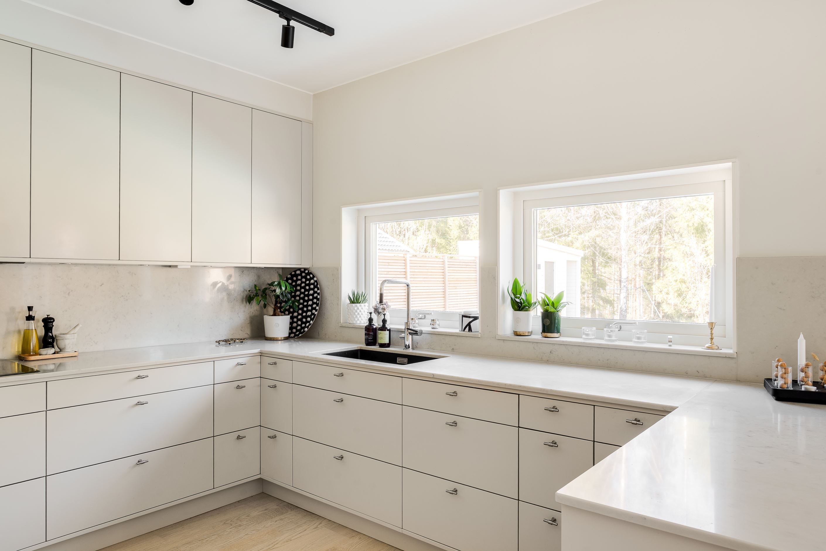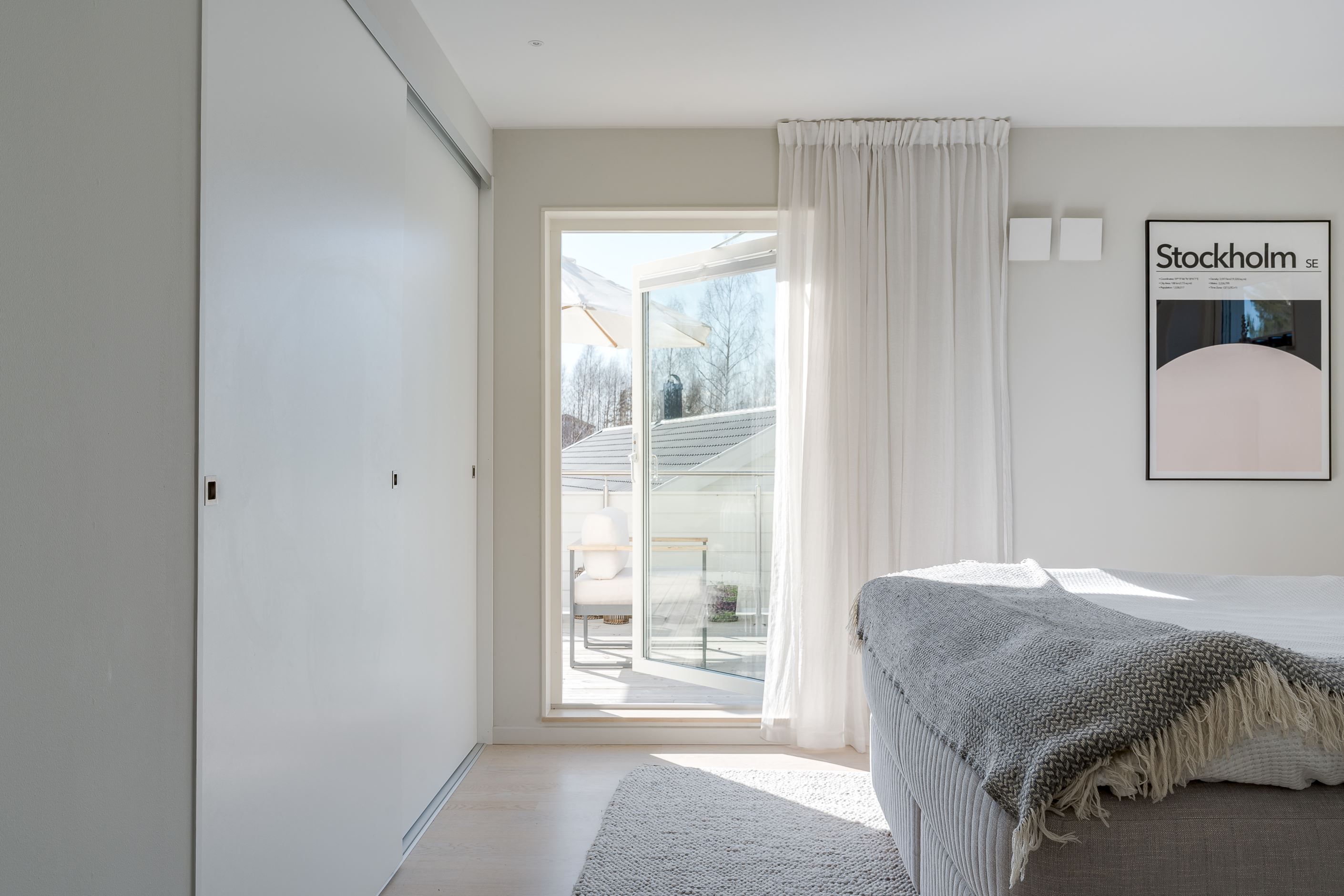 Köket från Vedum är en naturlig samlingspunkt i hemmet, med exklusiv stenbänkskiva i kvartskomposit samt matchande väggplatta. Genomgående återfinns detaljer som Tapwell blandare och spotlights vid garderober som förstärker den genomtänkta helheten. Den vattenburna golvvärmen i båda plan ger en behaglig komfort året runt.