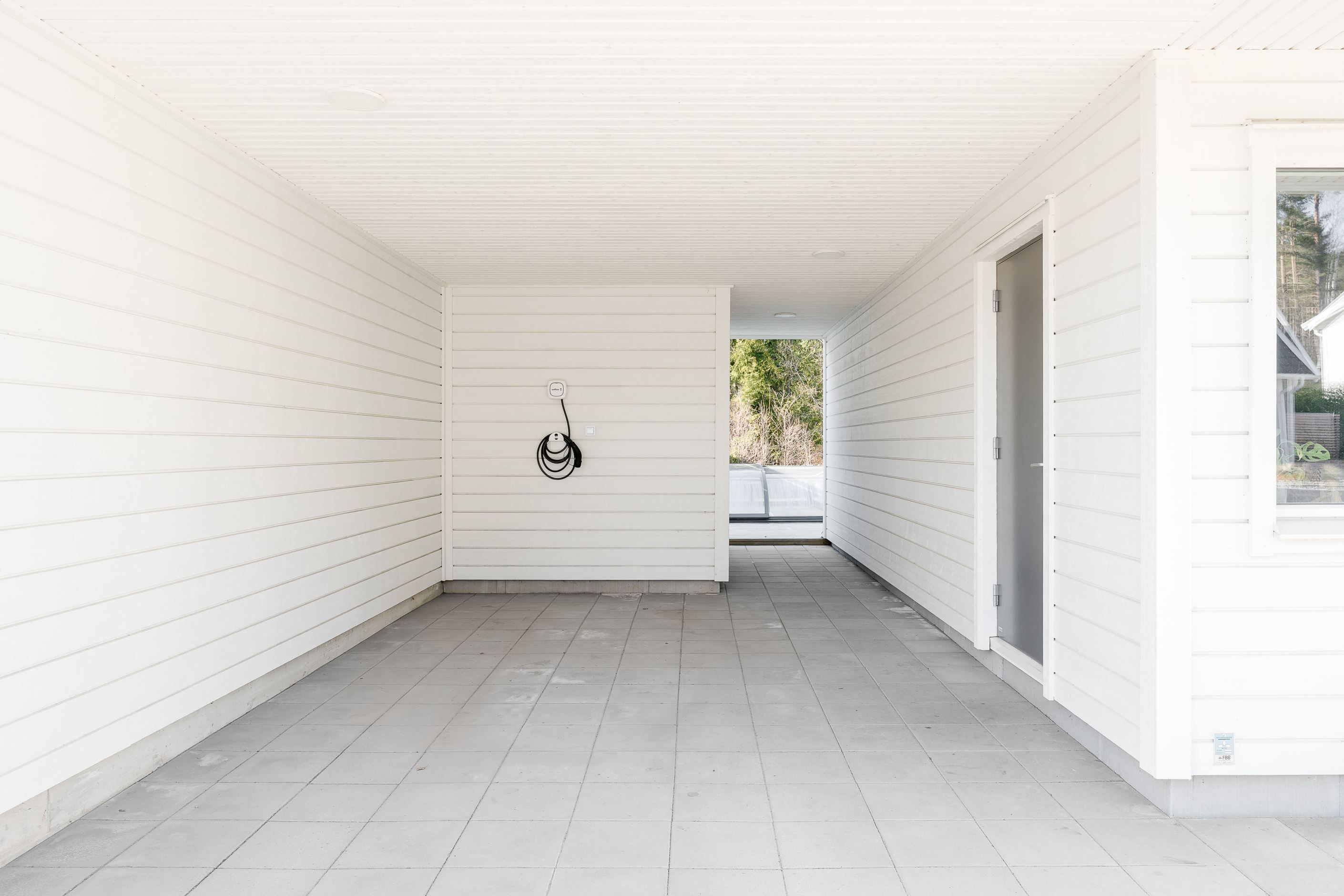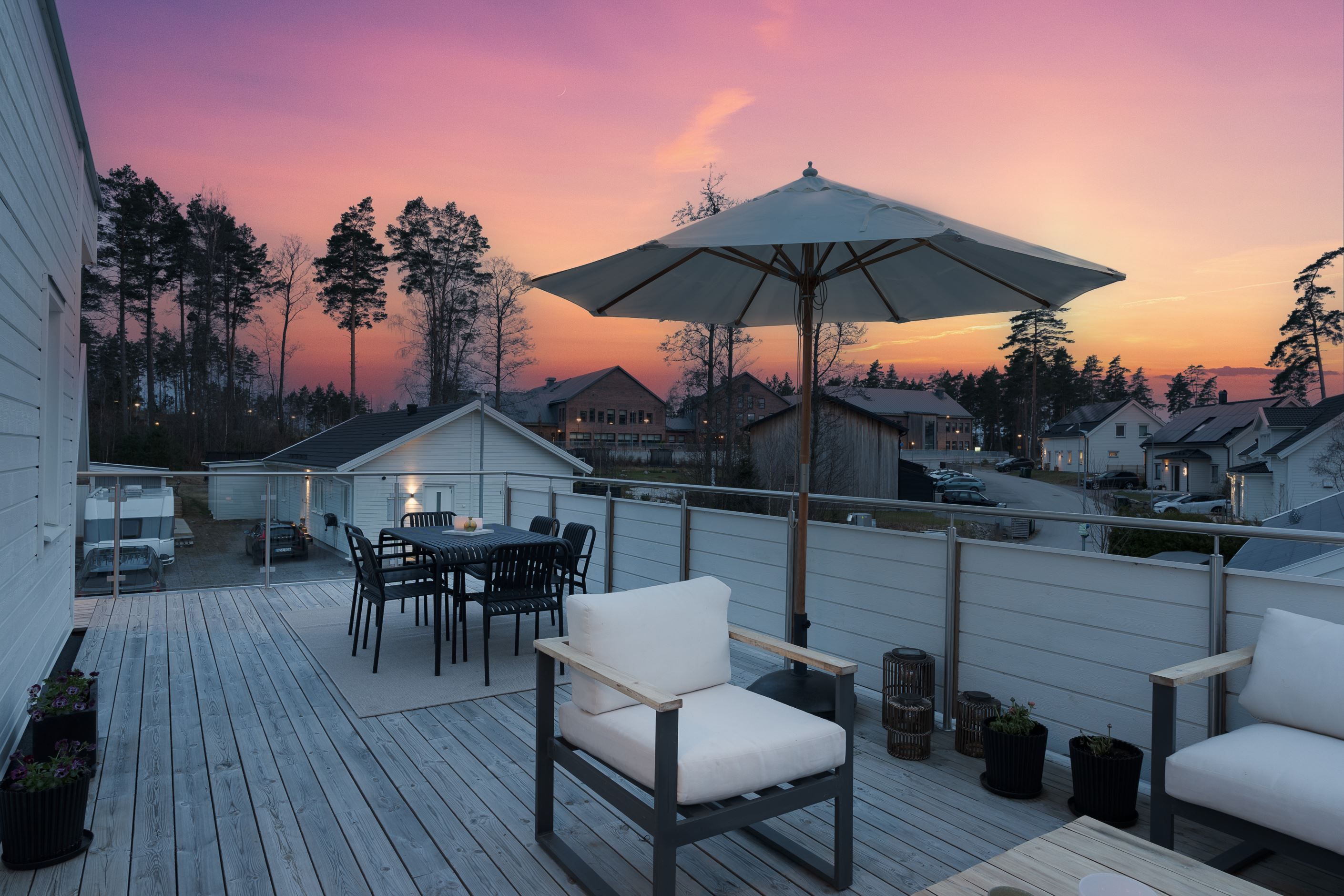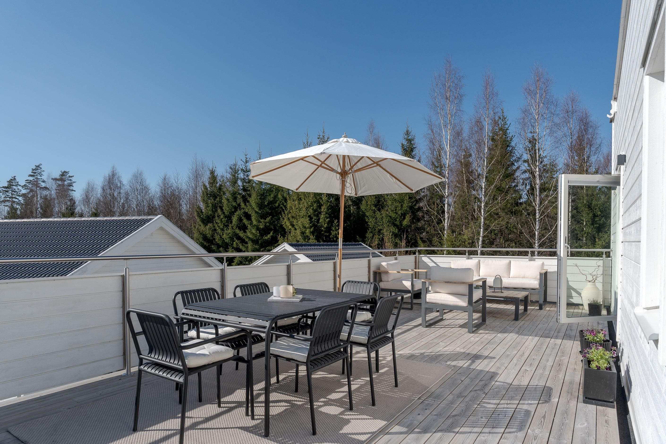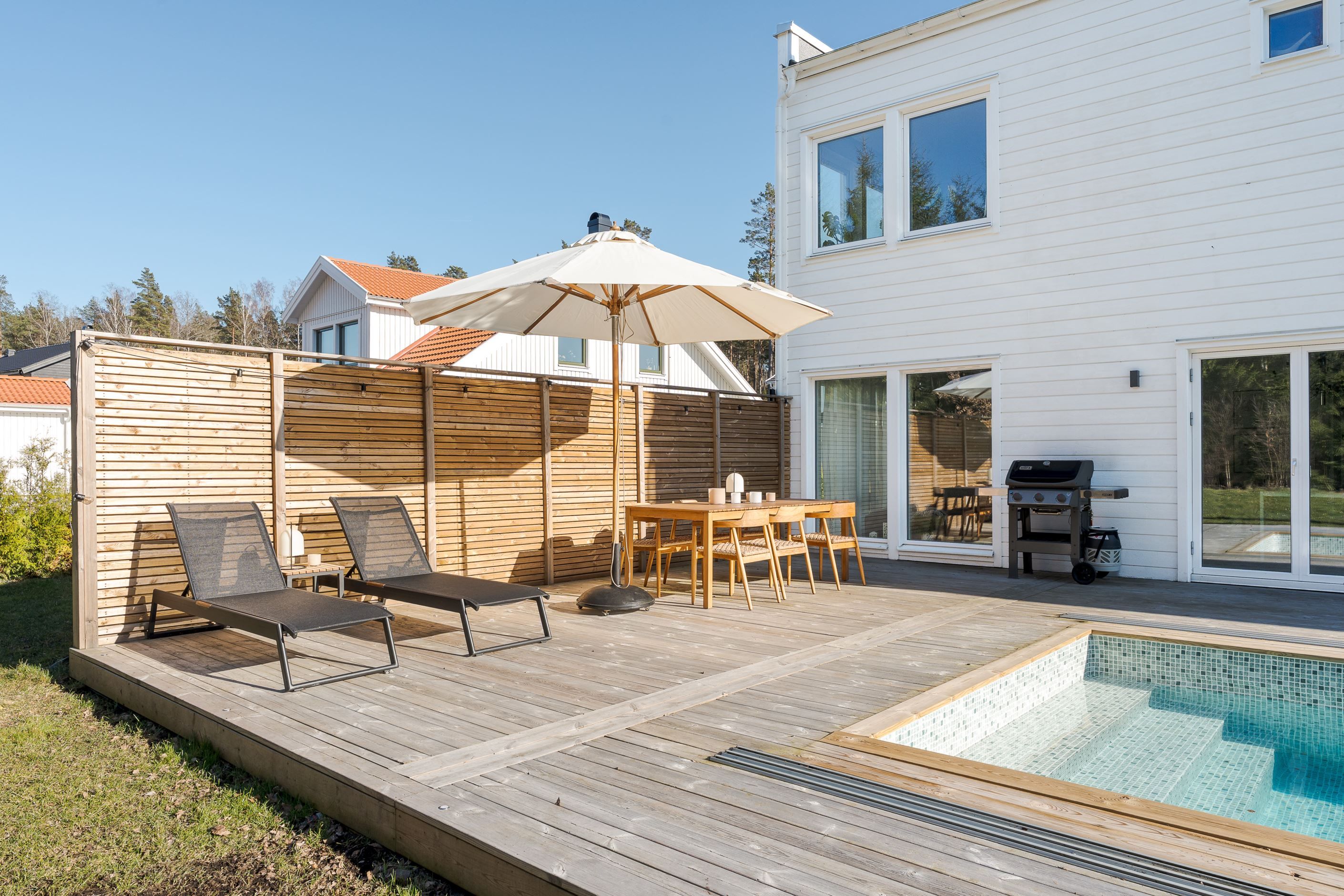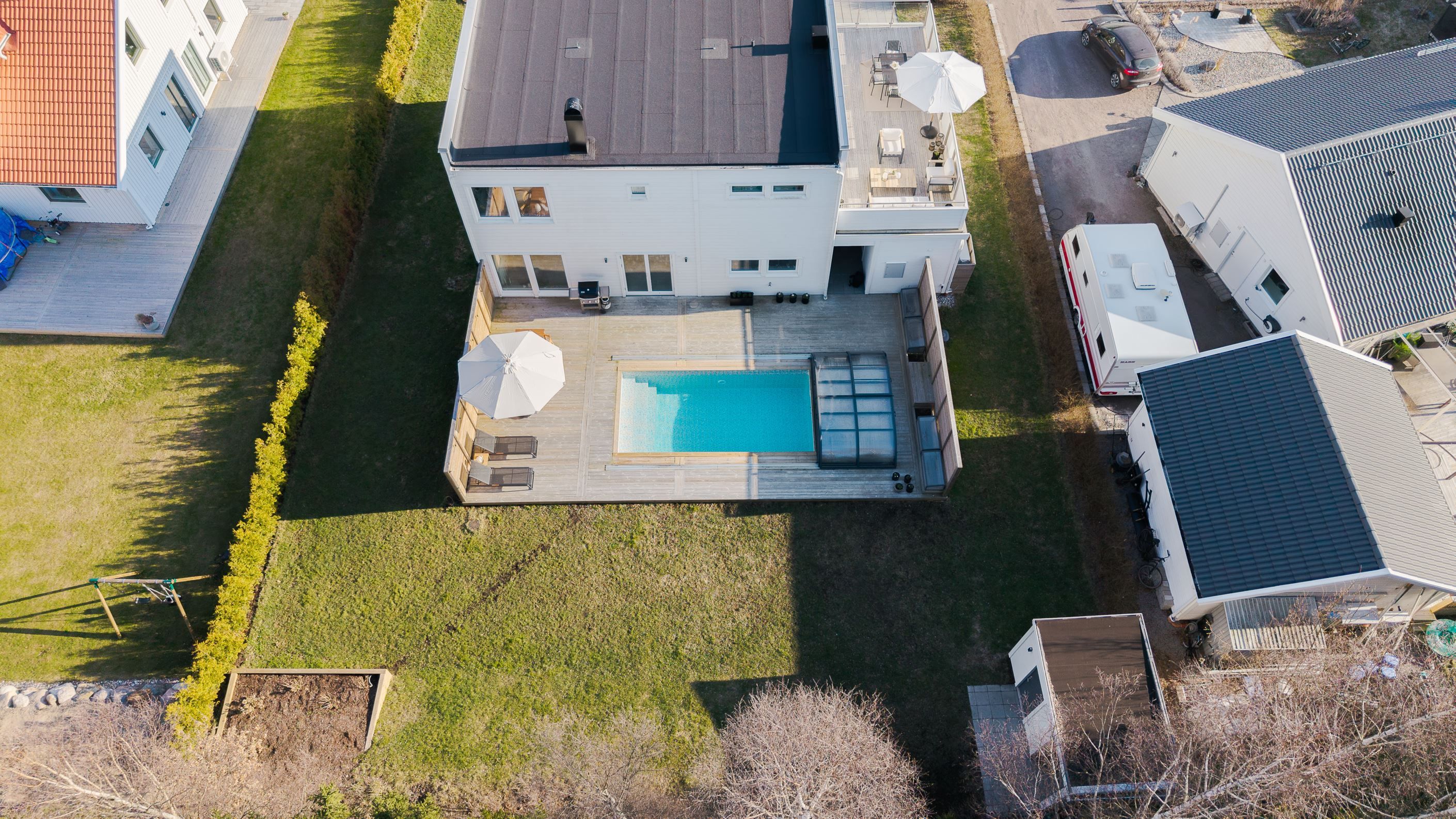Utomhus väntar en insynsskyddad tomt med skogen som närmaste granne, där naturen skapar en rogivande inramning. Här finns en pool från Folkpool (6x3 m, 150 cm djup) som bjuder in till härliga sommardagar, omgiven av ett generöst altandäck om ca 100 kvm samt tillhörande pooltillbehör smidigt förvarade i varmförråd. Därtill en generös terrass i sydvästläge om ca 43–45 kvm – perfekt för sol från eftermiddag till kväll.