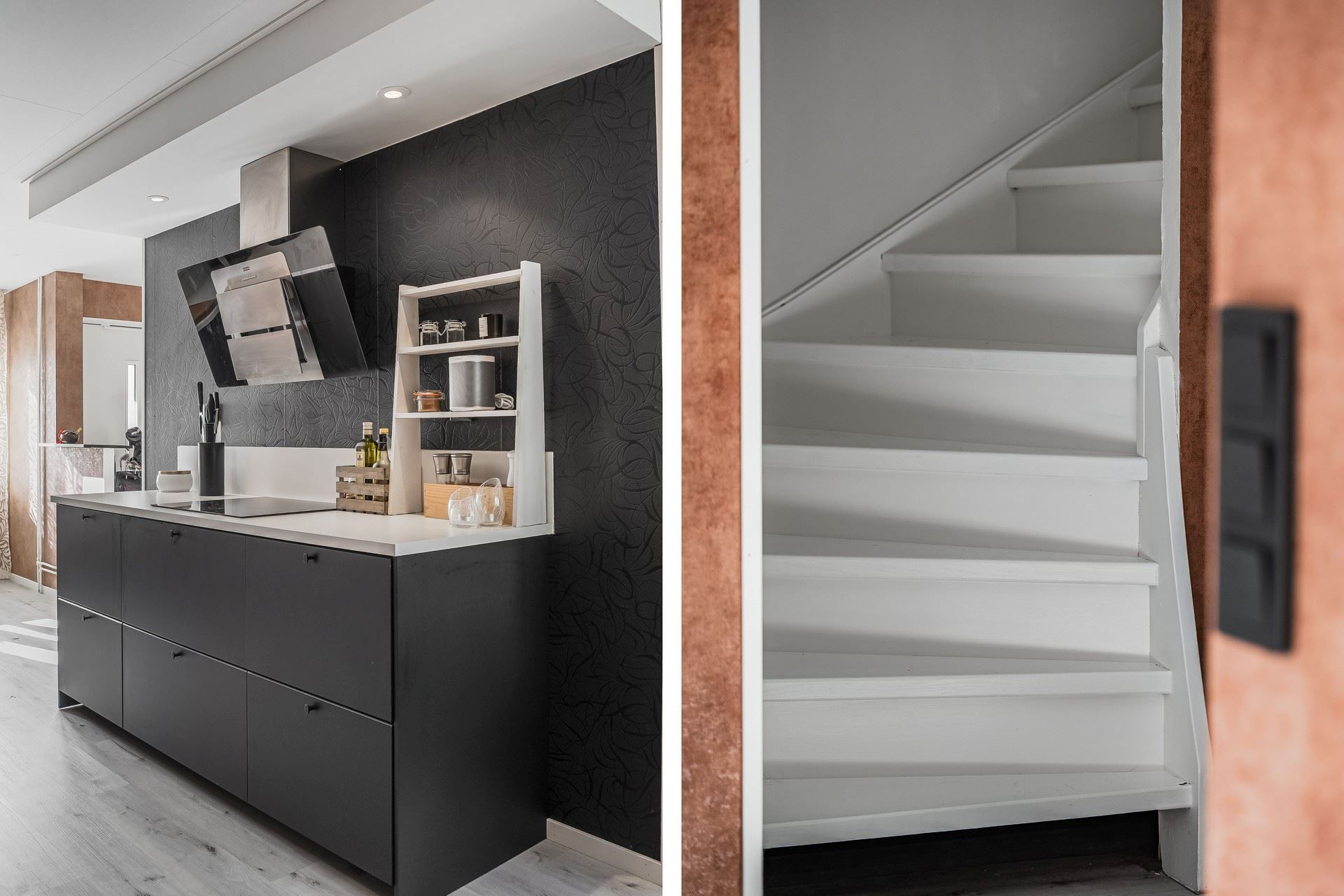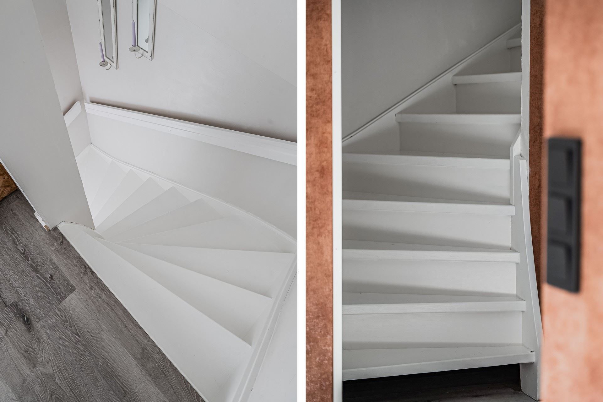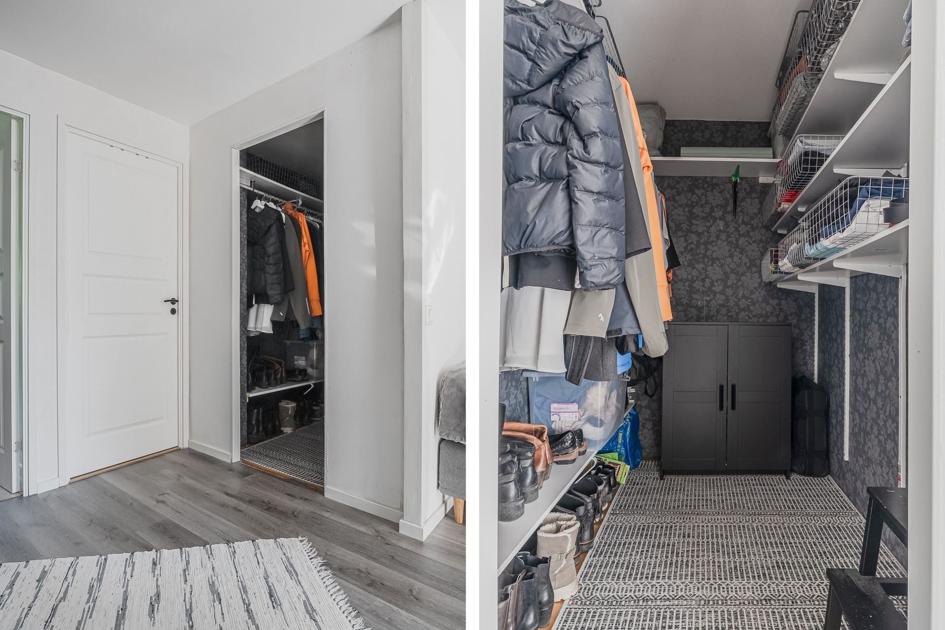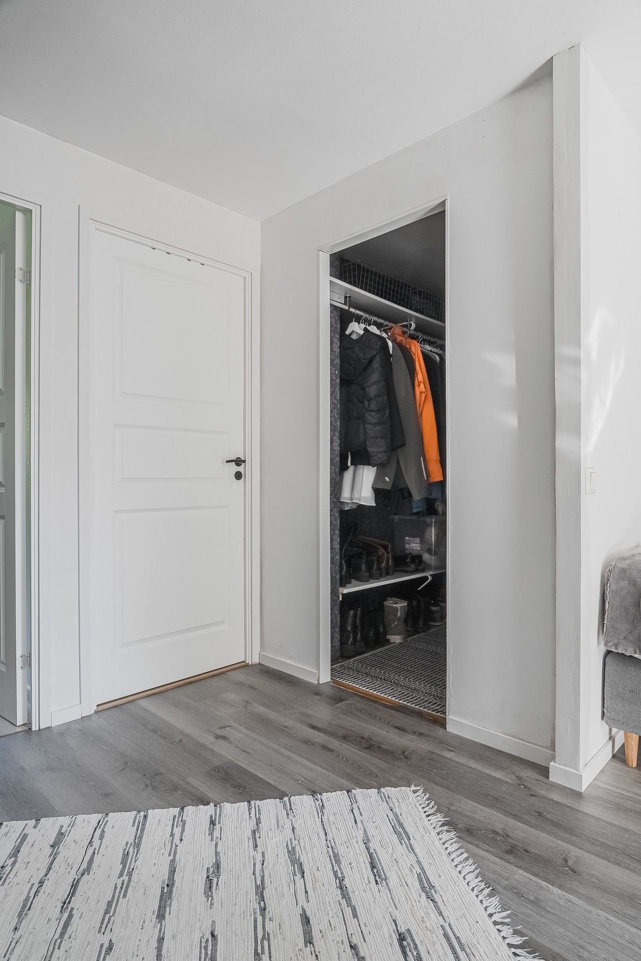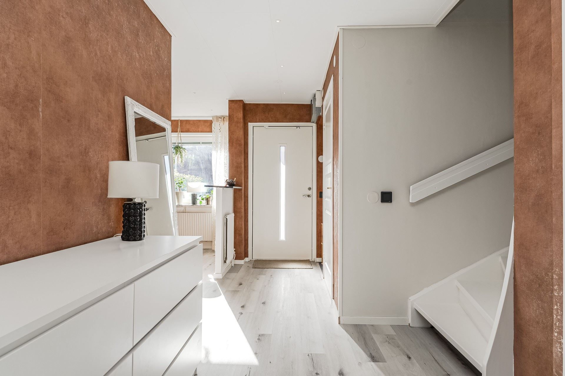 På entréplanet möts du av det renoverade köket som ligger i öppen planlösning mot det generösa allrummet – en perfekt samlingsplats för både vardag och fest. Här finns också ett av bostadens två badrum samt utgång till uteplatsen som vetter mot baksidan.