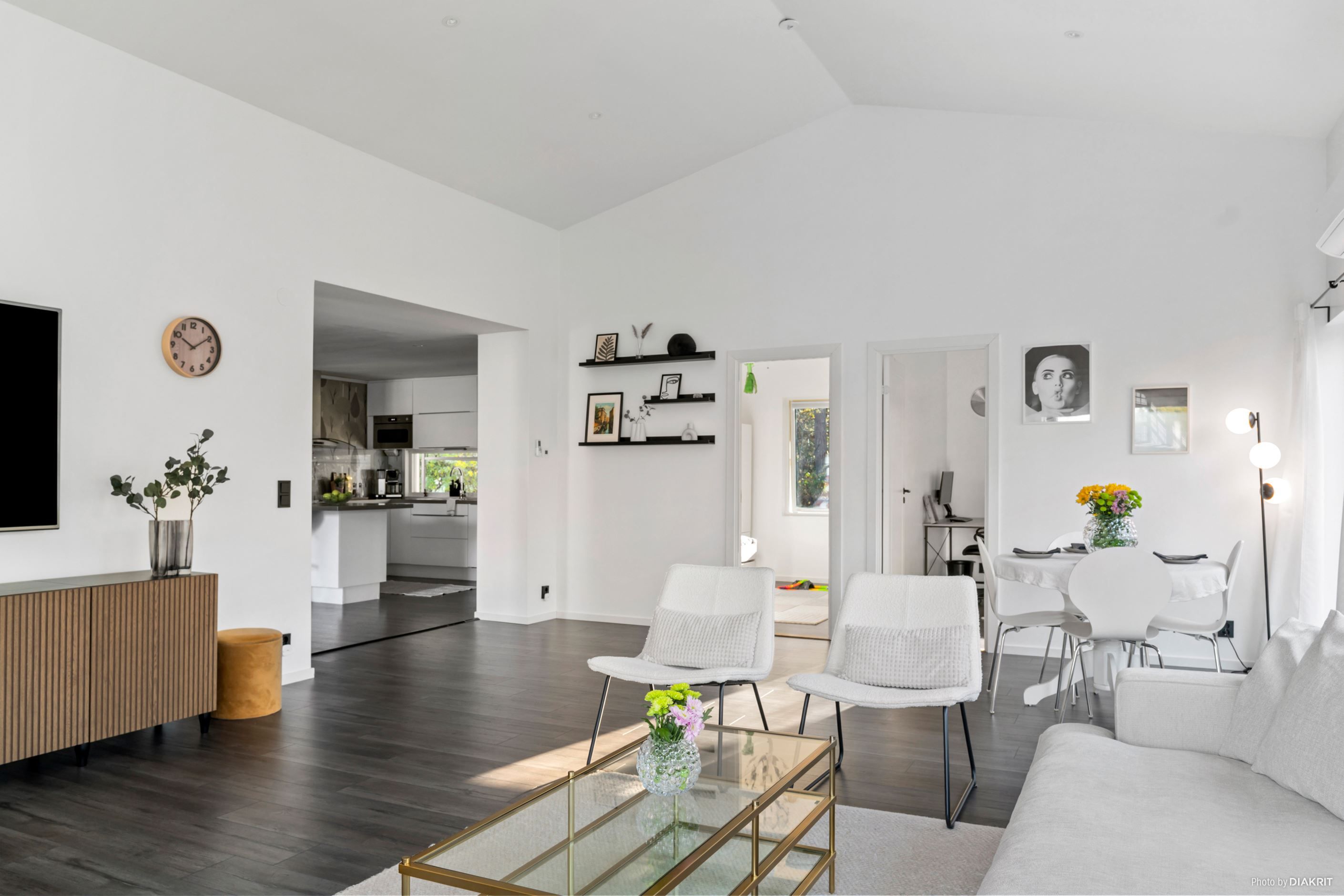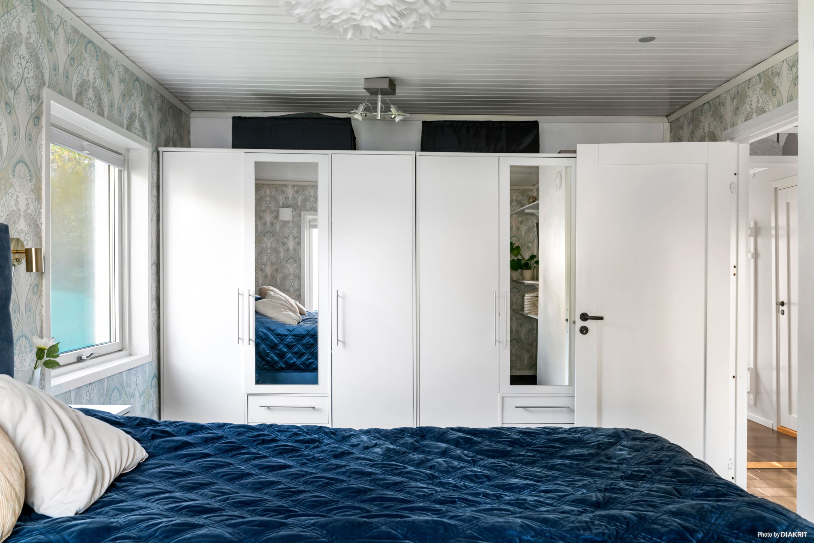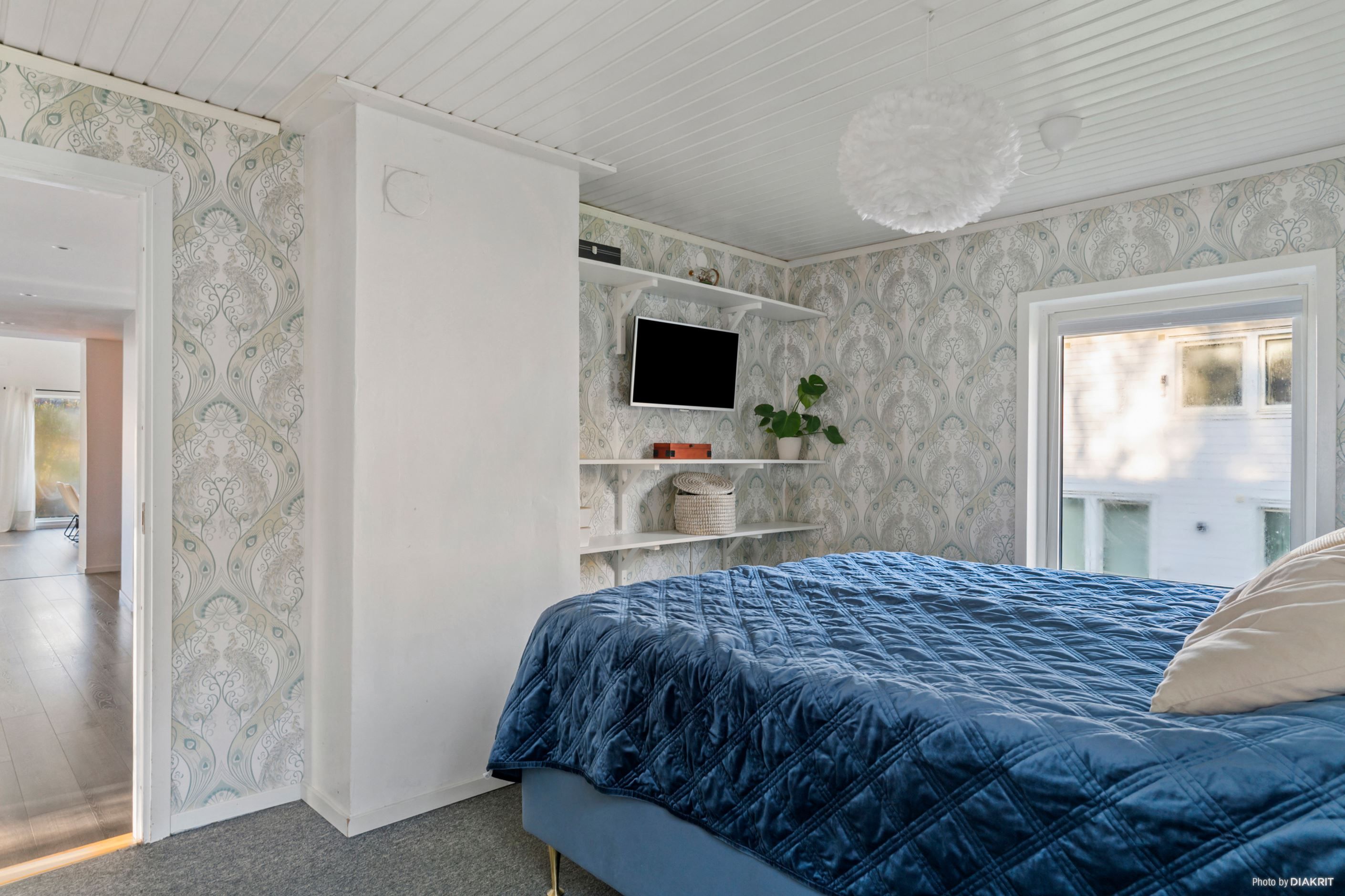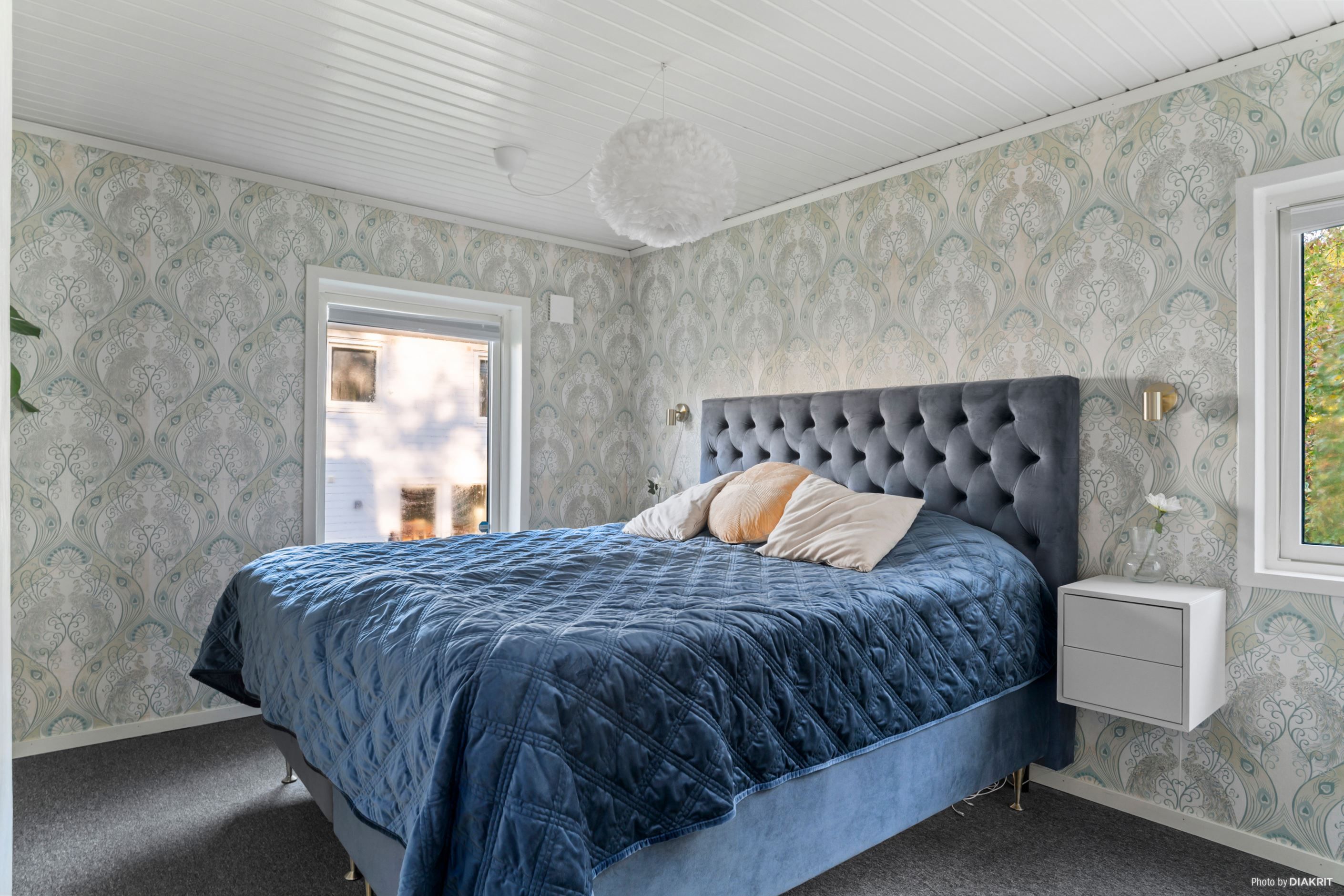Vidare finner du ett rymligt sovrum med garderobsvägg, en klädkammare samt ett helkaklat badrum i tidlösa färger från 2012. Från denna del av huset nås även den insynsskyddade baksidan med en mysig uteplats – perfekt för avkoppling och umgänge.