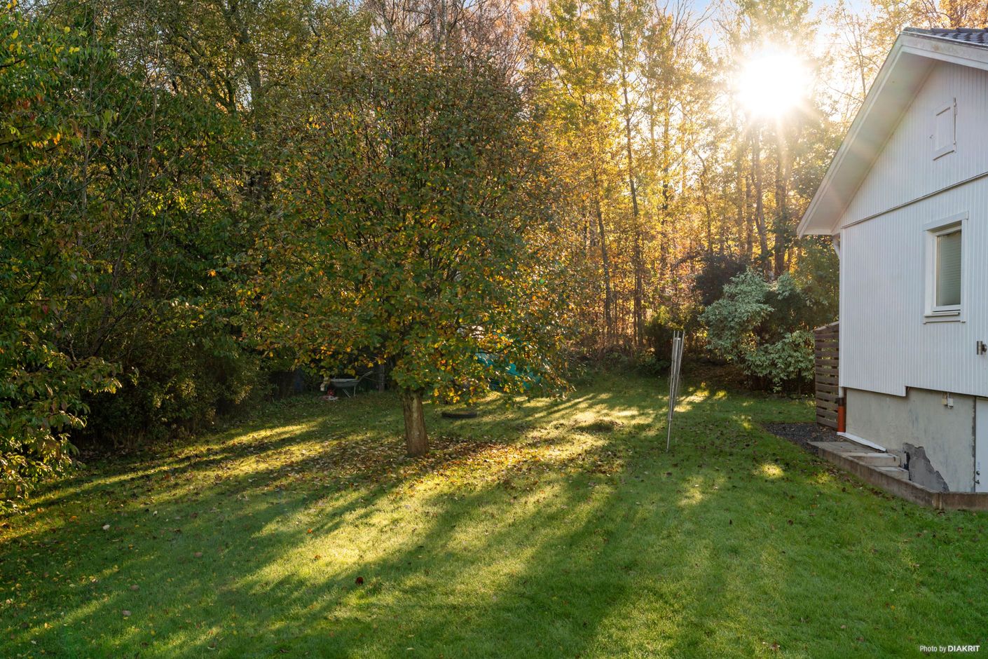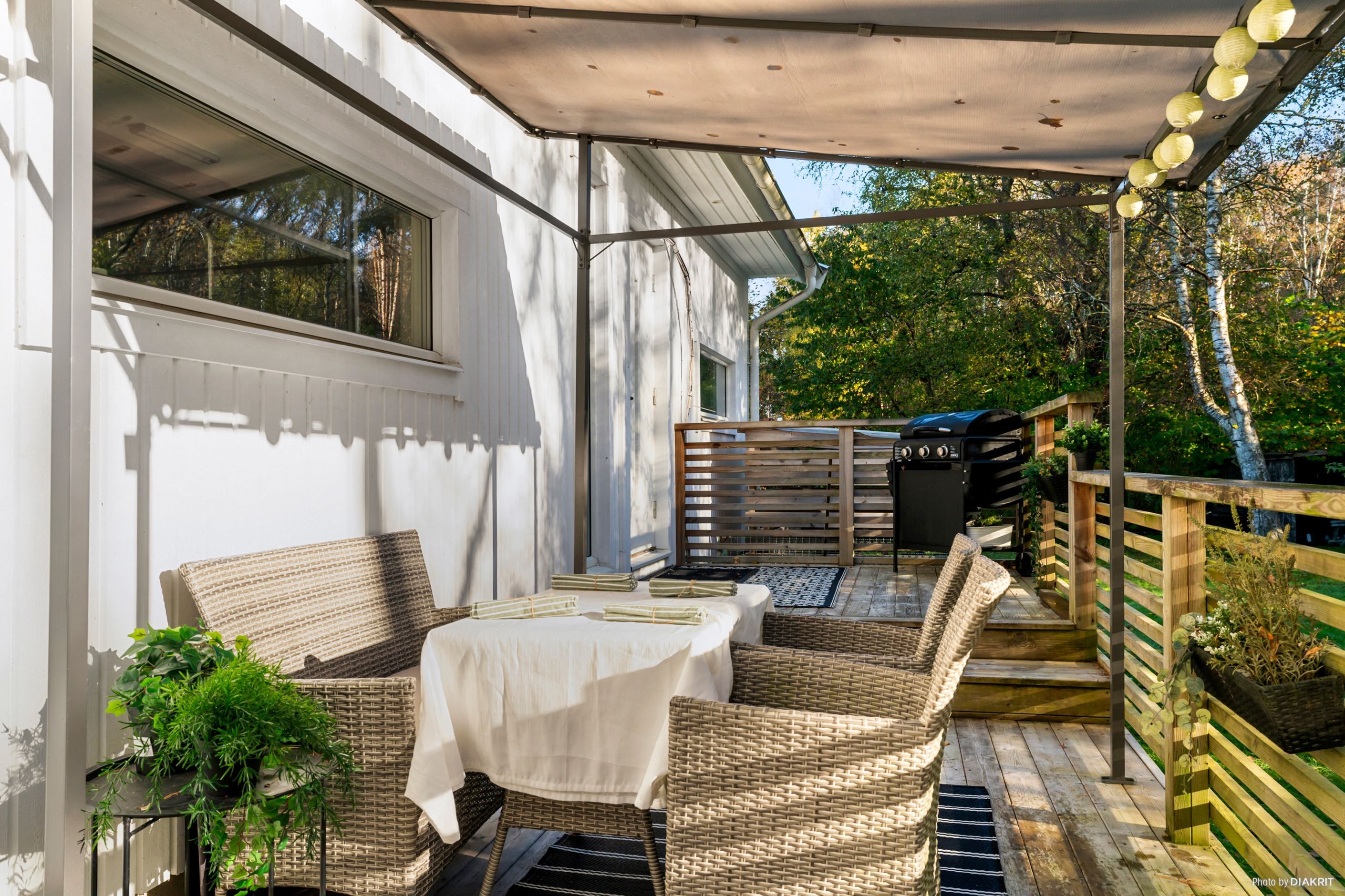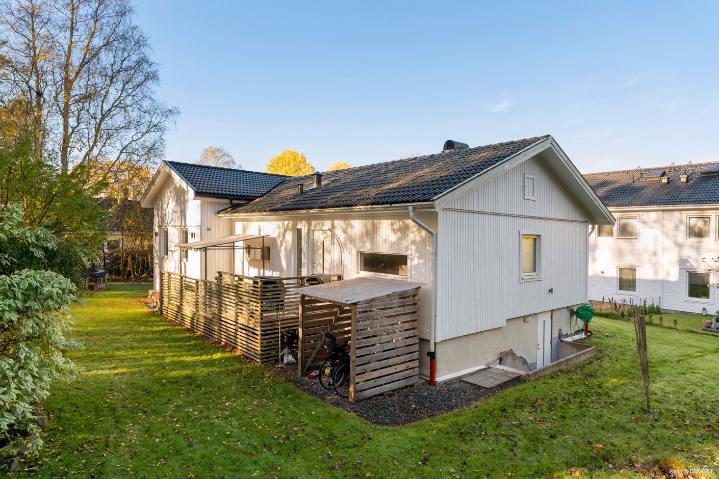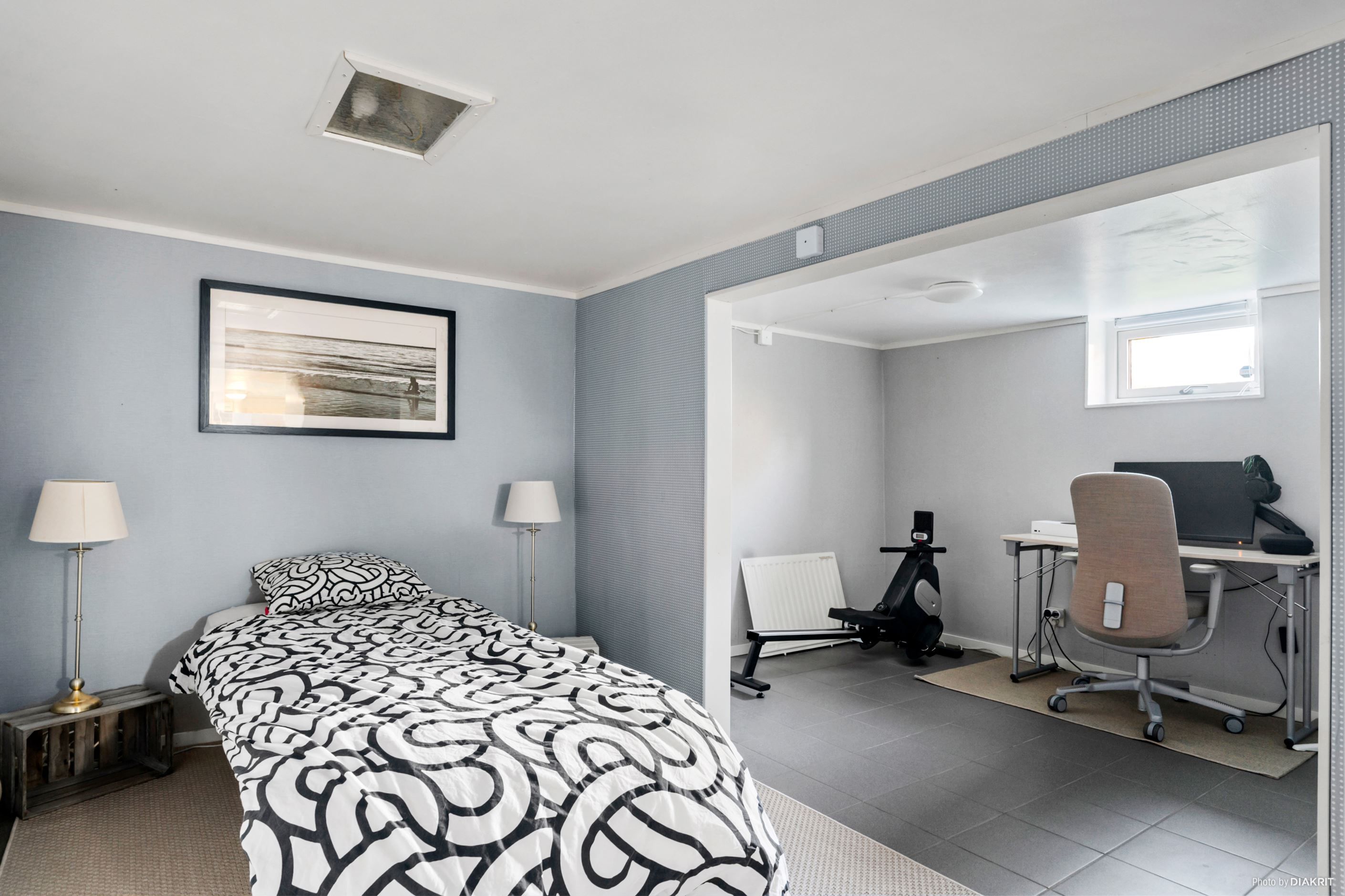 Vidare finner du ett rymligt sovrum med garderobsvägg, en klädkammare samt ett helkaklat badrum i tidlösa färger från 2012. Från denna del av huset nås även den insynsskyddade baksidan med en mysig uteplats – perfekt för avkoppling och umgänge.