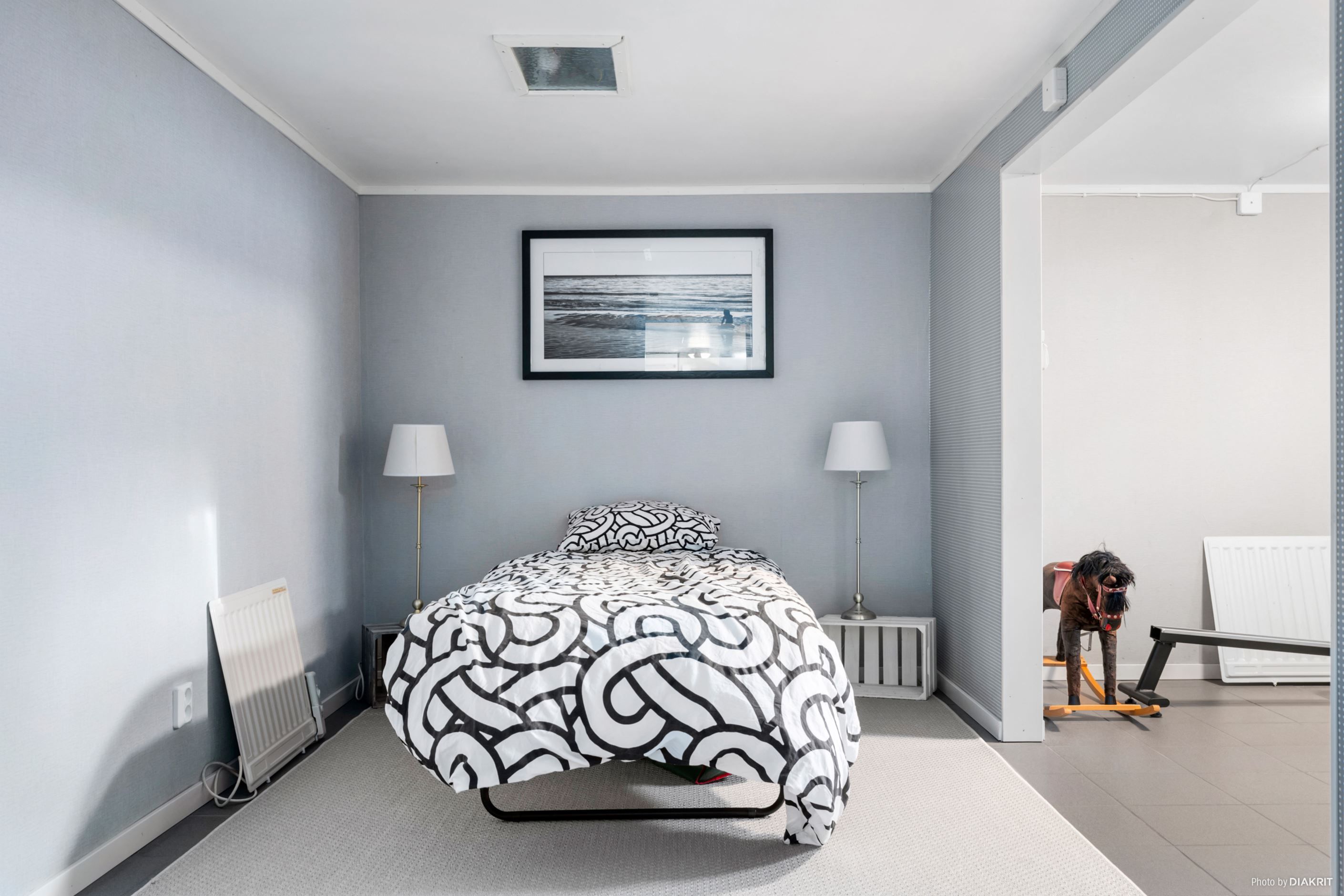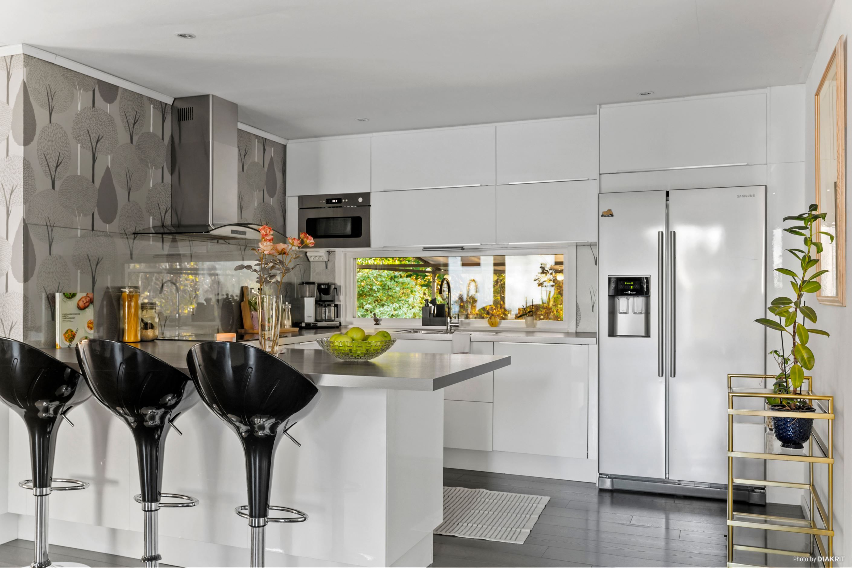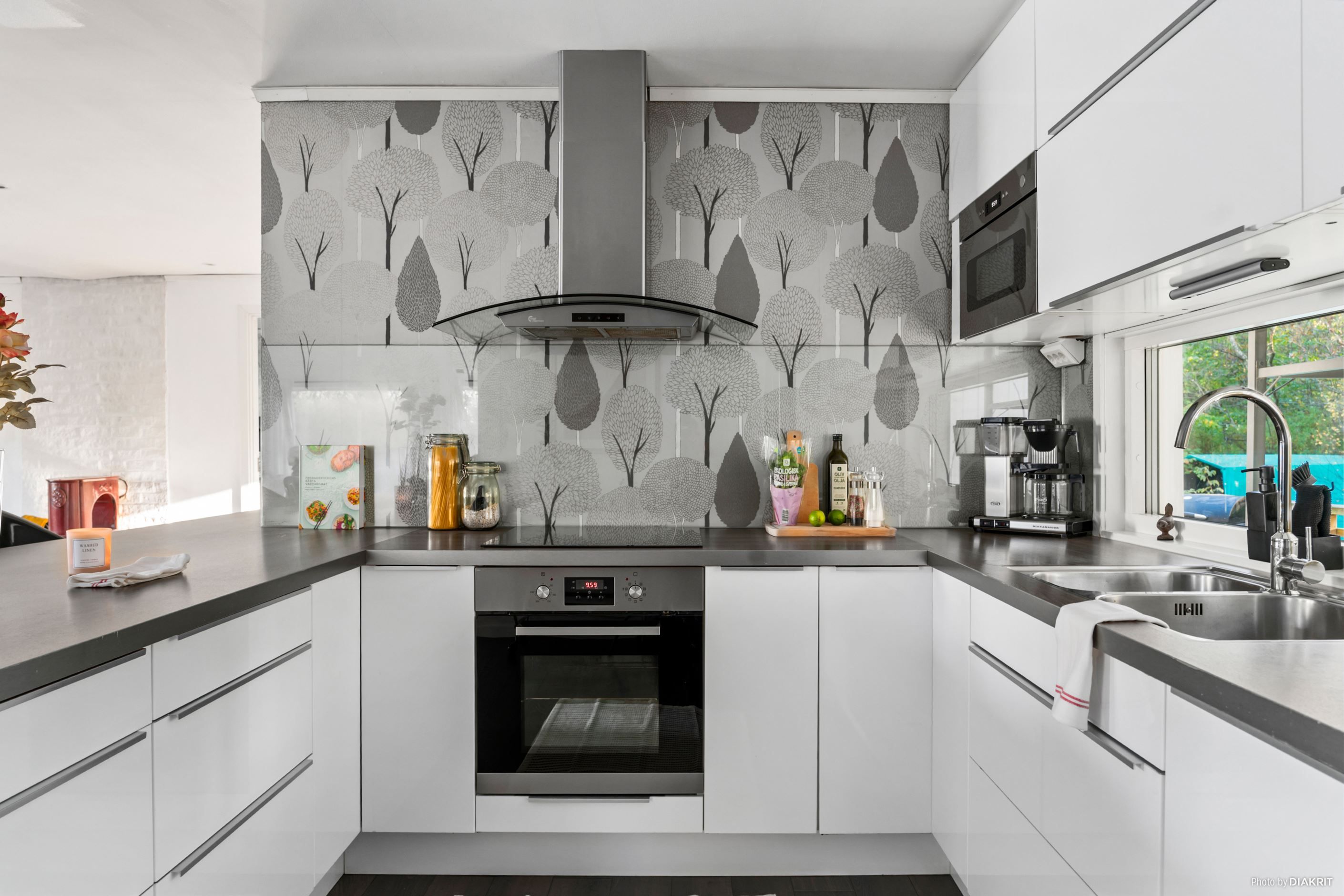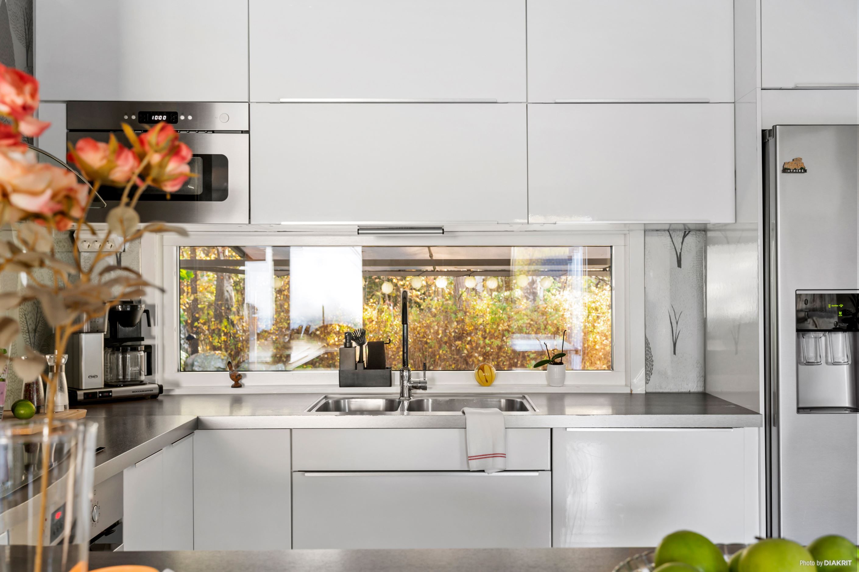 Vidare finner du ett rymligt sovrum med garderobsvägg, en klädkammare samt ett helkaklat badrum i tidlösa färger från 2012. Från denna del av huset nås även den insynsskyddade baksidan med en mysig uteplats – perfekt för avkoppling och umgänge.