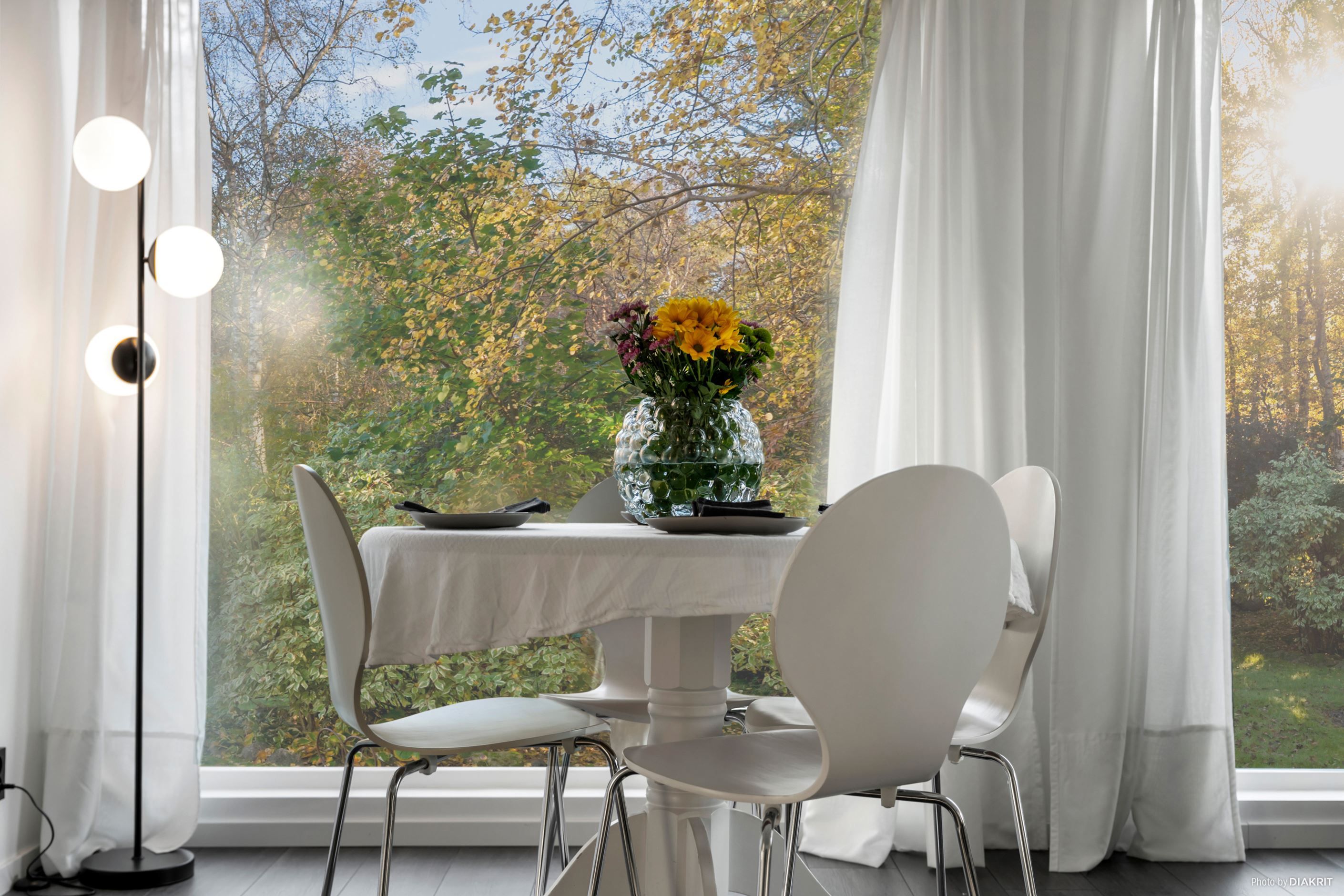 Till vänster om hallen fortsätter de sociala ytorna med en stor matplats framför fönster som släpper in rikligt med ljus. Här finns även en charmig gjutjärnskamin som bidrar till både värme och trivsel. I anslutning ligger köket i klassisk stil med vita luckor, laminatbänkskivor och rostfria vitvaror.
