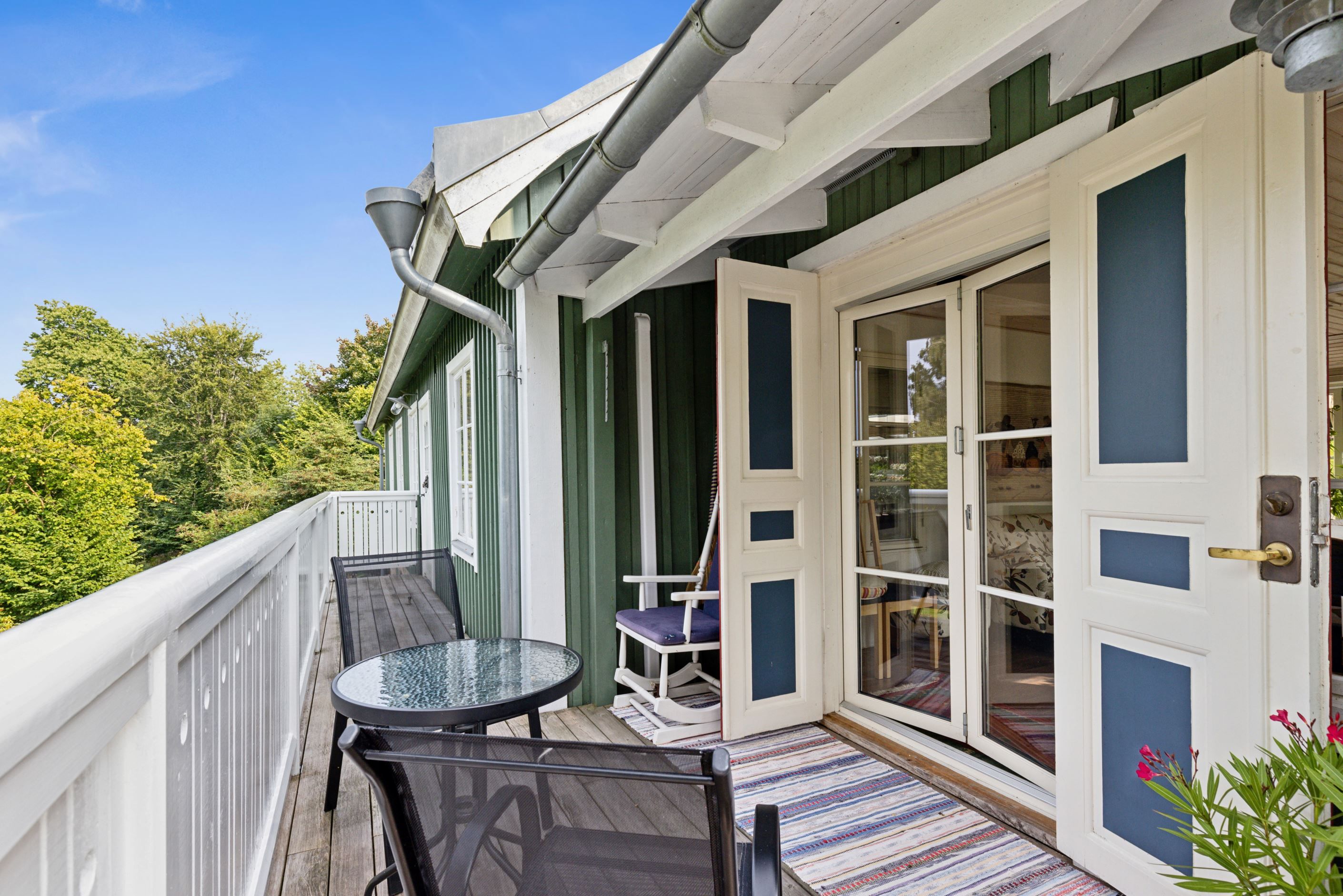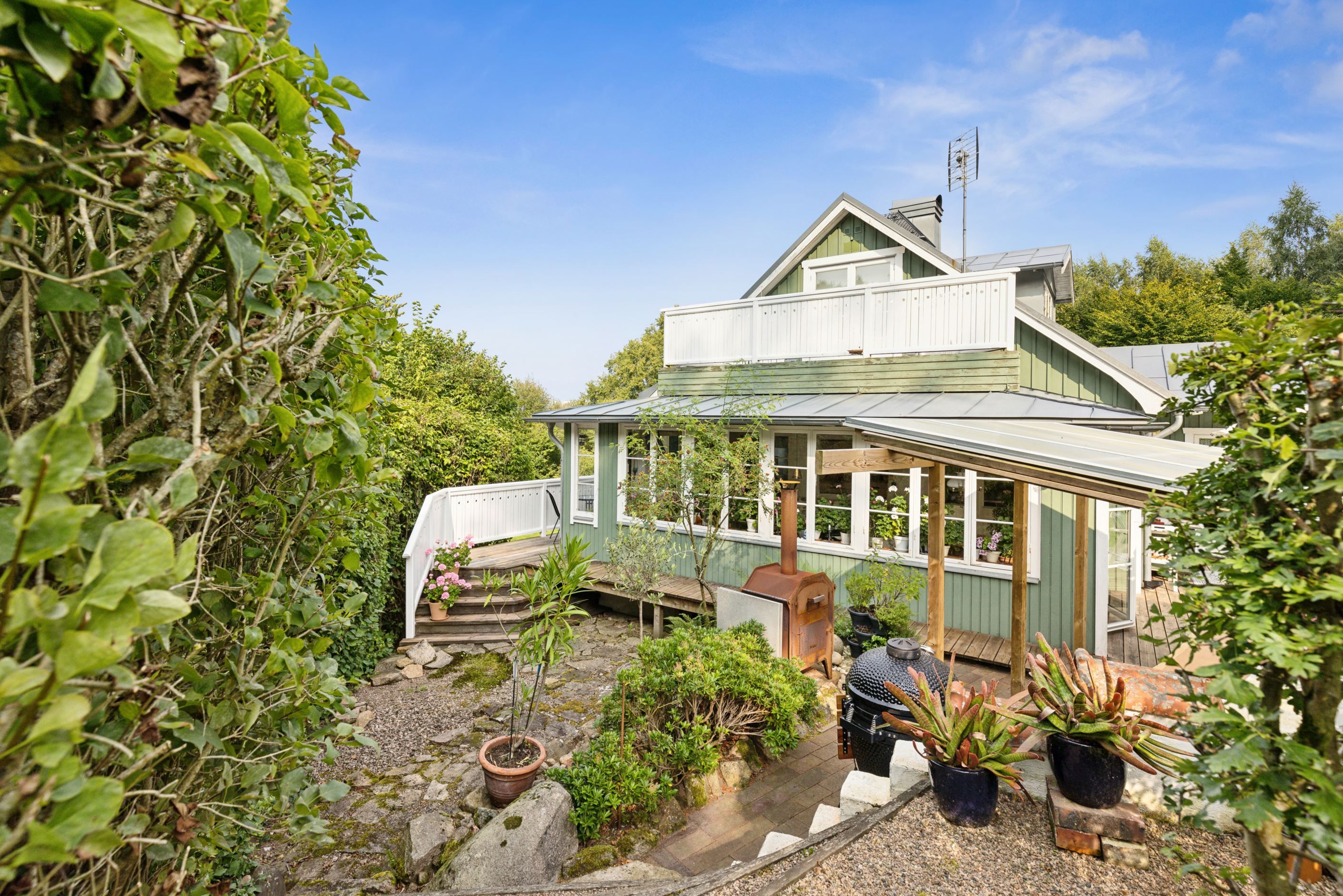 Vidare på entréplanet finns kontor, sovrum med gjutjärnskamin samt ytterligare ett badrum. Övre plan erbjuder två sovrum med charmiga detaljer, platsbyggda lösningar och gott om förvaring i garderober och klädkammare. Från det ena sovrummet nås en balkong i sydvästläge med fin utsikt över omgivningarna.