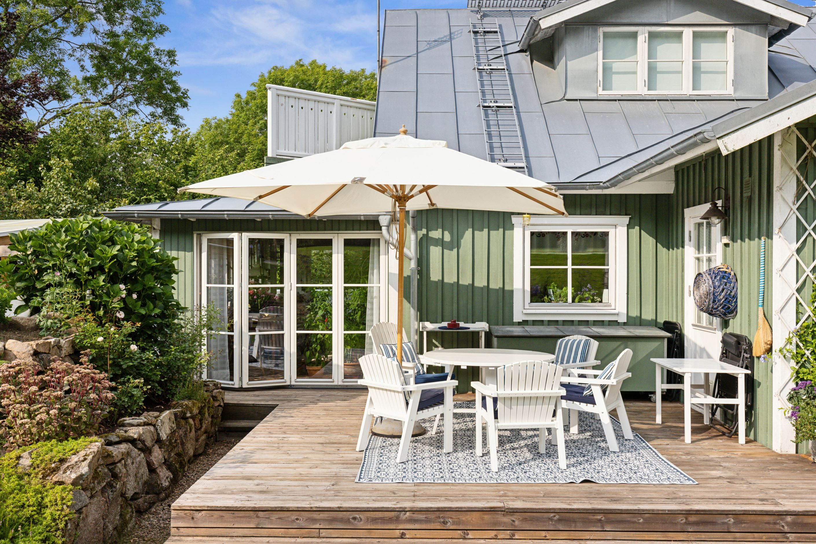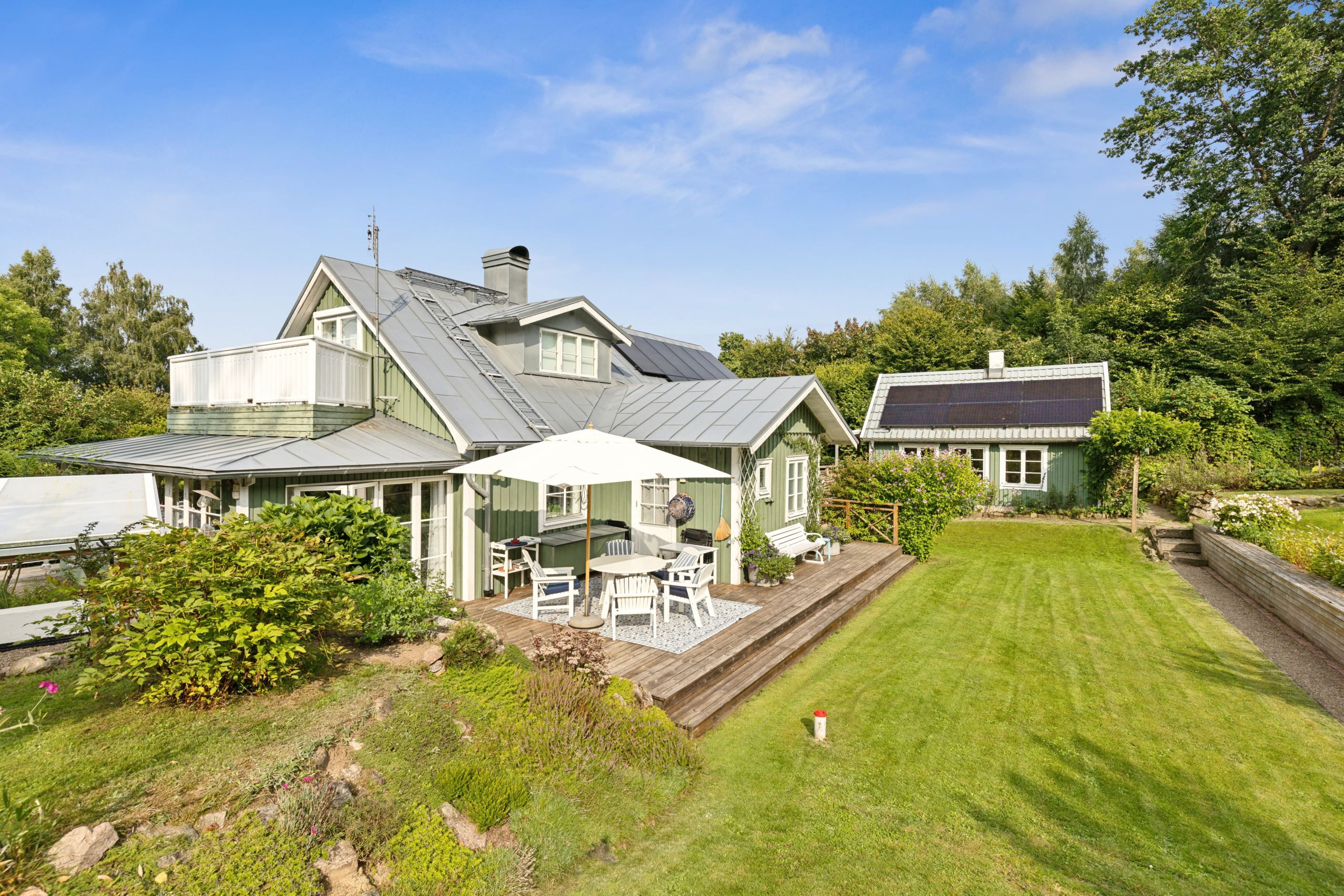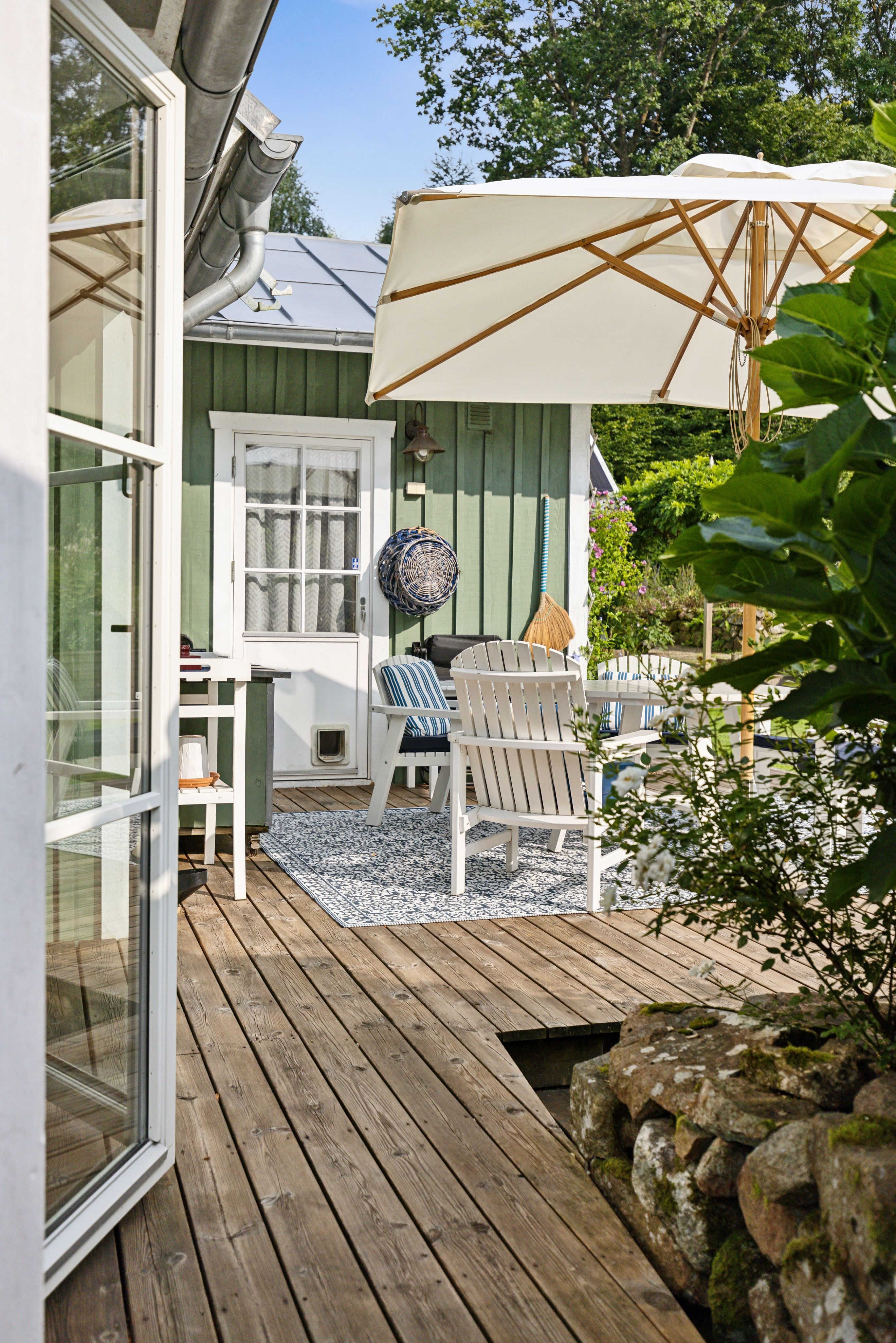 Intill bostadshuset finns även flera uteplatser, inklusive ett generöst trädäck och utekök som tillsammans med den långsträckta terrassen suddar ut gränsen mellan ute och inne och skapar en naturlig plats för umgänge.