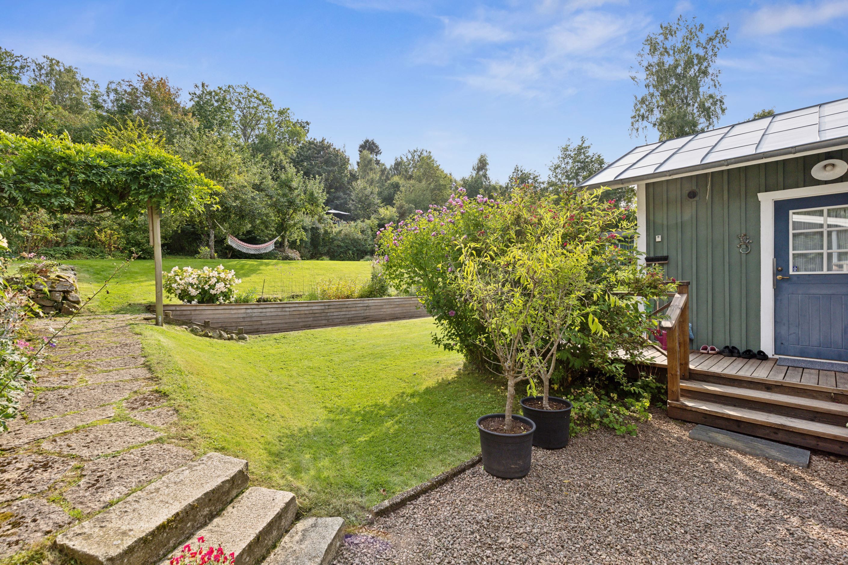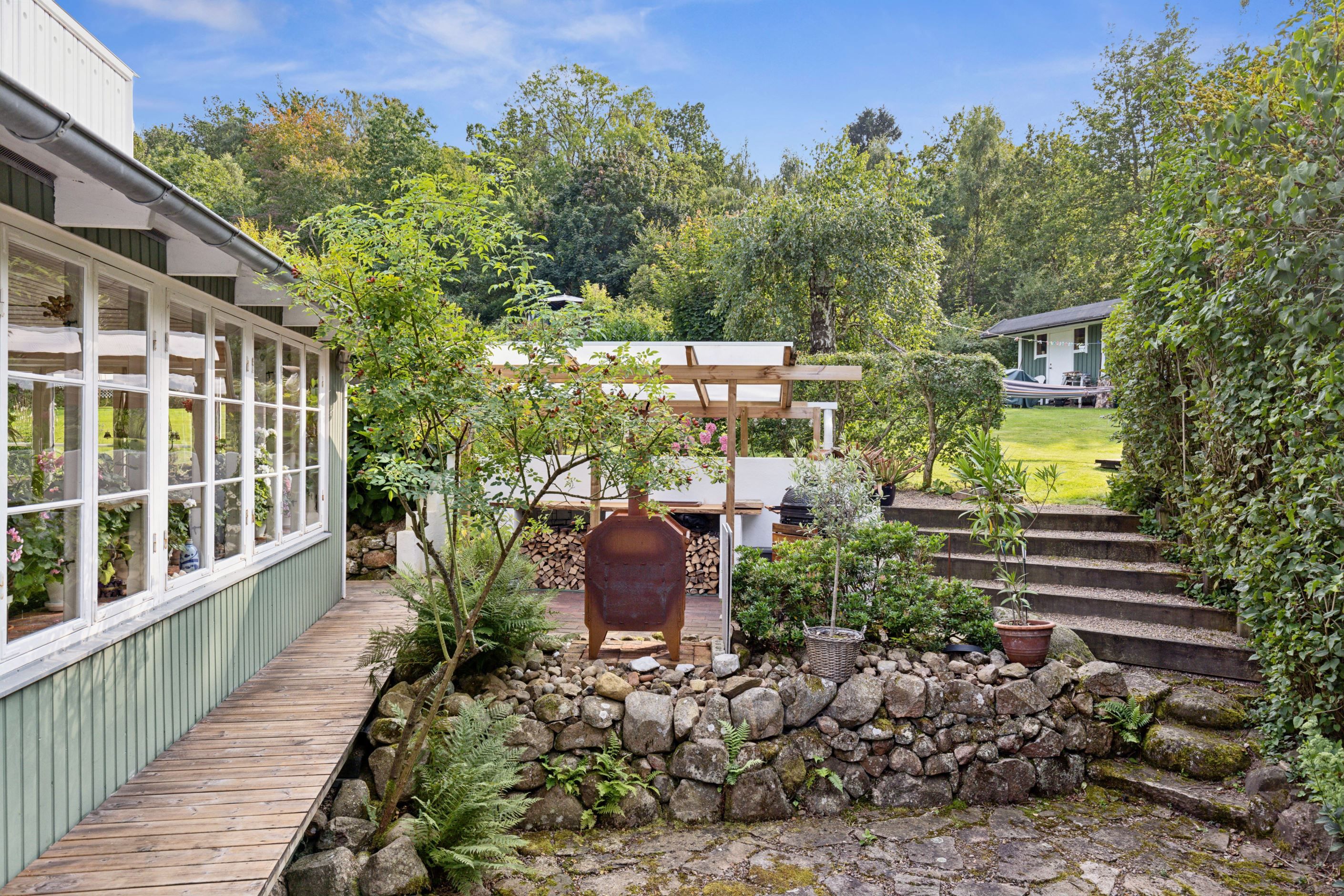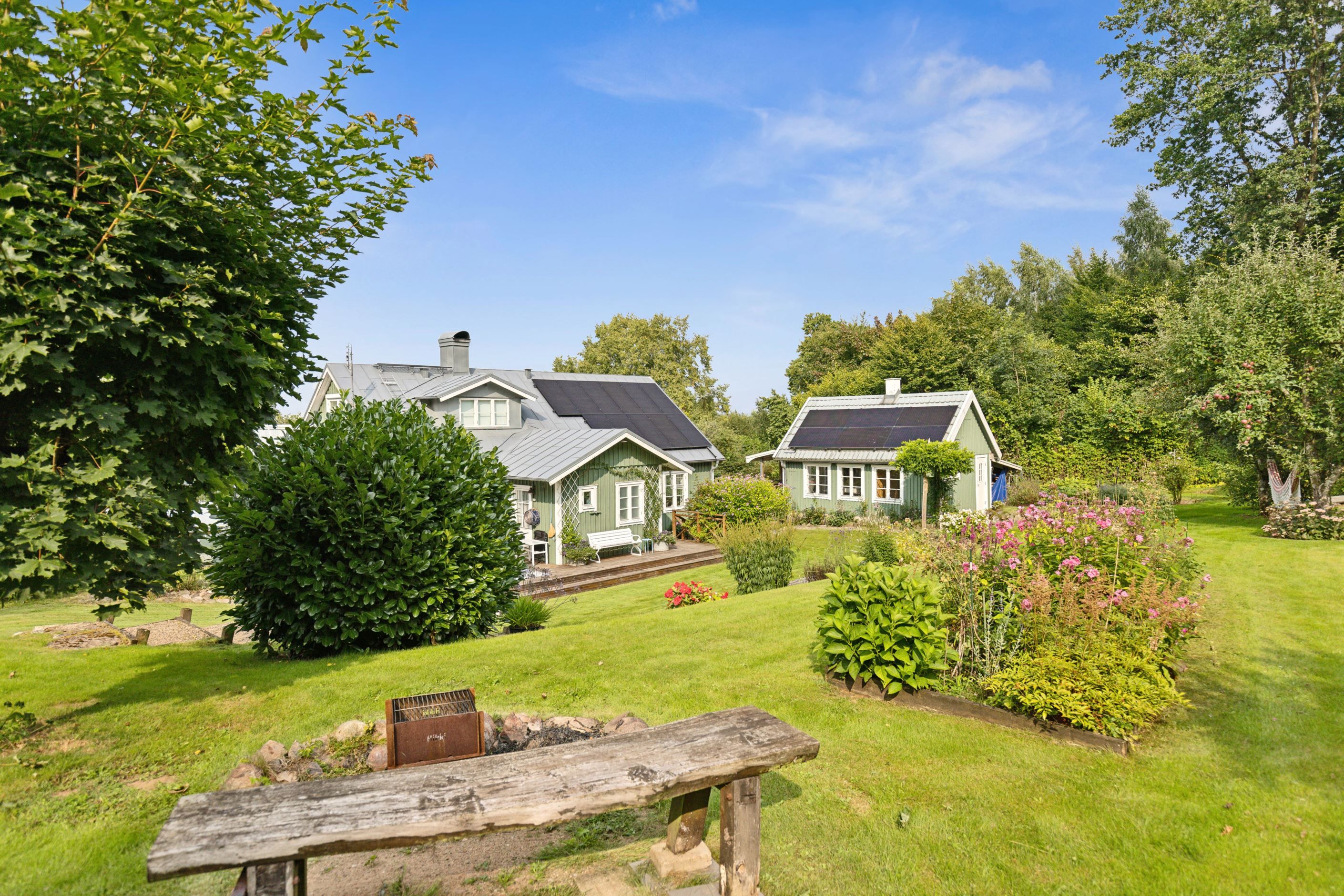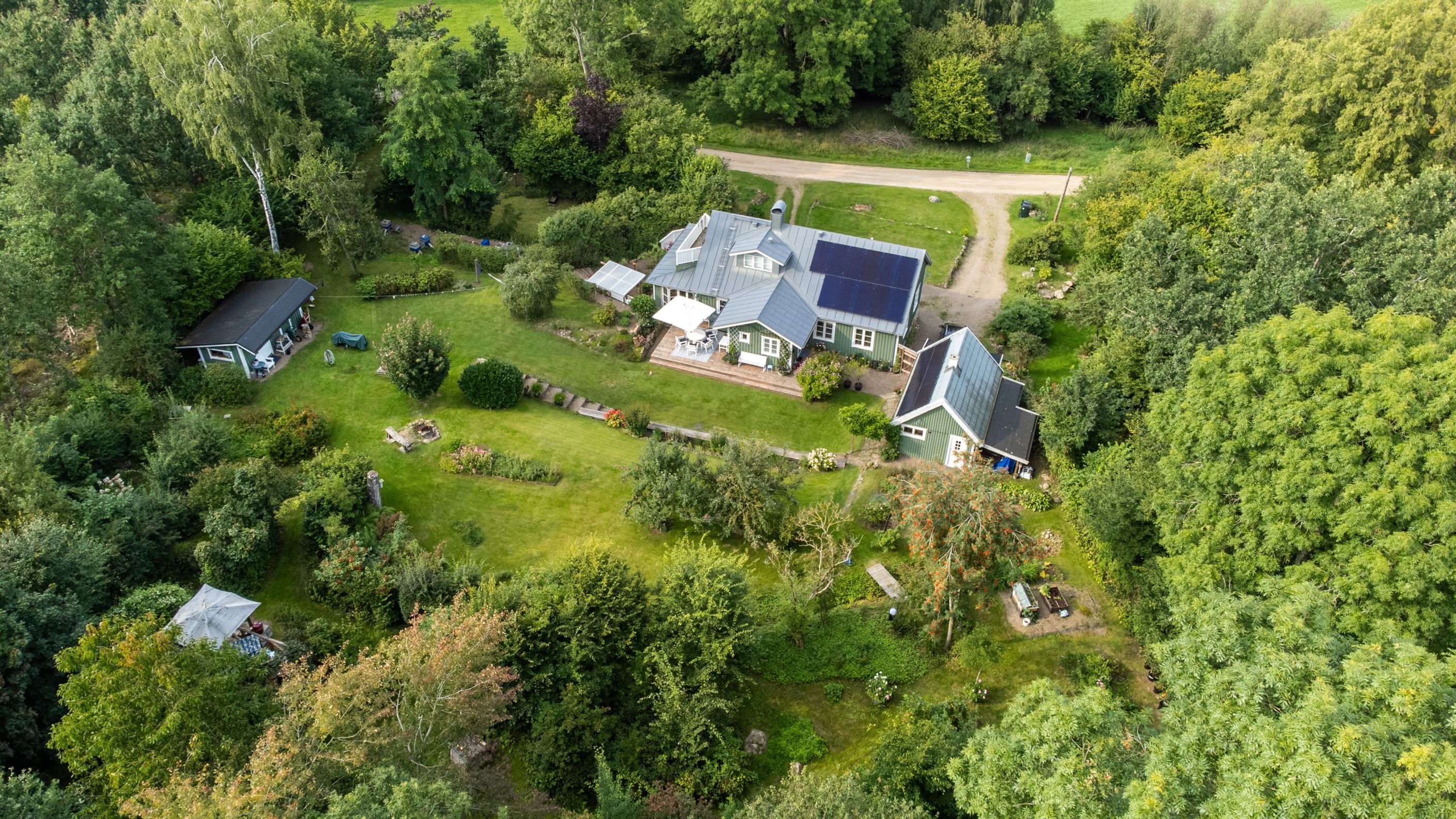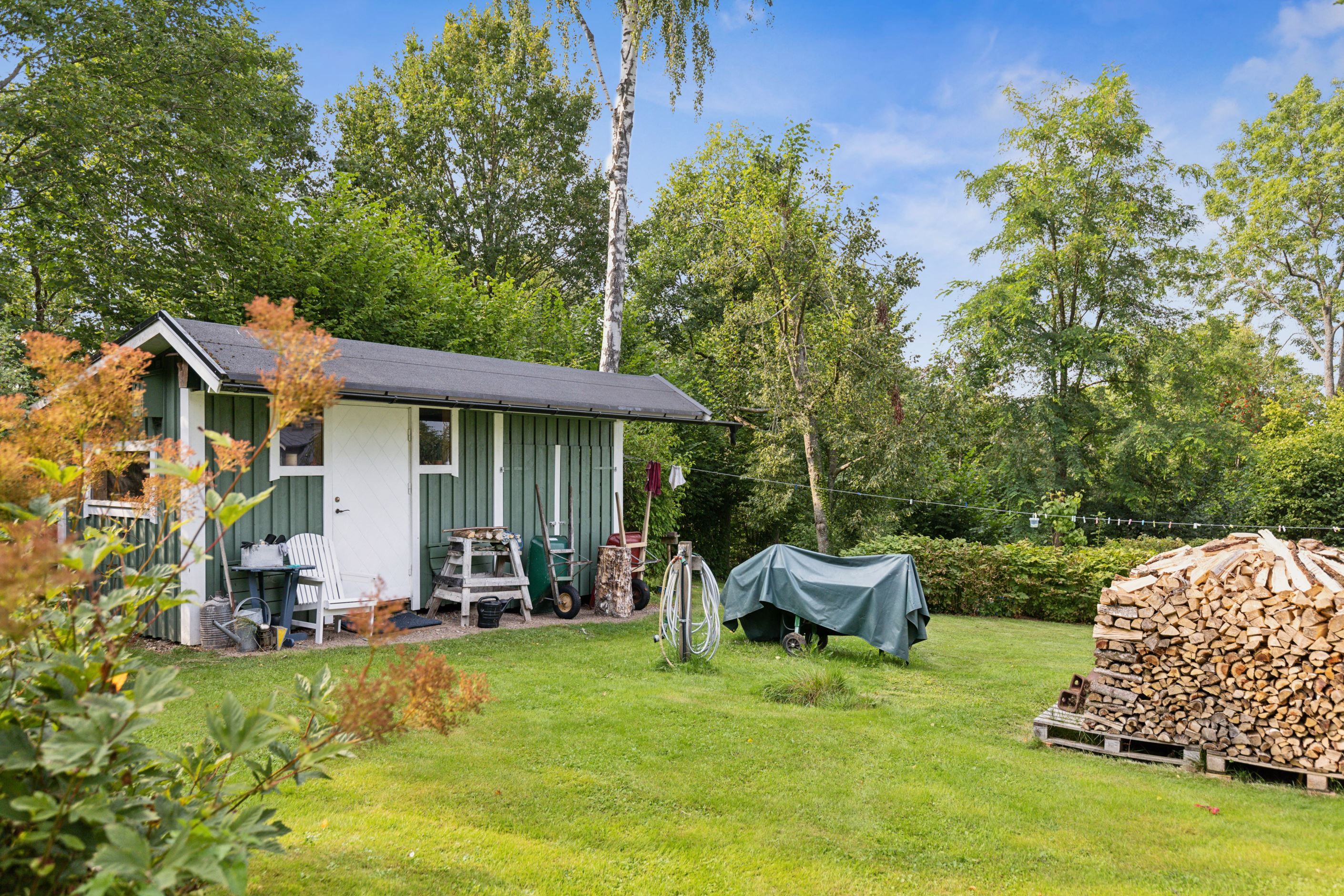På baksidan breder en vacker och skyddad trädgård ut sig där grönskan ramar in flera trivsamma uteplatser. Sidobyggnaderna samspelar fint och skapar en inbjudande helhet. Här finns ett förrådsannex med framdraget vatten och avlopp, trädgårdsbod samt ett charmigt uterum placerat i utkanten mot skogen. Uterummet, med tillhörande trädäck och utsikt över det öppna landskapet, fungerar som en naturlig samlingsplats under sommarhalvåret.