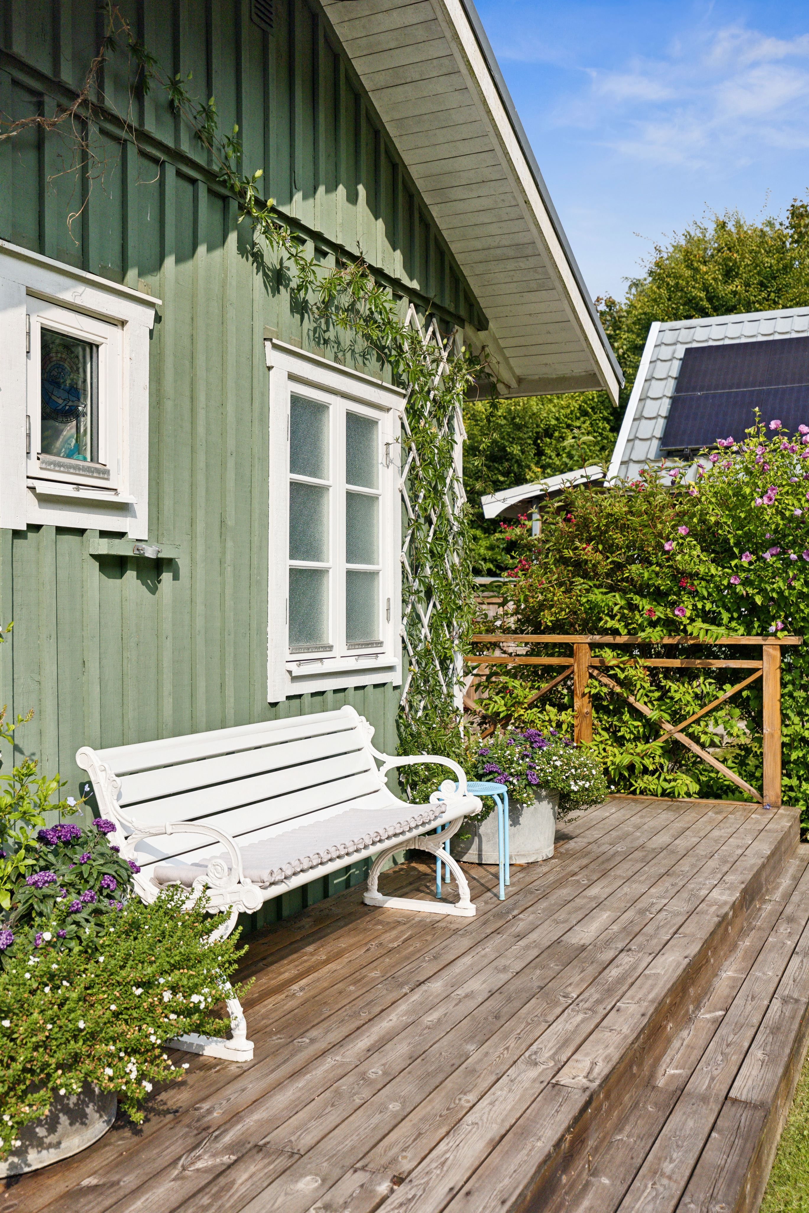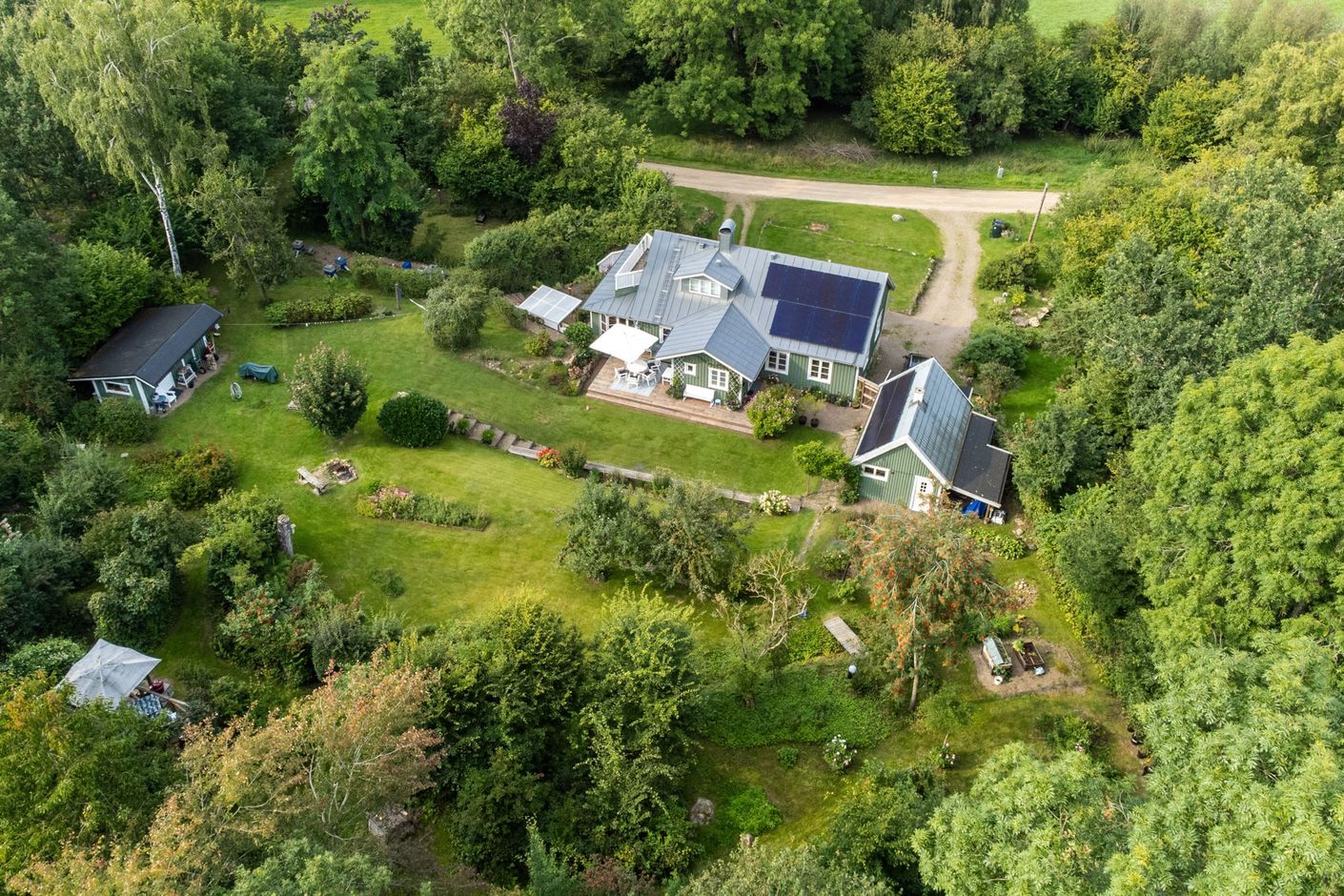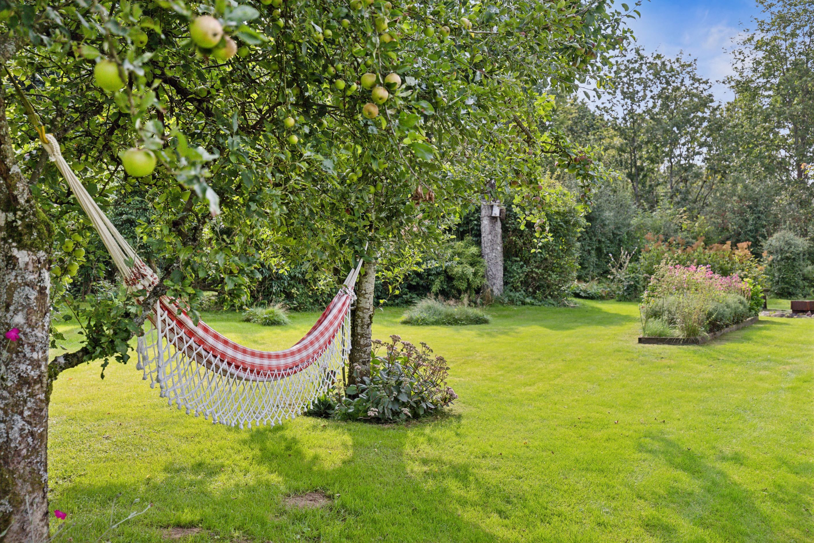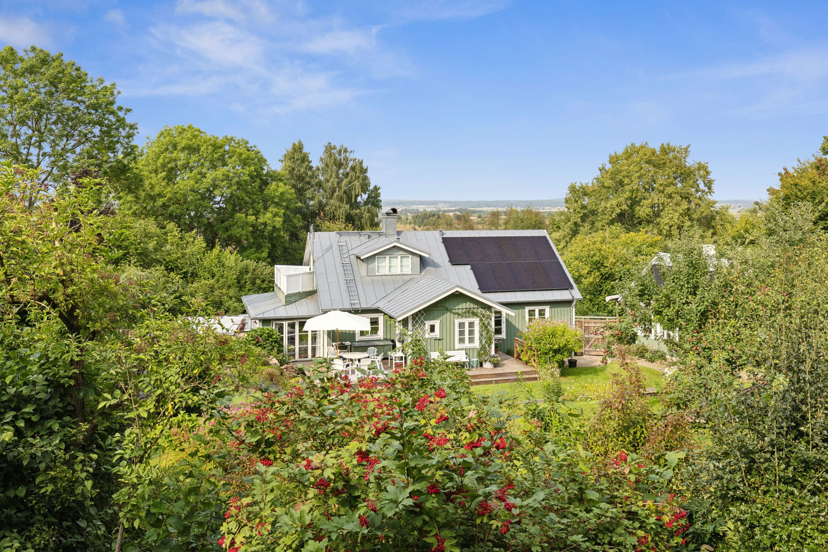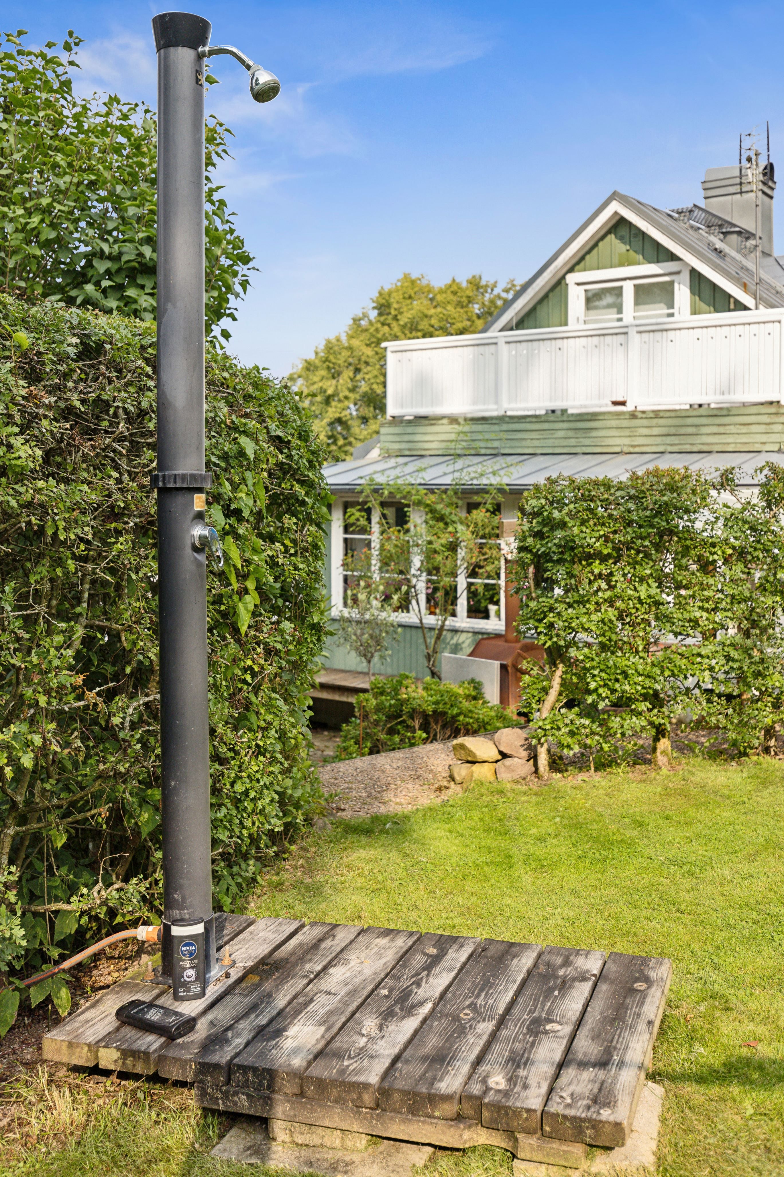 På baksidan breder en vacker och skyddad trädgård ut sig där grönskan ramar in flera trivsamma uteplatser. Sidobyggnaderna samspelar fint och skapar en inbjudande helhet. Här finns ett förrådsannex med framdraget vatten och avlopp, trädgårdsbod samt ett charmigt uterum placerat i utkanten mot skogen. Uterummet, med tillhörande trädäck och utsikt över det öppna landskapet, fungerar som en naturlig samlingsplats under sommarhalvåret.