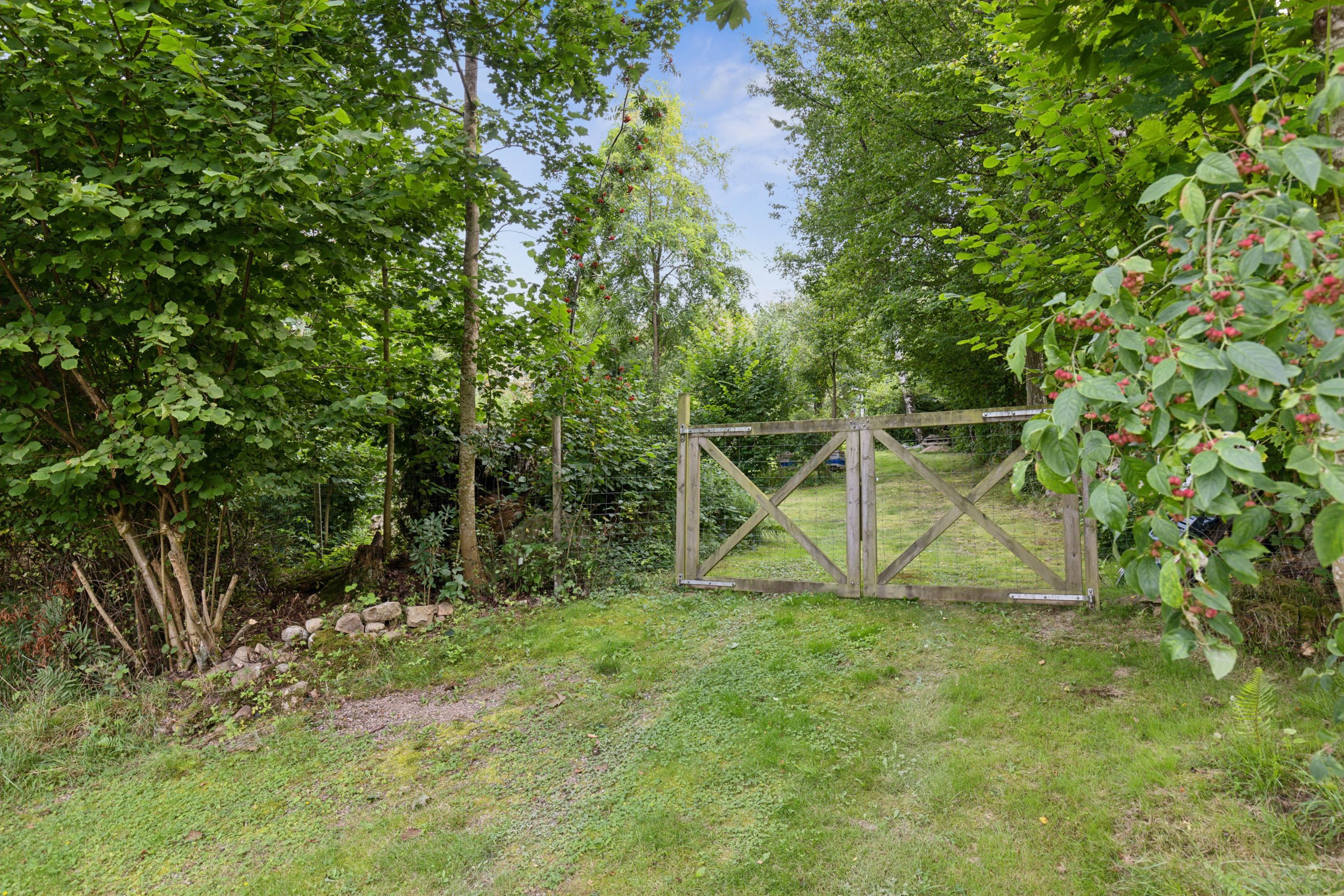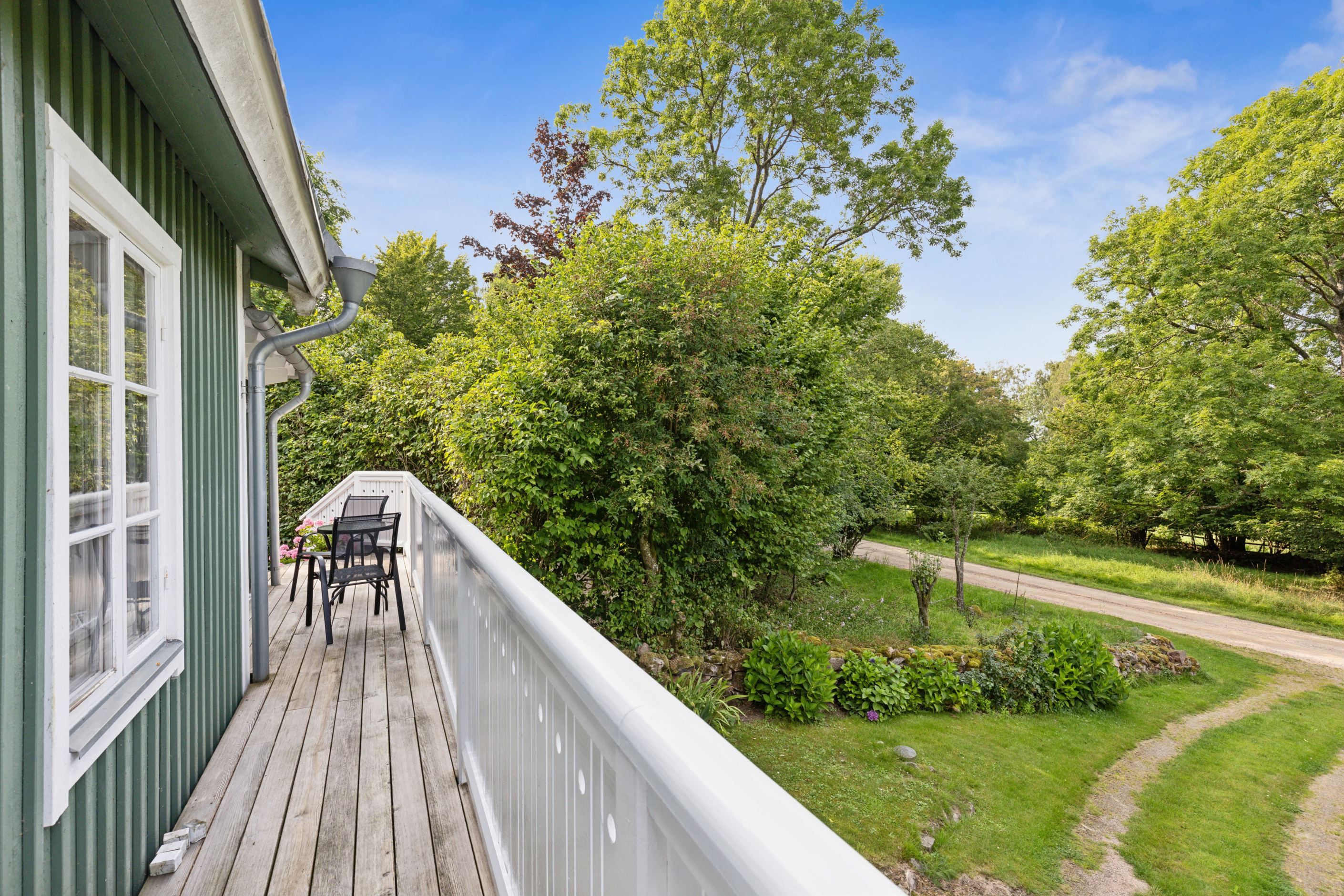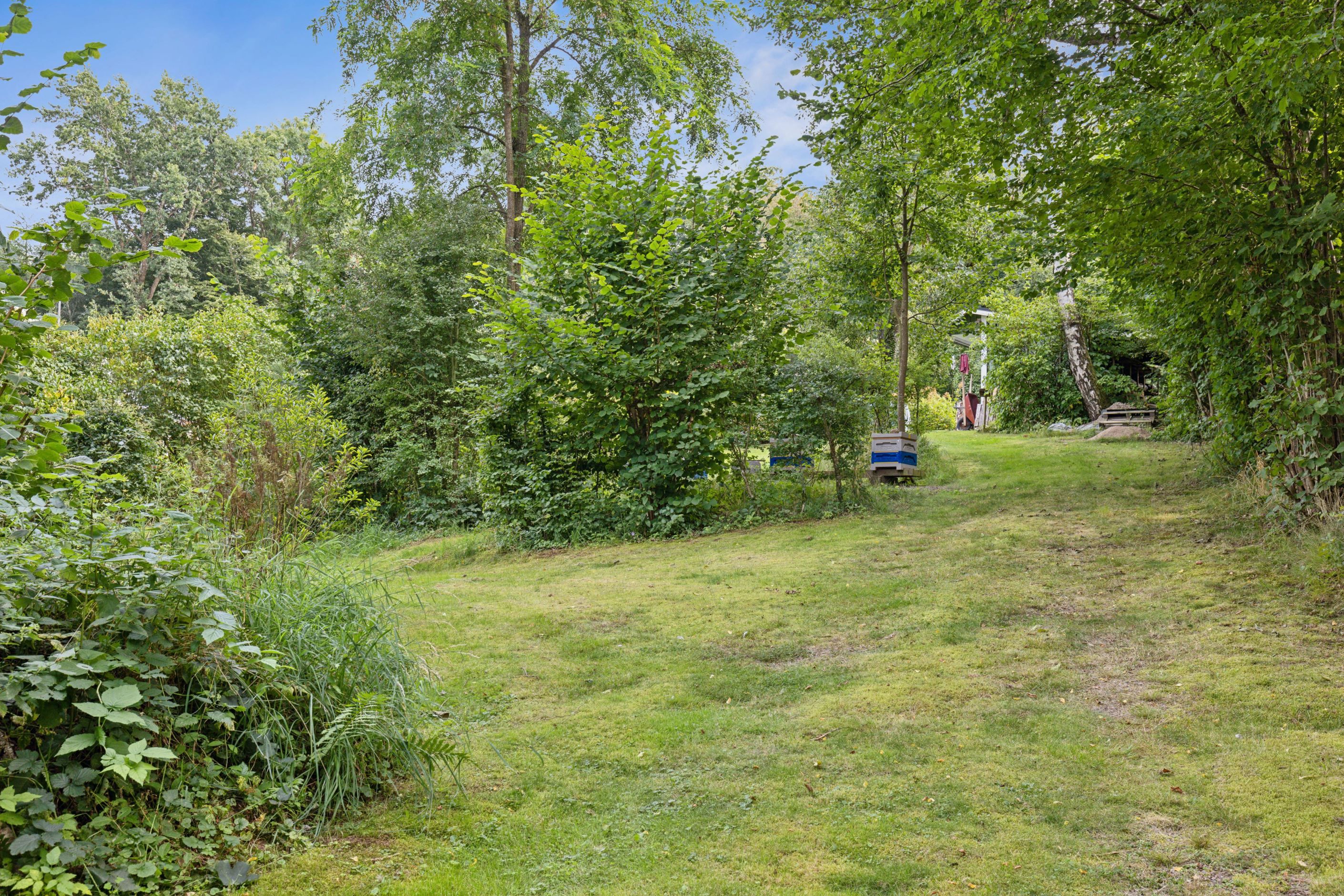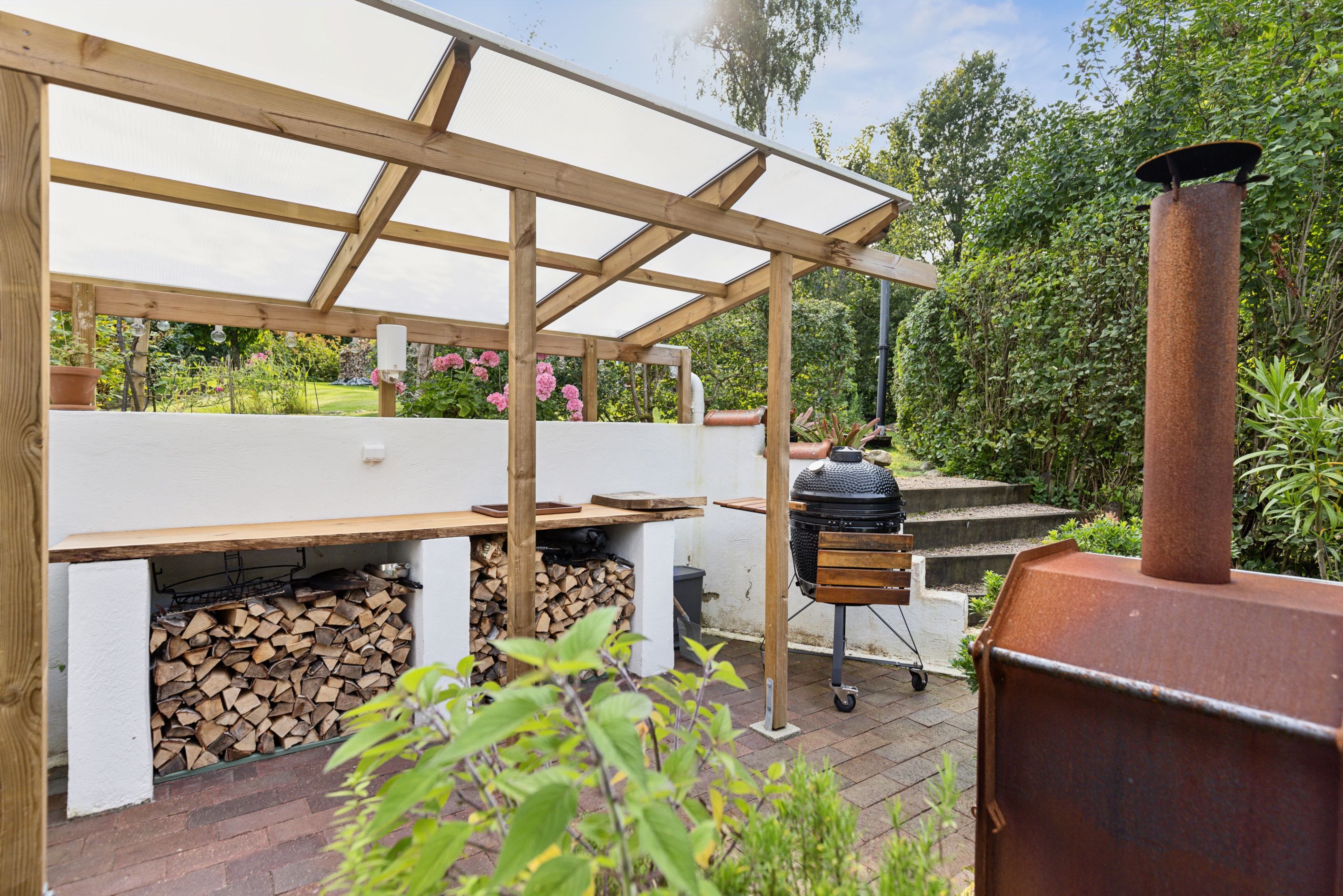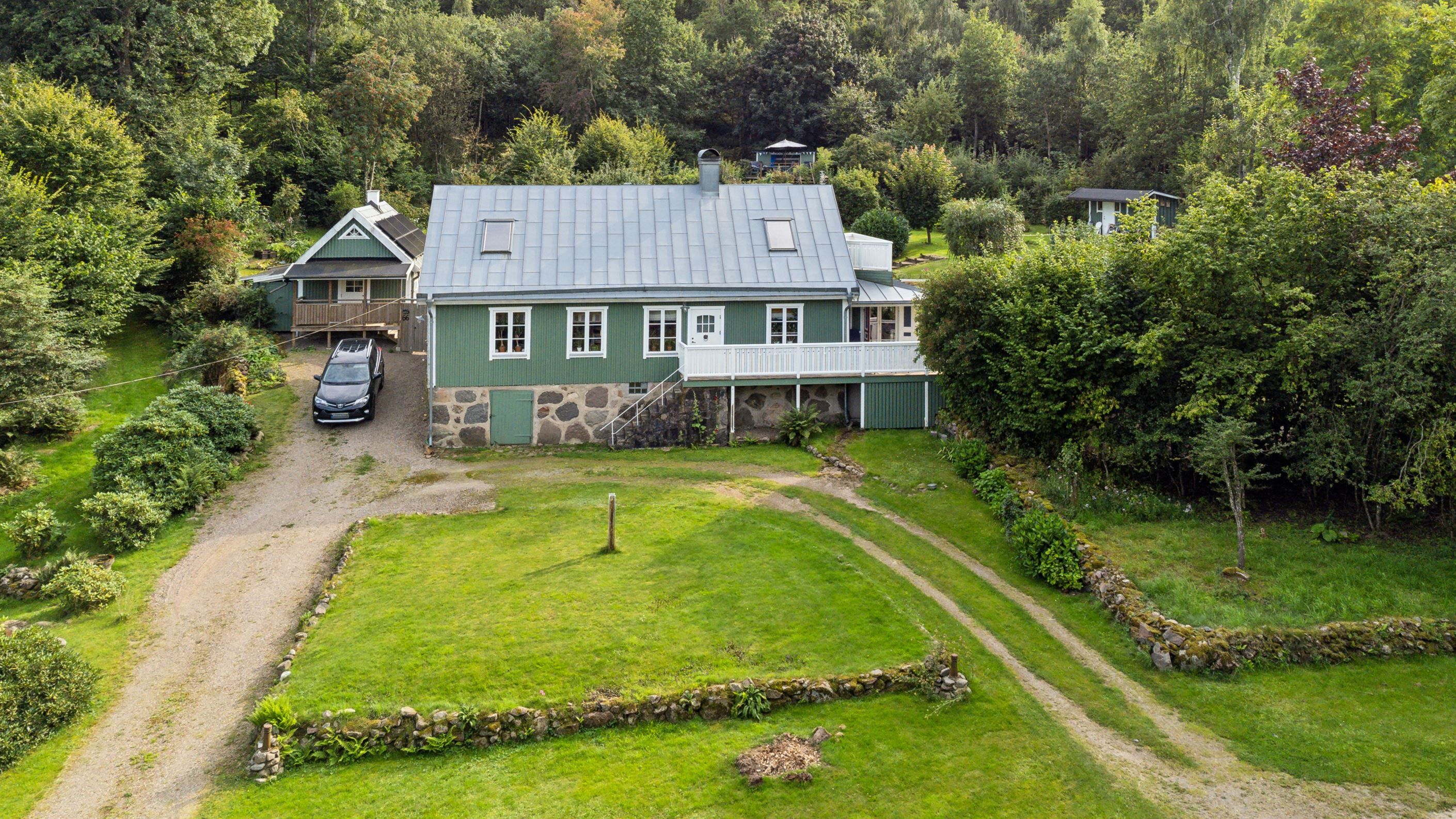 På baksidan breder en vacker och skyddad trädgård ut sig där grönskan ramar in flera trivsamma uteplatser. Sidobyggnaderna samspelar fint och skapar en inbjudande helhet. Här finns ett förrådsannex med framdraget vatten och avlopp, trädgårdsbod samt ett charmigt uterum placerat i utkanten mot skogen. Uterummet, med tillhörande trädäck och utsikt över det öppna landskapet, fungerar som en naturlig samlingsplats under sommarhalvåret.