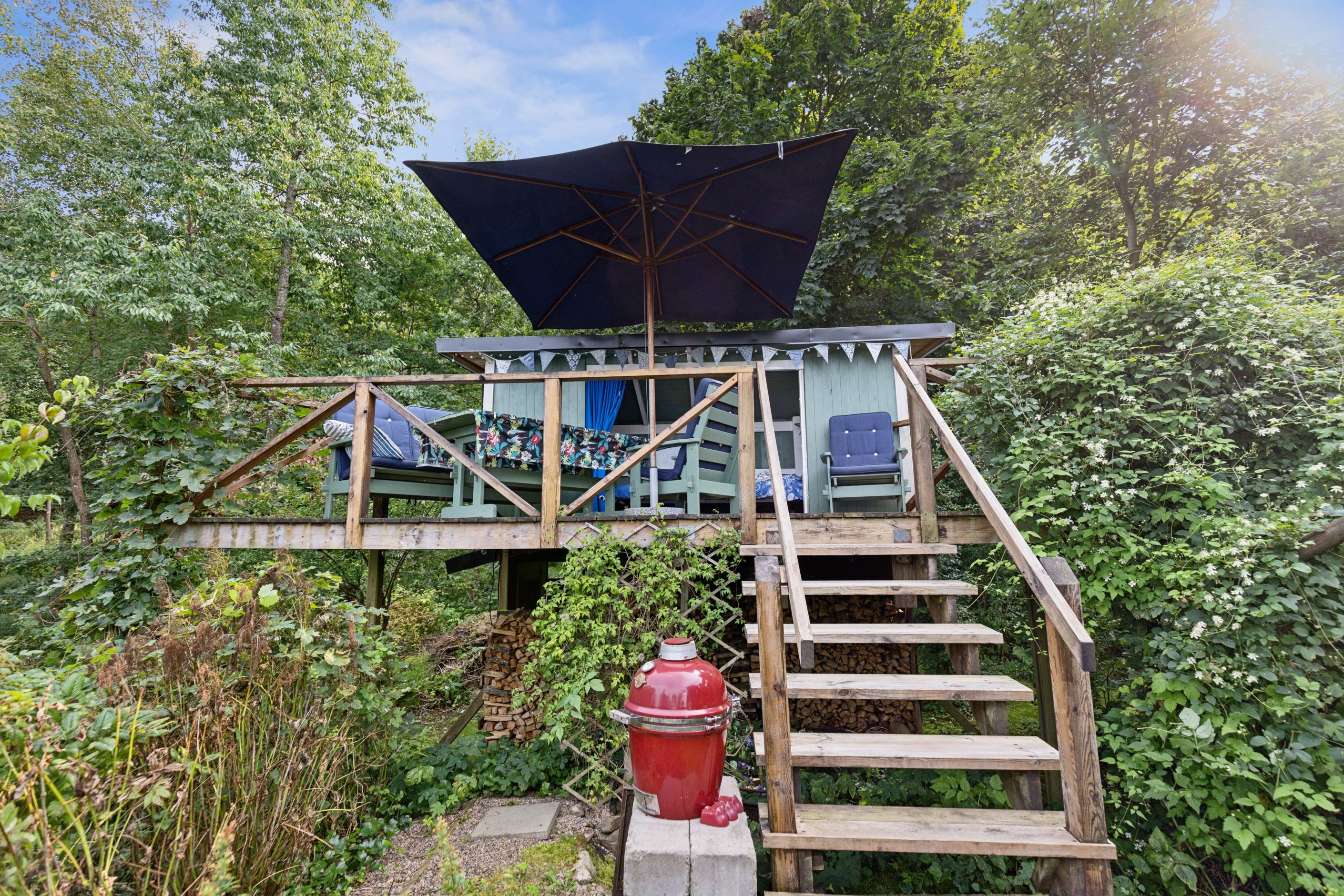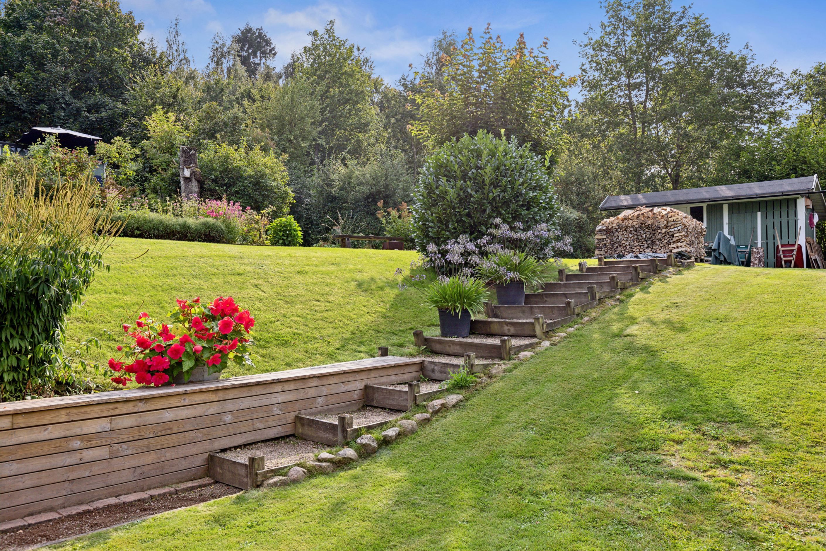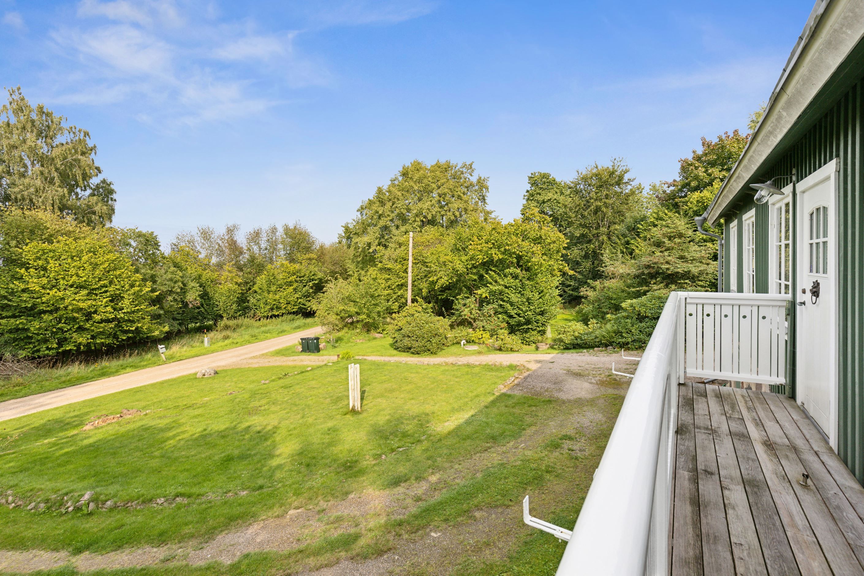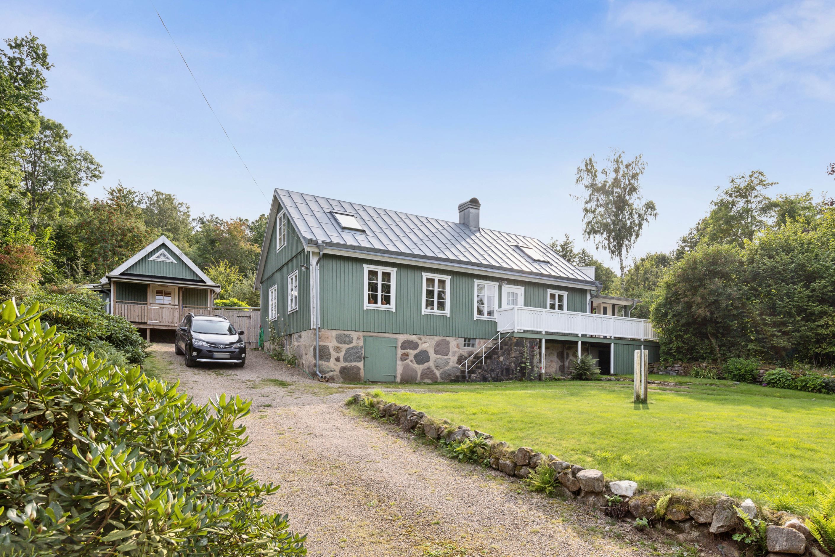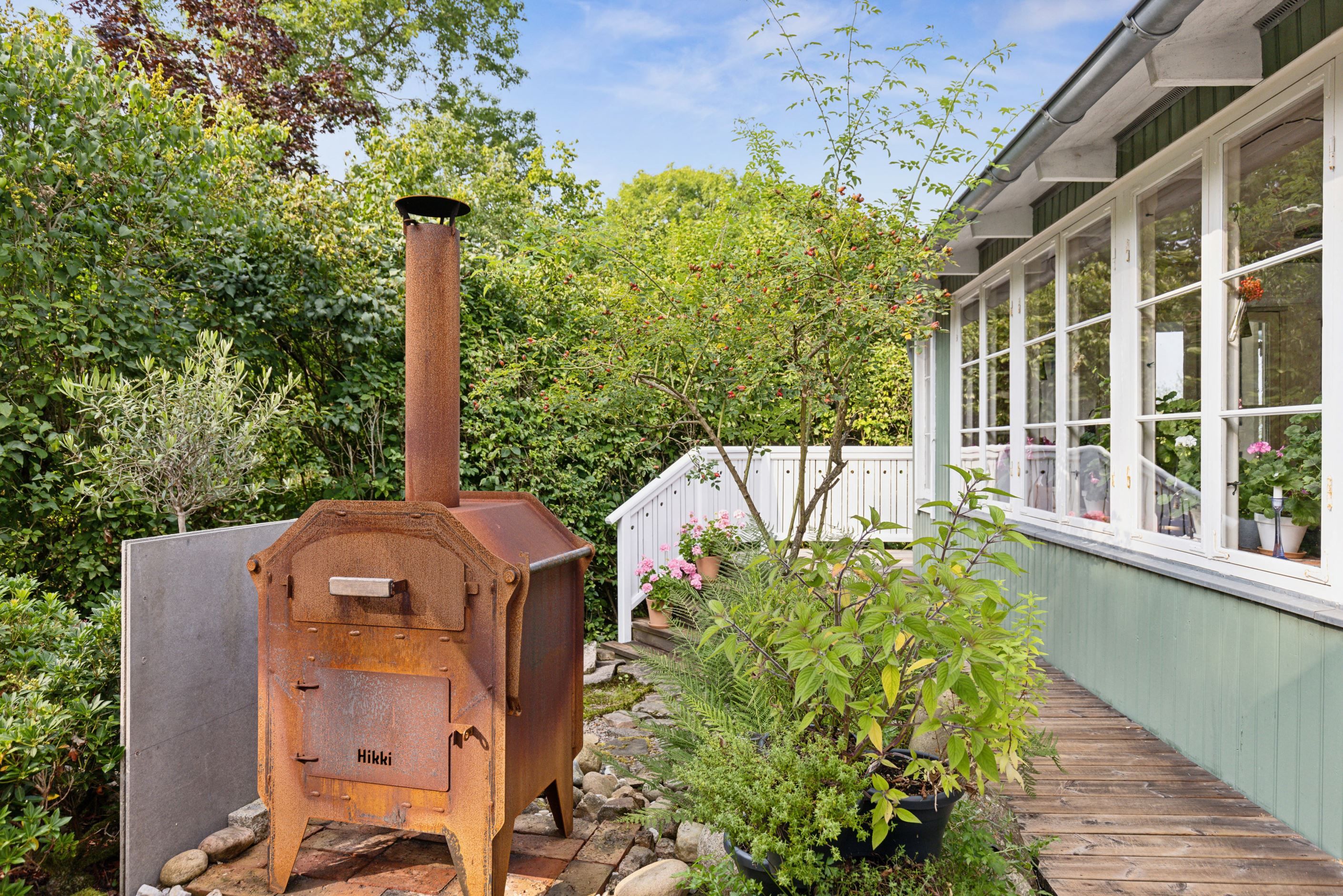 På baksidan breder en vacker och skyddad trädgård ut sig där grönskan ramar in flera trivsamma uteplatser. Sidobyggnaderna samspelar fint och skapar en inbjudande helhet. Här finns ett förrådsannex med framdraget vatten och avlopp, trädgårdsbod samt ett charmigt uterum placerat i utkanten mot skogen. Uterummet, med tillhörande trädäck och utsikt över det öppna landskapet, fungerar som en naturlig samlingsplats under sommarhalvåret.