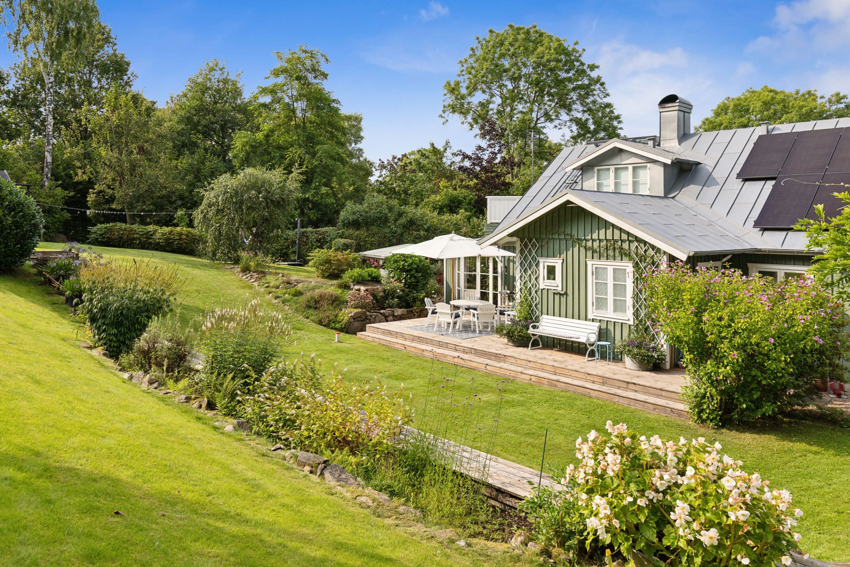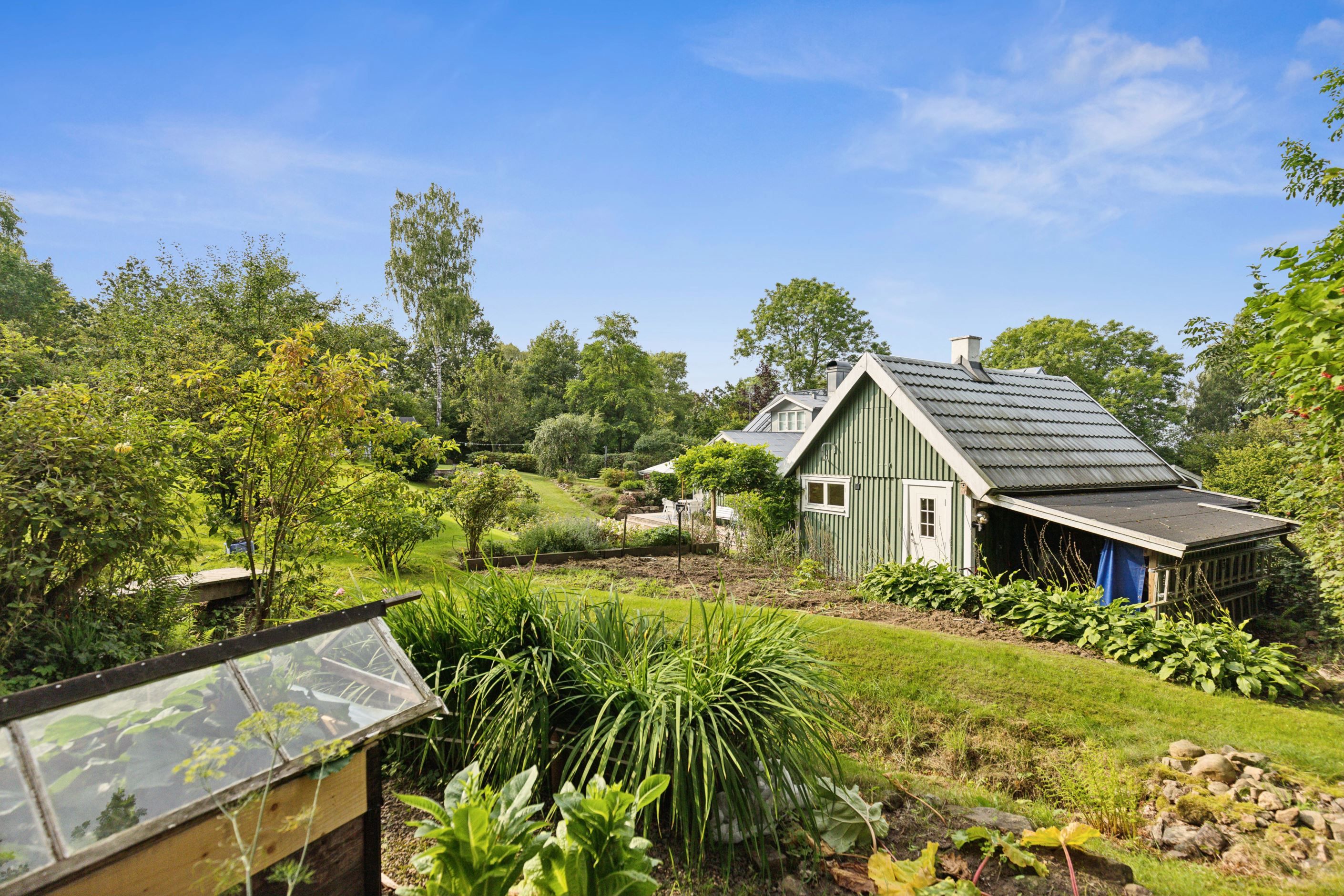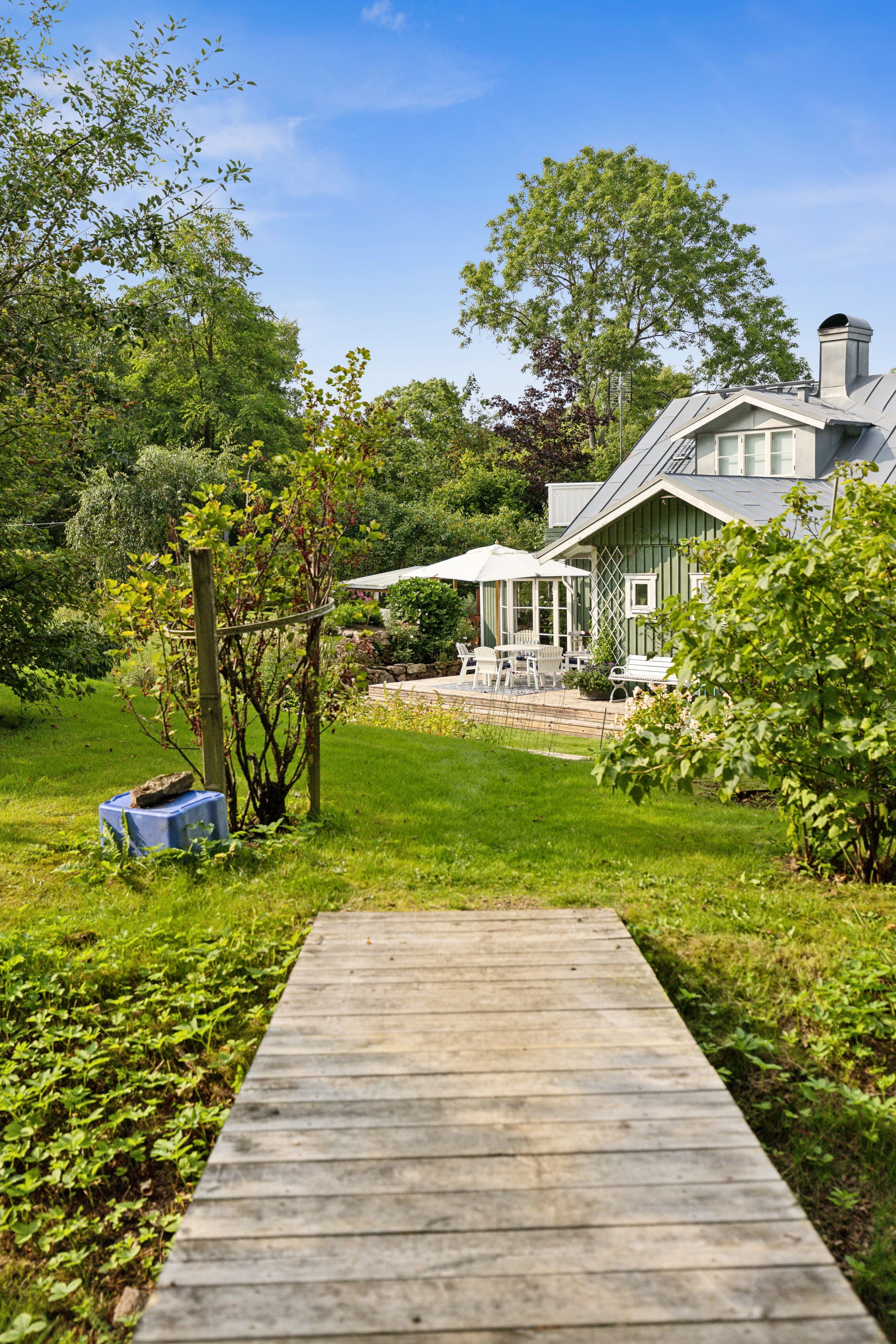 Fastigheten har en spännande historia som tidigare småskola, men har med stor omsorg och känsla för detaljer förvandlats till ett charmigt och hemtrevligt boende. Trädgården är något alldeles extra – en levande och genomtänkt miljö där den naturliga slänten mot åsen har formats till olika rum med odlingar, fruktträd och generösa ytor för både avkoppling och sociala stunder.