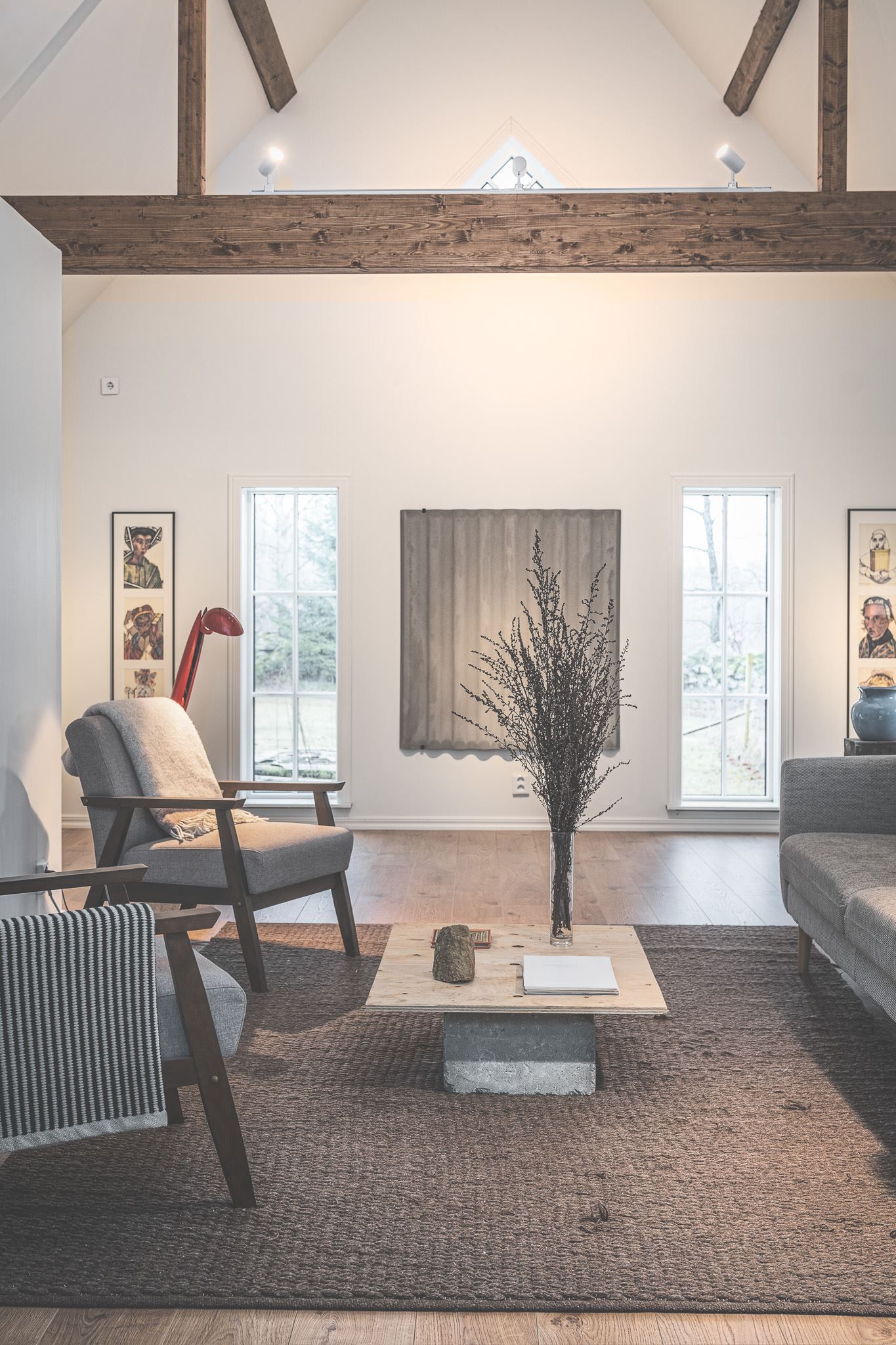 Vardagsrummet är något alldeles extra – stort, luftigt och med en imponerande takhöjd som sträcker sig upp i nock. De synliga bjälkarna här ger rummet en känsla av rymd och karaktär, samtidigt som det är det perfekta utrymmet för avkoppling och socialt umgänge. Här finns även möjlighet att skapa en egen ateljé eller arbetsplats, där kreativiteten kan flöda fritt.
