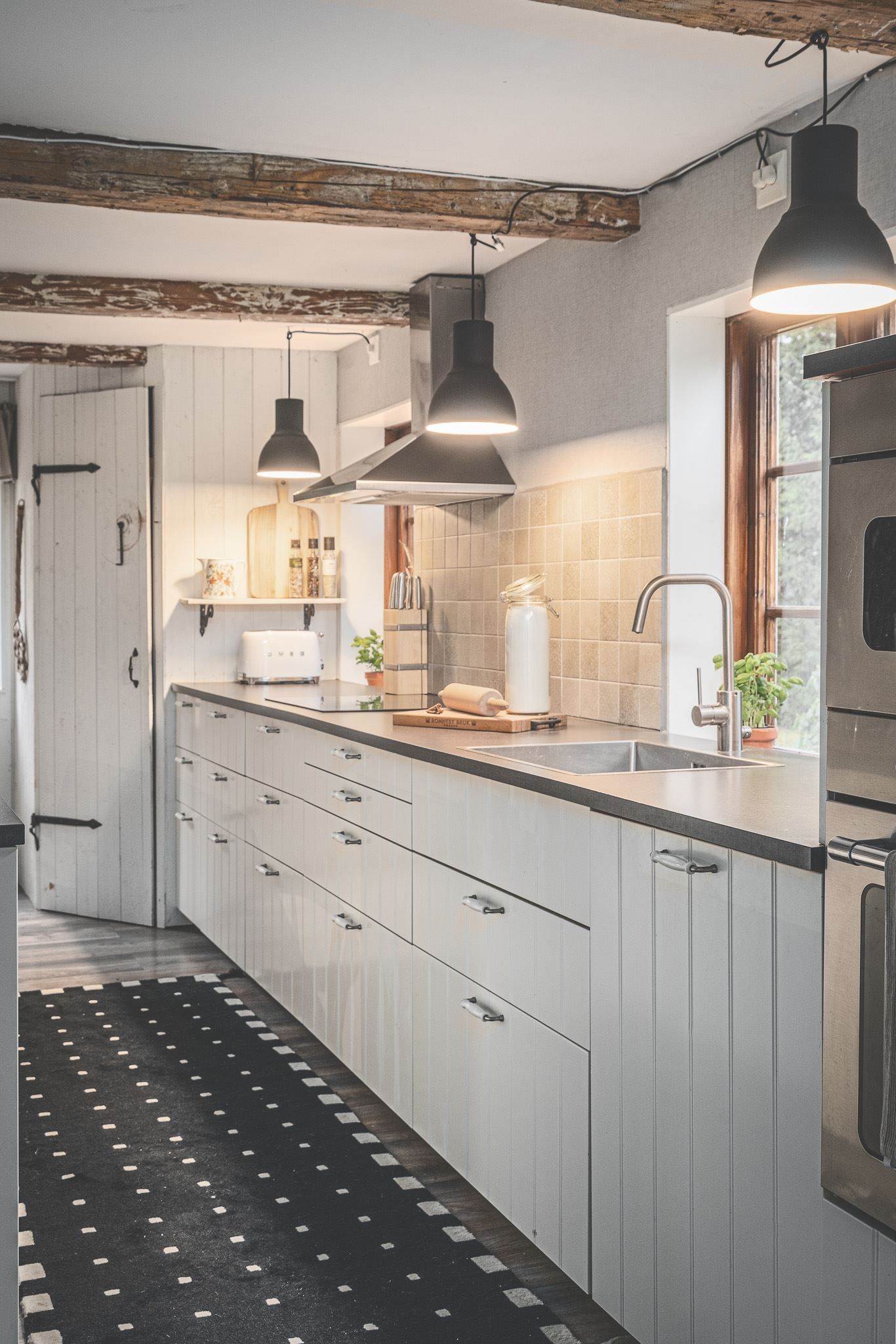 Det välrenoverade huset har behållit sin ursprungliga charm med vackra synliga bjälkar i taket, som ger en rustik och varm känsla. Den moderna renoveringen gör att varje rum känns ljust och inbjudande, med ett perfekt samspel mellan gammal karaktär och nutida elegans. Det stora köket, med plats för både matlagning och umgänge, har en mysig kamin som sprider värme och skapar en härlig atmosfär. Här är det lätt att föreställa sig härliga middagar med familj och vänner, eller lugna stunder framför elden under kyliga vinterkvällar.