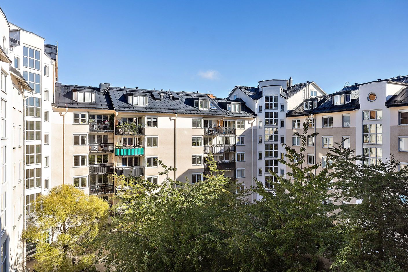 Vardagsrummet är rymligt och lättmöblerat. Köket är modernt, fullt utrustat med diskmaskin och har matplats vid fönster. Härifrån nås även balkongen mot innergården.