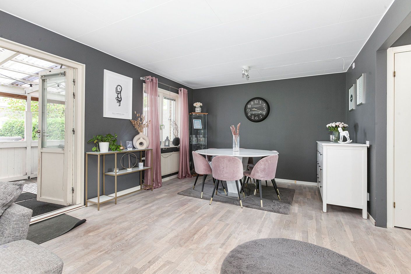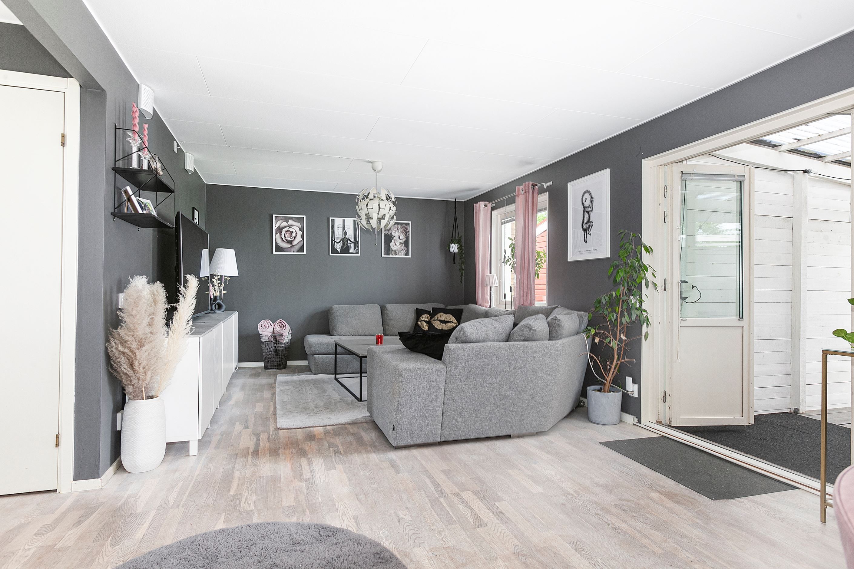 Från hallen fortsätter du in i bostadens hjärta, det rymliga vardagsrummet. Här finns gott om utrymme för både matgrupp och en bekväm soffgrupp. Vardagsrummets utformning erbjuder möjligheten att genom att installera en vägg eller en avskiljare skapa ytterligare ett rum, vilket kan vara idealiskt om du har behov av fler sovrum. Genom altandörren kan du stiga ut i trädgården och njuta av en trevlig stund utomhus. Trädgården erbjuder en stenlagd uteplats under tak, ett förråd och en altan som omges av grönskande gräsmatta.