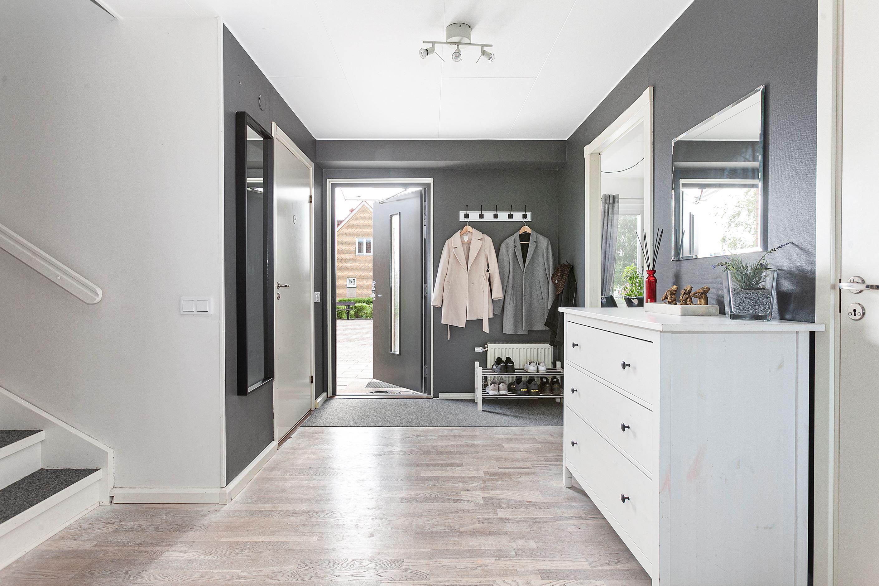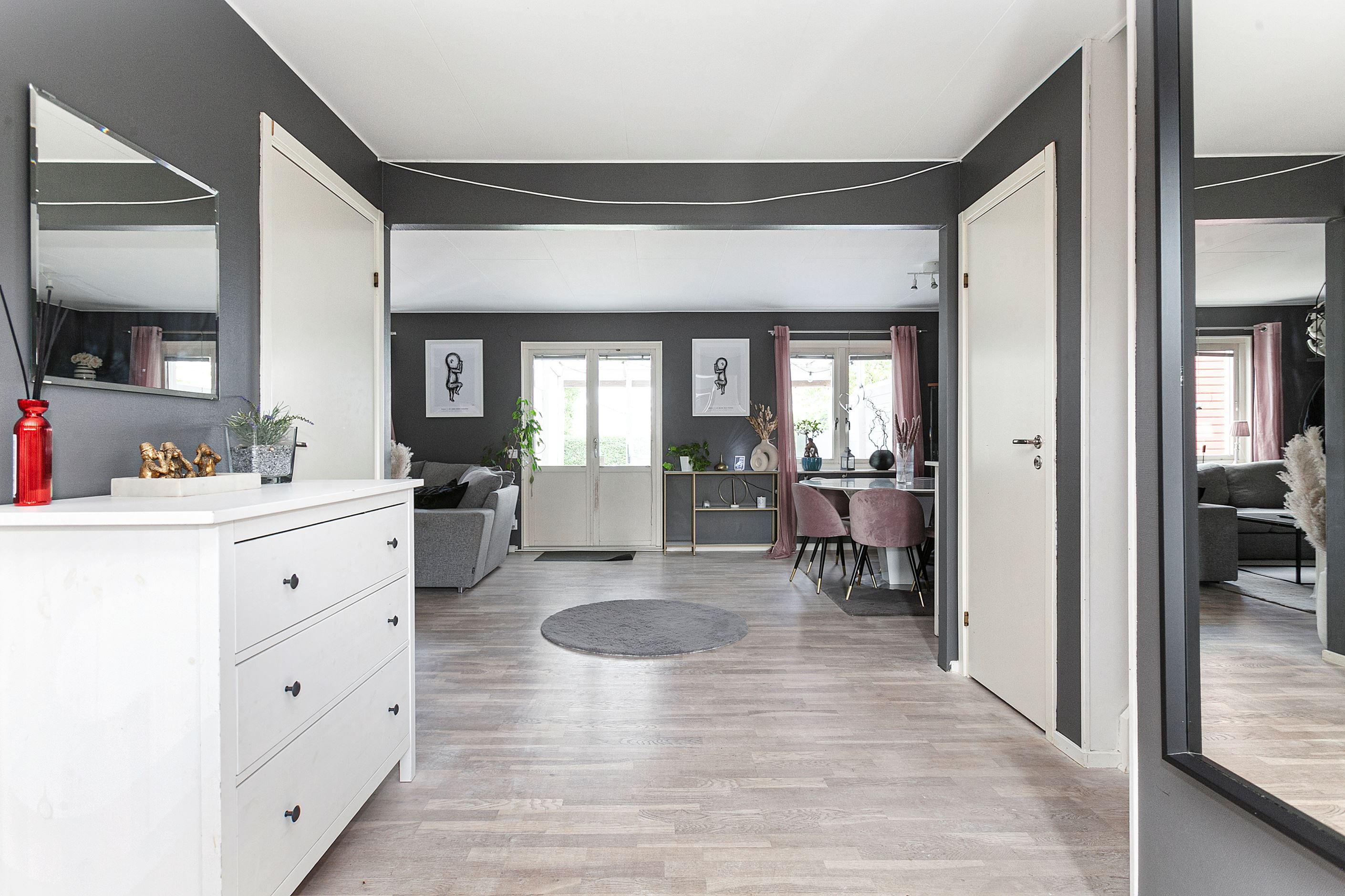 När du kliver in genom ytterdörren möts du av praktiska avhängningsmöjligheter precis innanför dörren, perfekt för att hänga av dig ytterkläder och skor. Dessutom finns det två klädkammare som ger extra förvaringsutrymme. Till vänster finner du köket, som pryds av naturfärgade köksluckor, vitt kakel och stilrent laminatgolv. Med ett härligt ljusinsläpp, bra plats för matgrupp och dessutom en separat tvättstuga alldeles intill, får köket ut sin fulla potential.