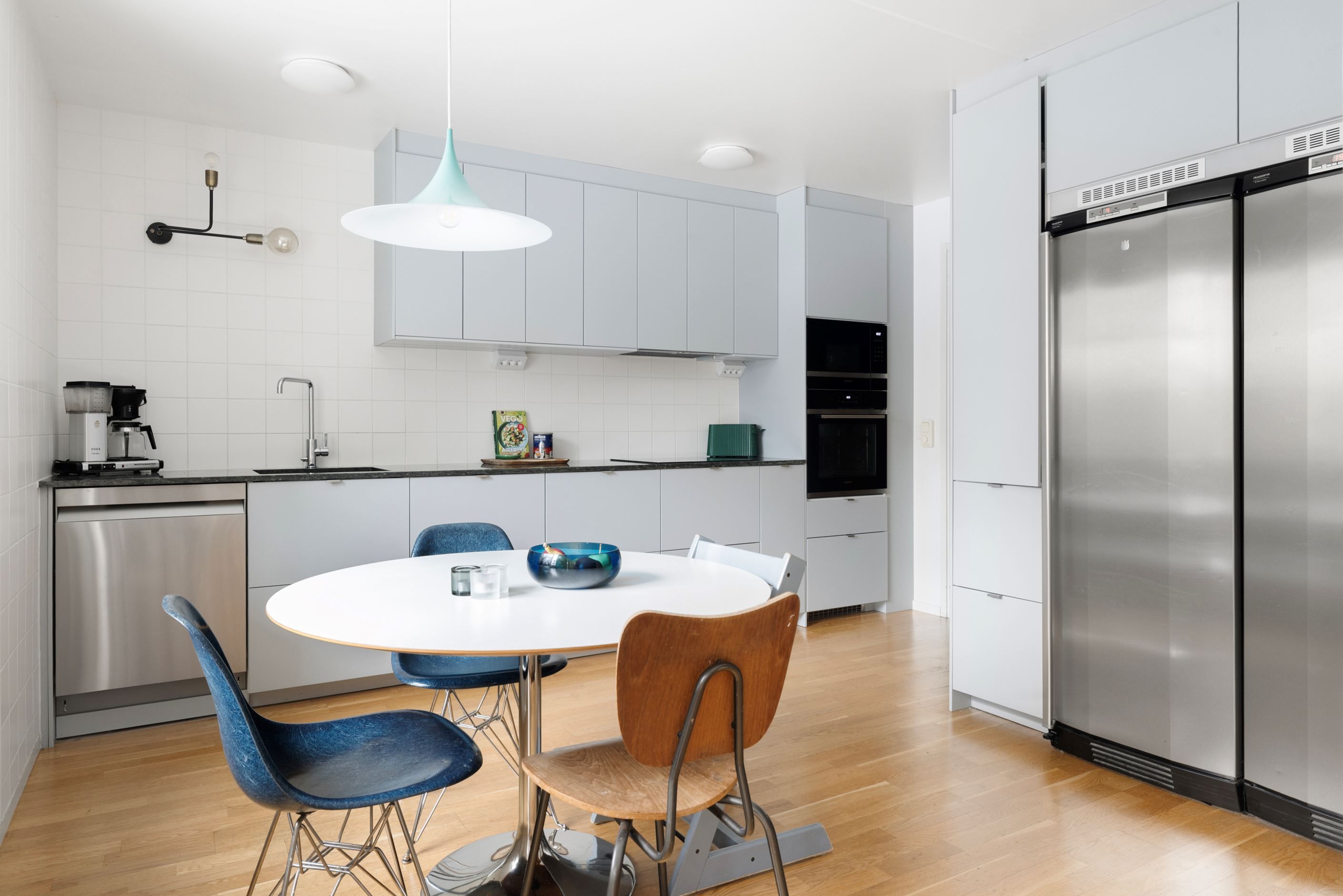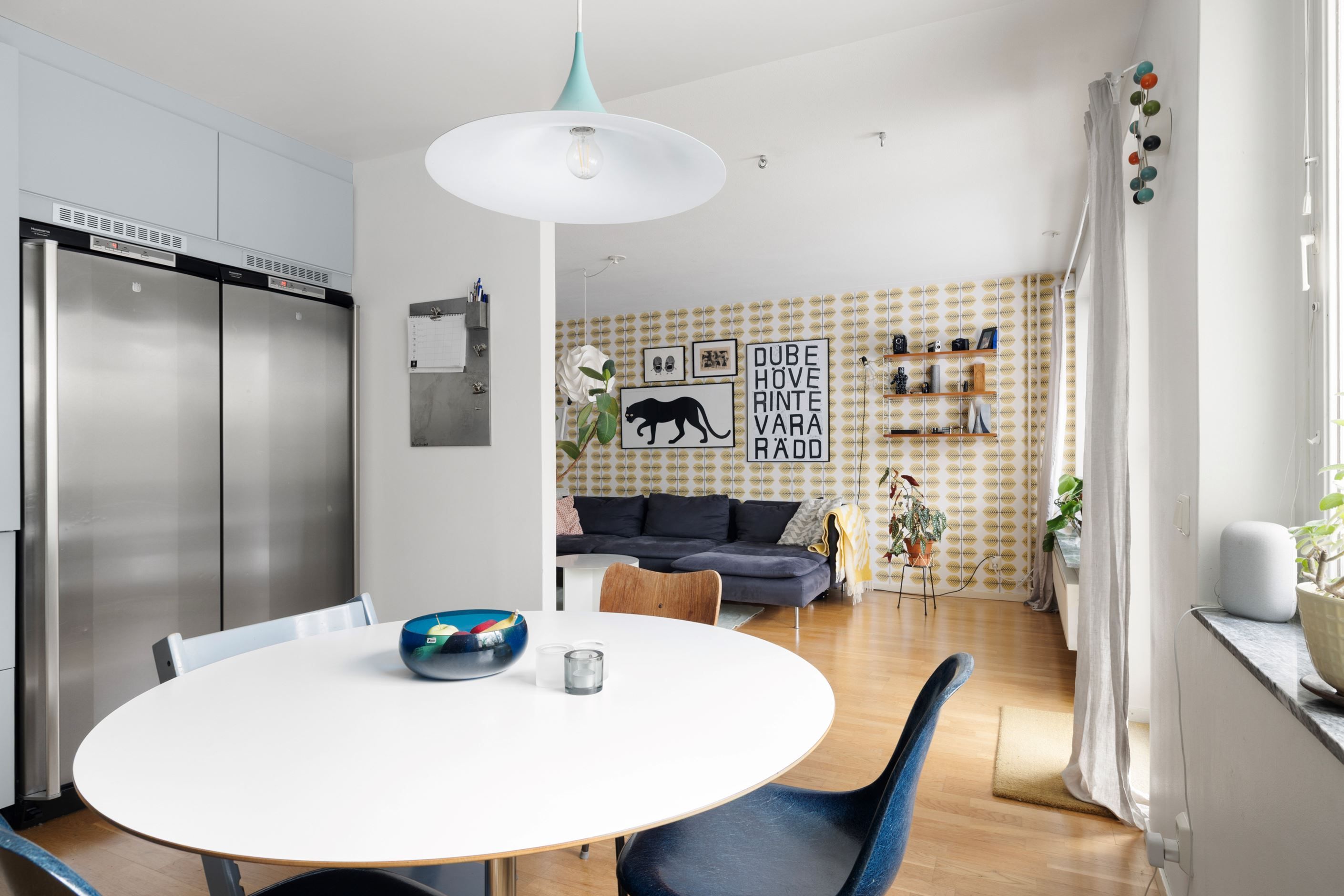 Köket, som renoverades 2024, är i toppskick med moderna materialval och stilren design. Här finns gott om arbetsyta och förvaring, en självklar samlingsplats för såväl vardagsmiddagar som festligare tillfällen. Genomgående möts du av mycket snygga tapeter och fina parkettgolv som skapar en varm, enhetlig och ombonad känsla i hela bostaden.