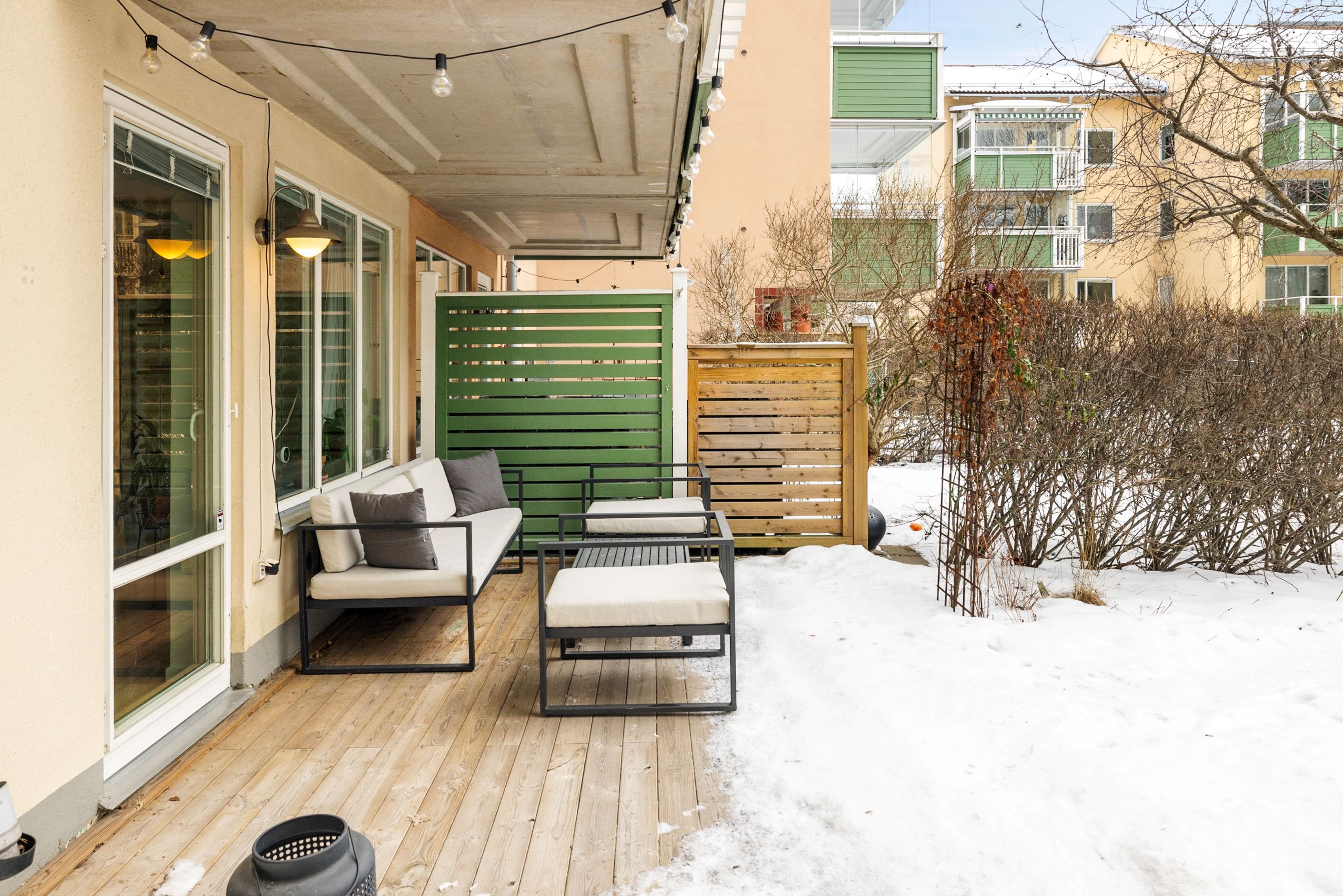 Det stora sällskapsrummet bjuder in till umgänge och rymmer enkelt både soffgrupp och matsalsmöbel, här finns plats för både familj och vänner. Från sällskapsrummet kliver du rakt ut till bostadens härliga uteplats med stor altan. Läget är soligt och vetter mot den lugna innergården, en trygg och rofylld miljö. Här får du verkligen radhuskänsla, men utan att behöva tänka på yttre underhåll.