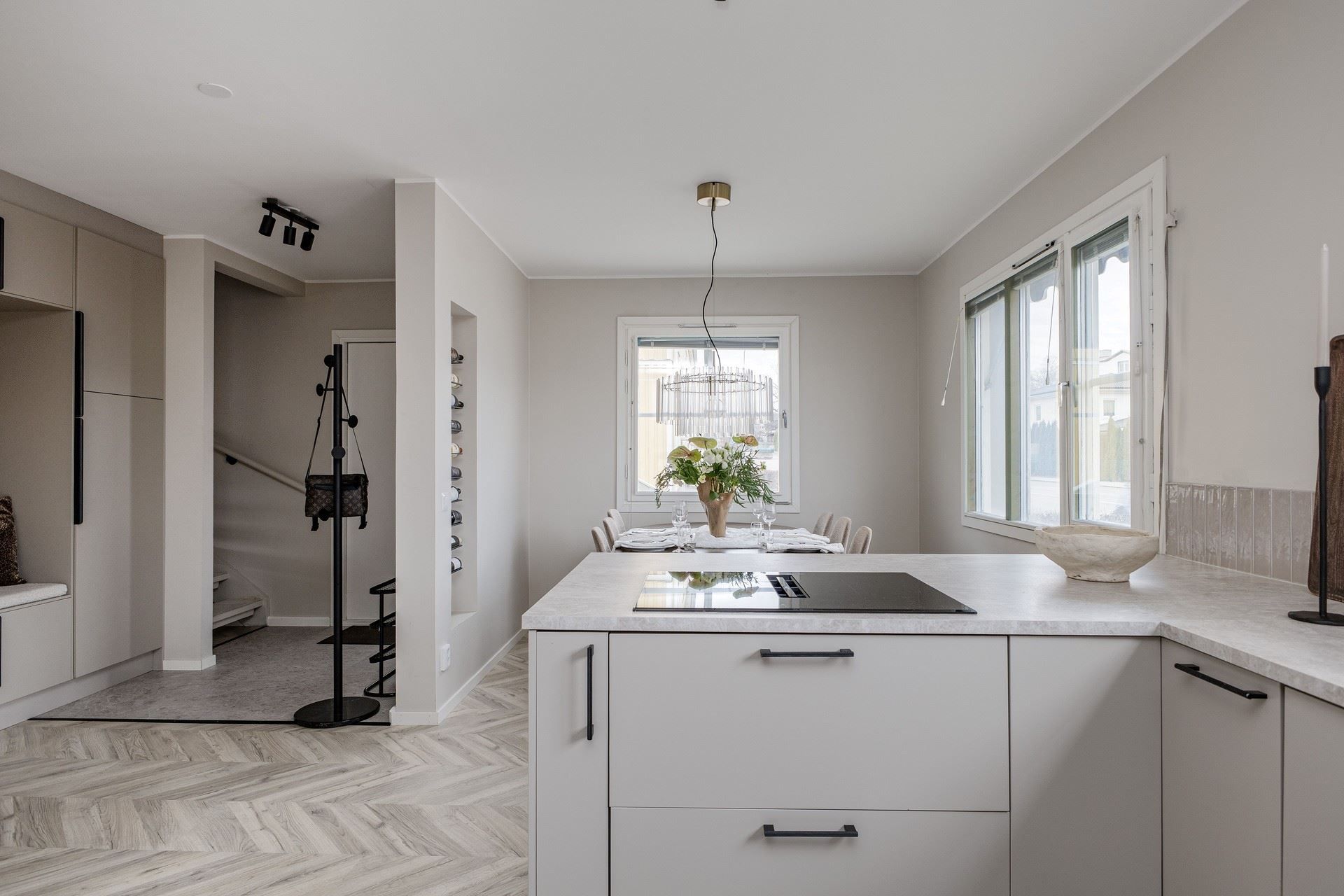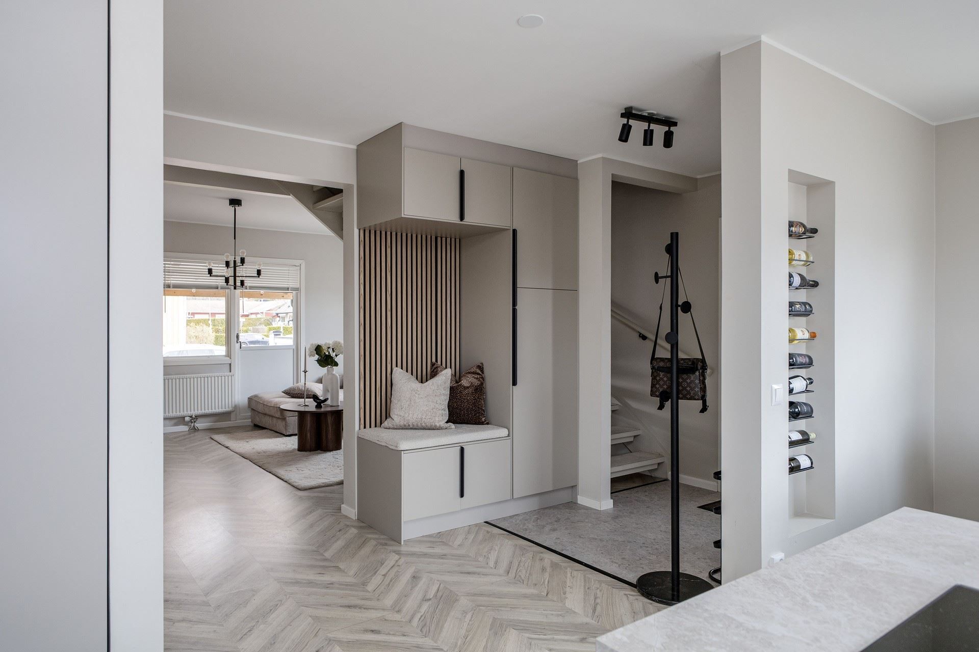 Här möts du av öppna, ljusa och sociala ytor där entréplanet utgör hemmets naturliga hjärta. Köket är en harmonisk kombination av elegans och funktion med noggrant utvalda materialval, generösa arbetsytor och gott om förvaring. Den öppna planlösningen mot matplatsen bjuder in till såväl vardagsliv som festliga tillställningar.