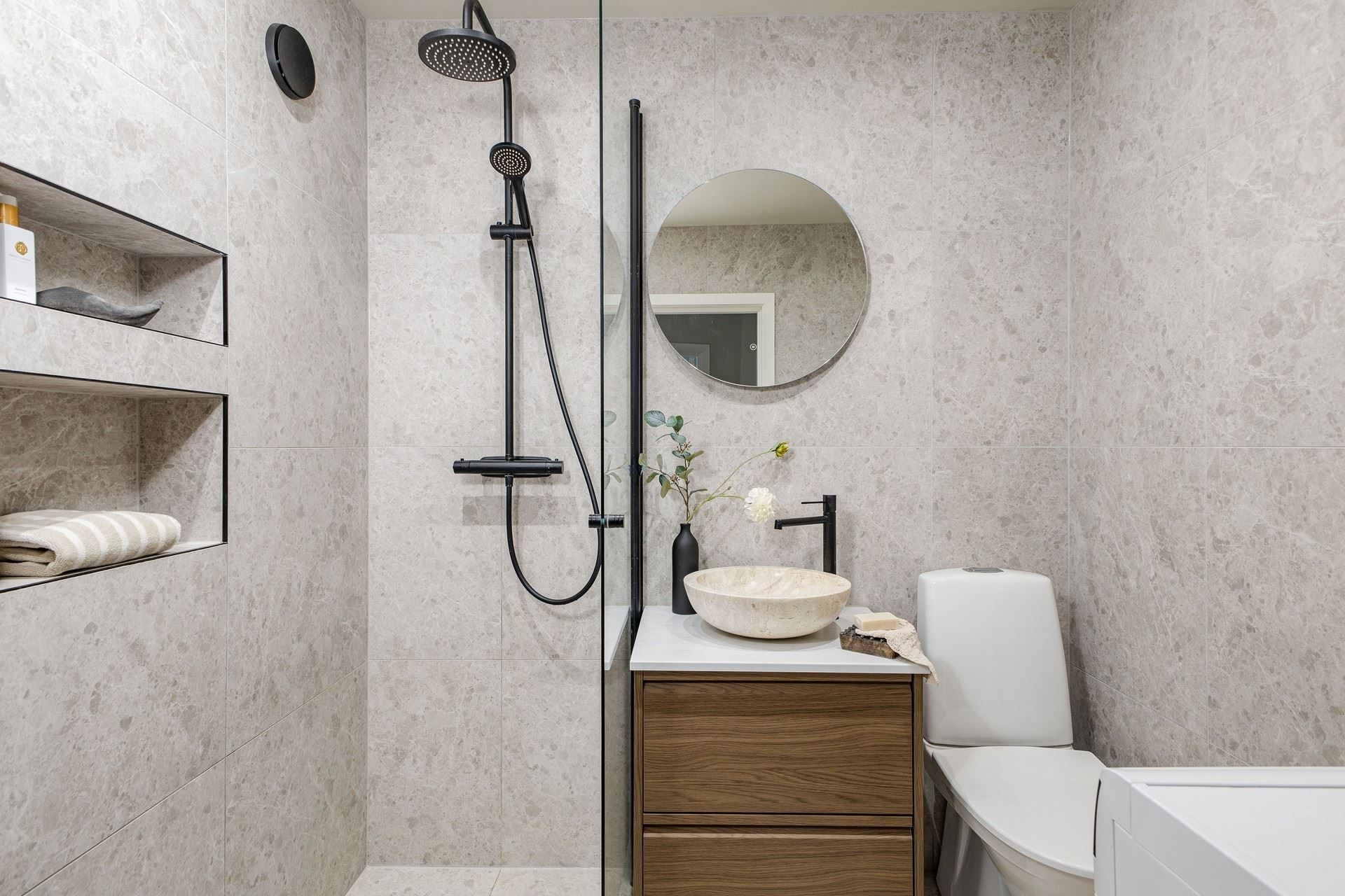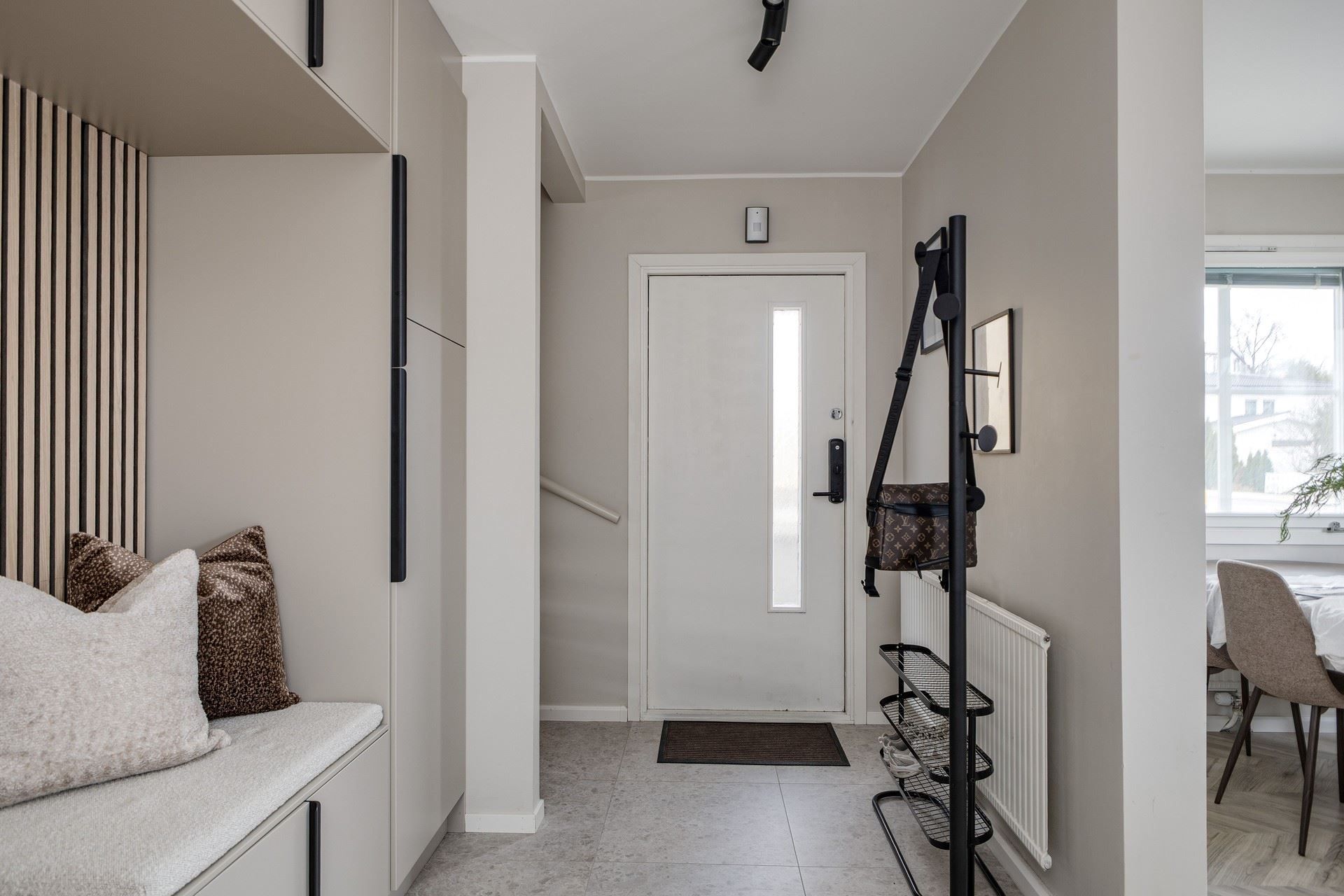Vidare finns två stilrent helkaklade badrum, ett på varje våningsplan, vilket bidrar till både komfort och funktion i vardagen.