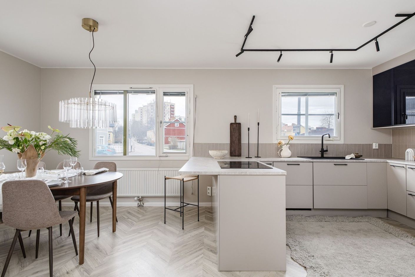 Välkommen till detta smakfullt renoverade gavelradhus i bostadsrättsform på Malmabergsgatan 39D - ett hem där stilrena materialval och genomtänkt design samspelar för att skapa en modern och inbjudande bostad!