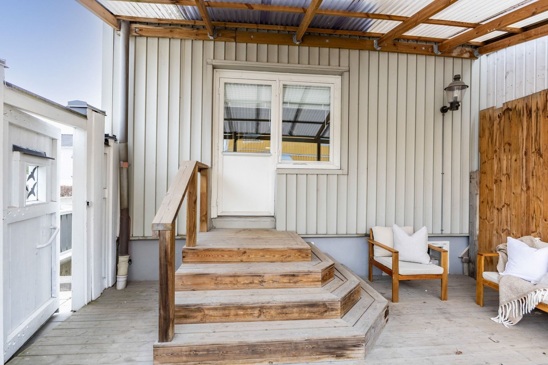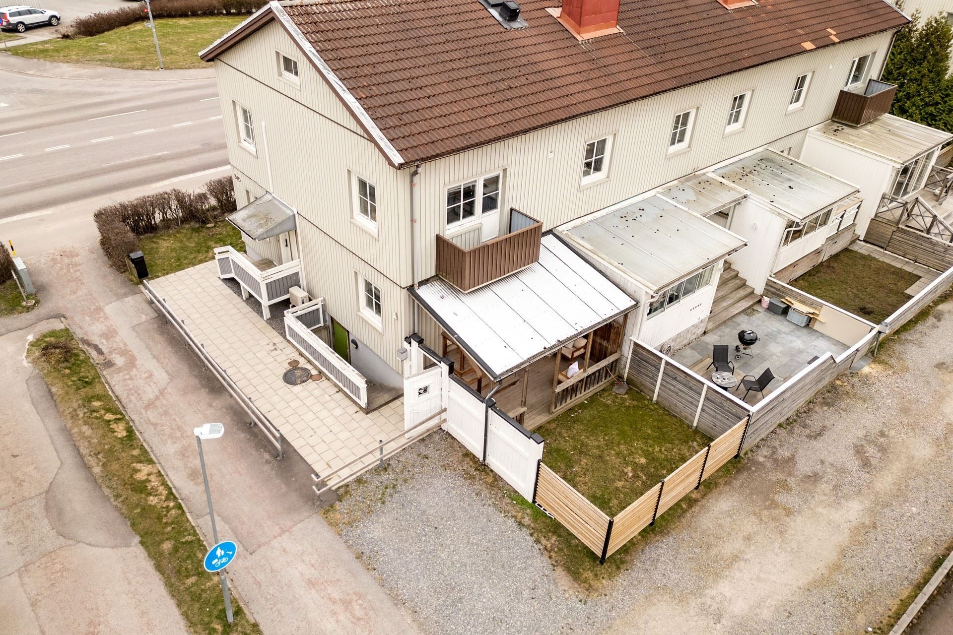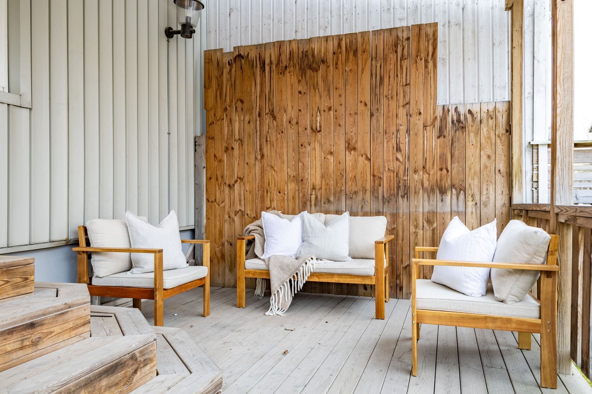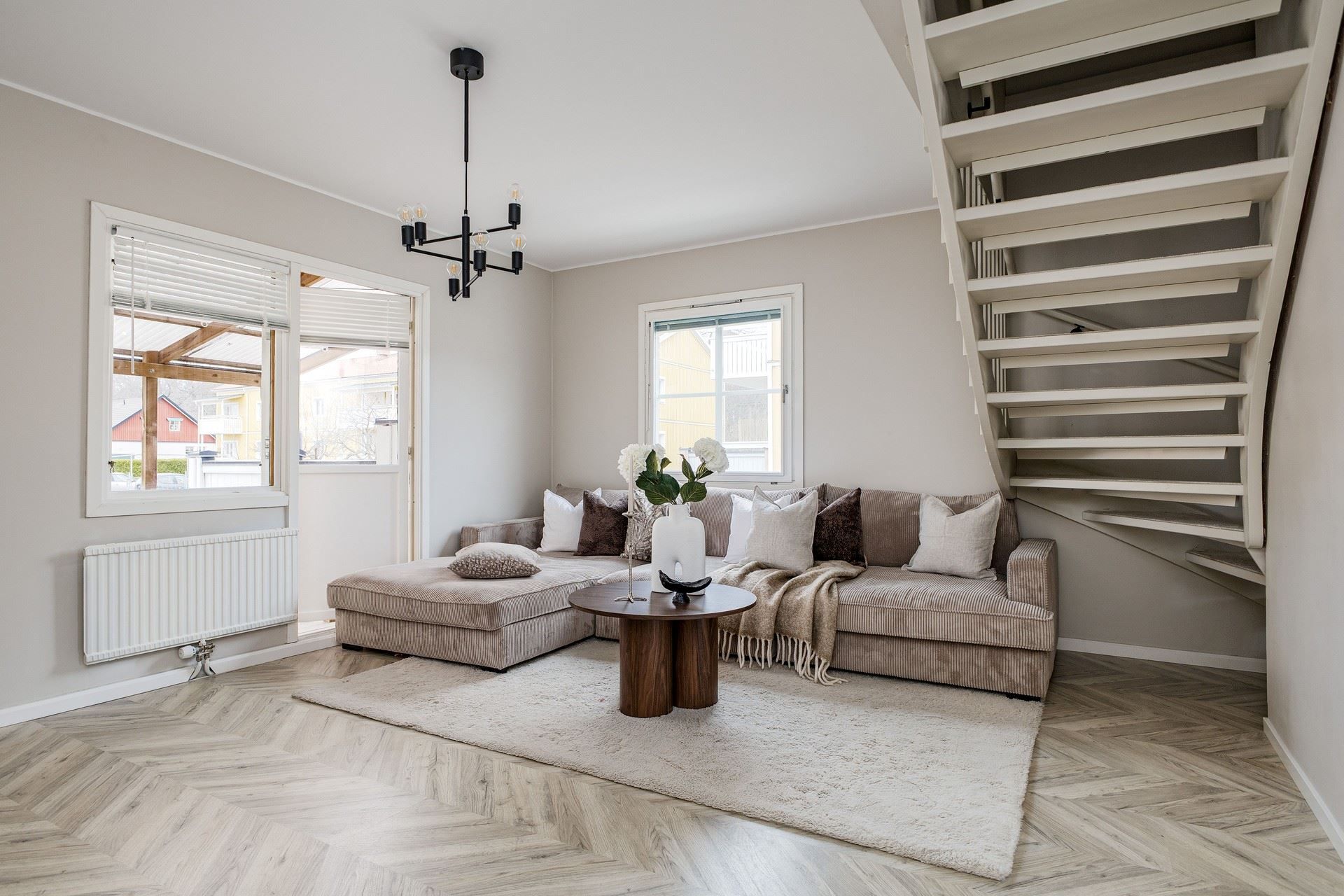 Vardagsrummet med direkt access till altanen blir en självklar samlingspunkt för familj och vänner, en plats där inne och ute möts på ett naturligt sätt. Intill altanen finns även en gräsyta som lämpar sig perfekt för odling, lek eller avkoppling.