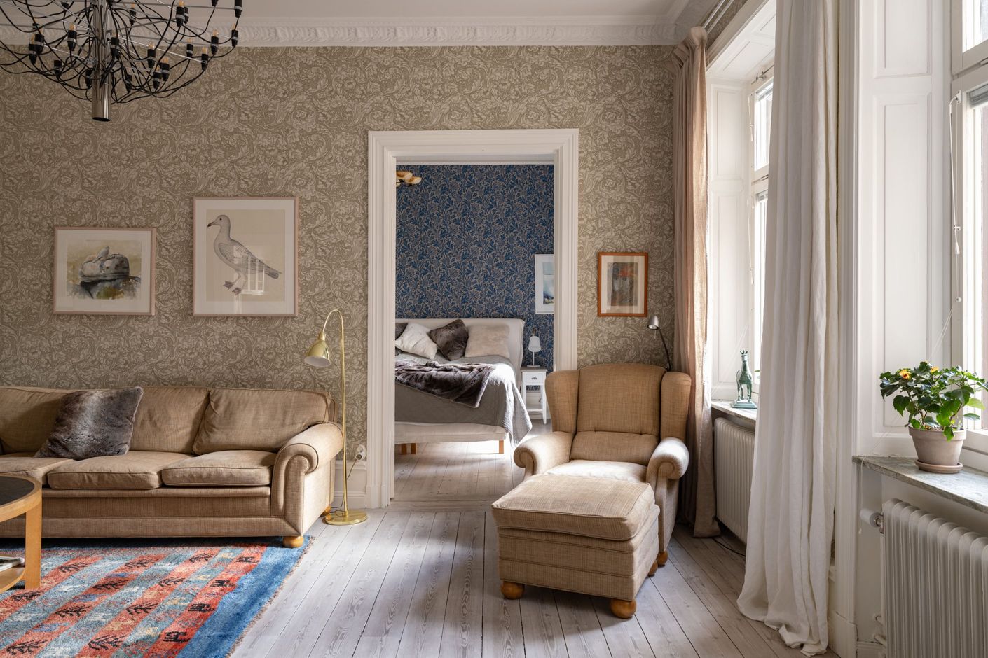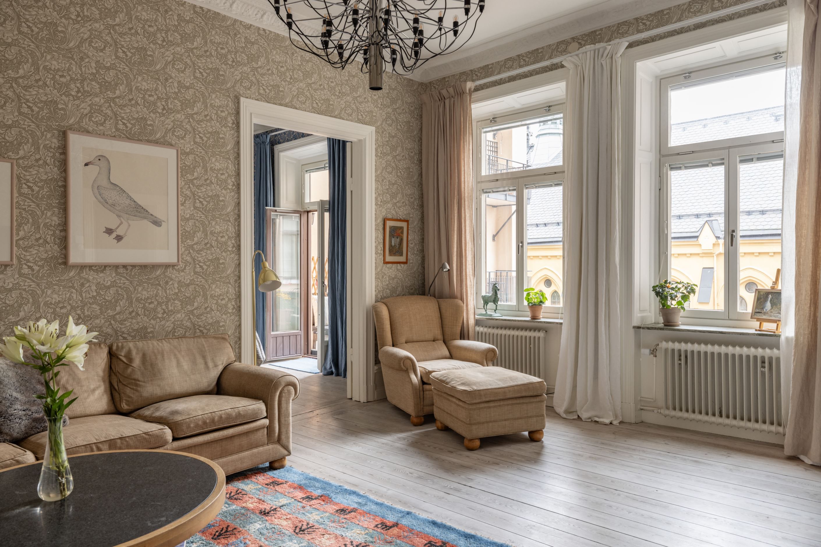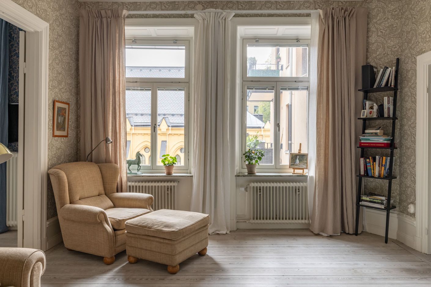 Bostaden kombinerar vackra originaldetaljer med modern livskvalitet. Generös takhöjd, fungerande kakelugn, vackert trägolv i original samt fönster i två väderstreck skapar en ljus och luftig känsla. Från sovrummet nås en stor balkong med bra solläge – perfekt för långa frukostar eller en härlig stund i solen under dagen. Utsikten mot den nyrenoverade St Paulskyrkan ger ett extra lugn och karaktär. Planlösningen är genomtänkt med rymliga rum och gott om plats för både vardagsliv och umgänge.