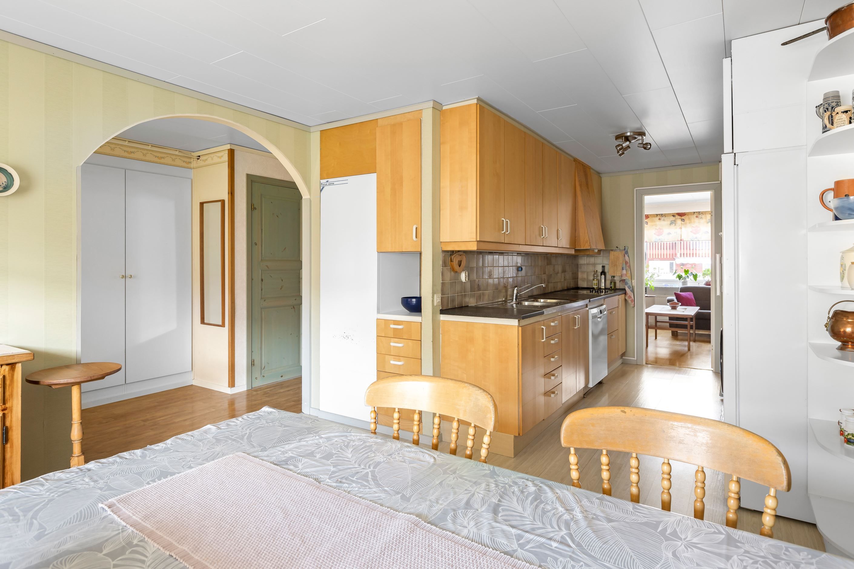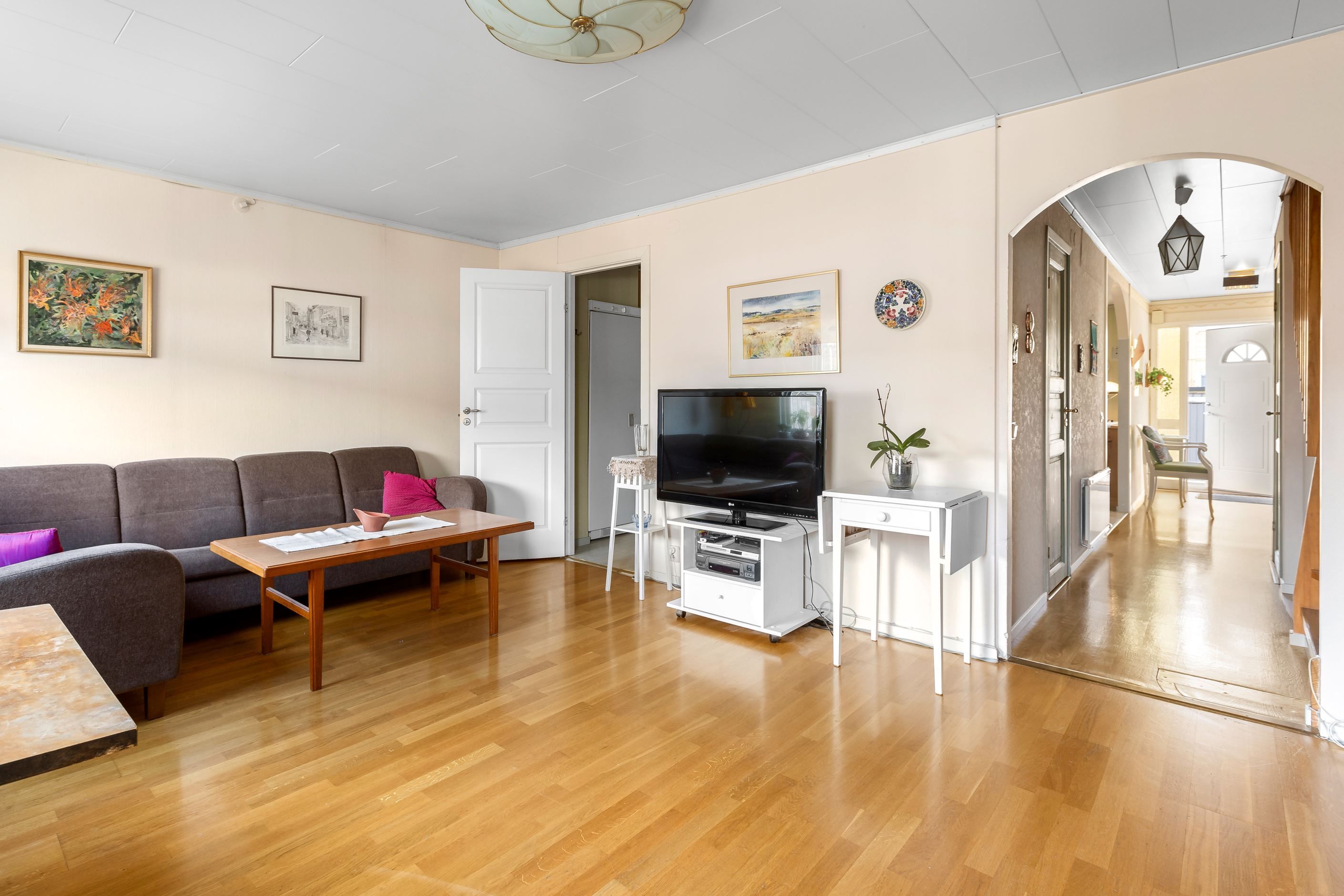 När du kliver in i huset möts du av en rymlig hall med fyra stora garderober och plats för avhängning. Vidare in i bostaden finner du ett praktiskt förråd under trappan för extra förvaring. Till höger från hallen ligger köket med en angränsande matplats som rymmer stor matgrupp. Det öppna och ljusa vardagsrummet har gott om plats för både soffgrupp och läshörna, om så önskas. Från vardagsrummet leder en dörr ut till altanen på baksidan med morgonsol. Entréplanet har även ett badrum med dusch och wc.