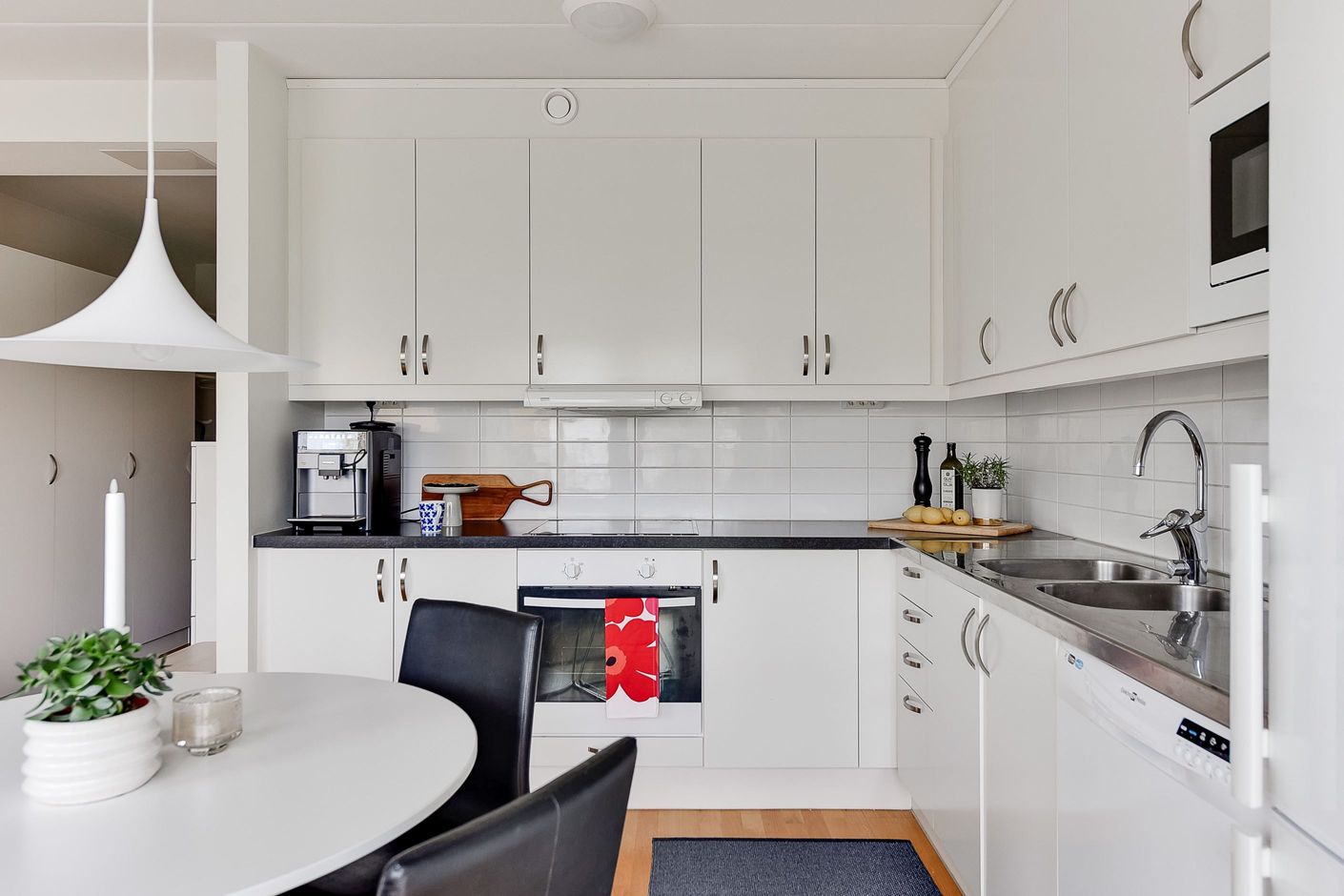 Det moderna köket är fullt utrustat och erbjuder goda arbetsytor samt smart förvaring – allt i en stilren design som harmonierar fint med bostadens ljusa färgskala och parkettgolv. De stora fönsterpartierna släpper in generöst med ljus och ger en härlig rymd åt rummet. Från vardagsrummet nås balkongen i västerläge – en uppskattad förlängning av bostaden där kvällssolen dröjer sig kvar länge under sommarhalvåret.