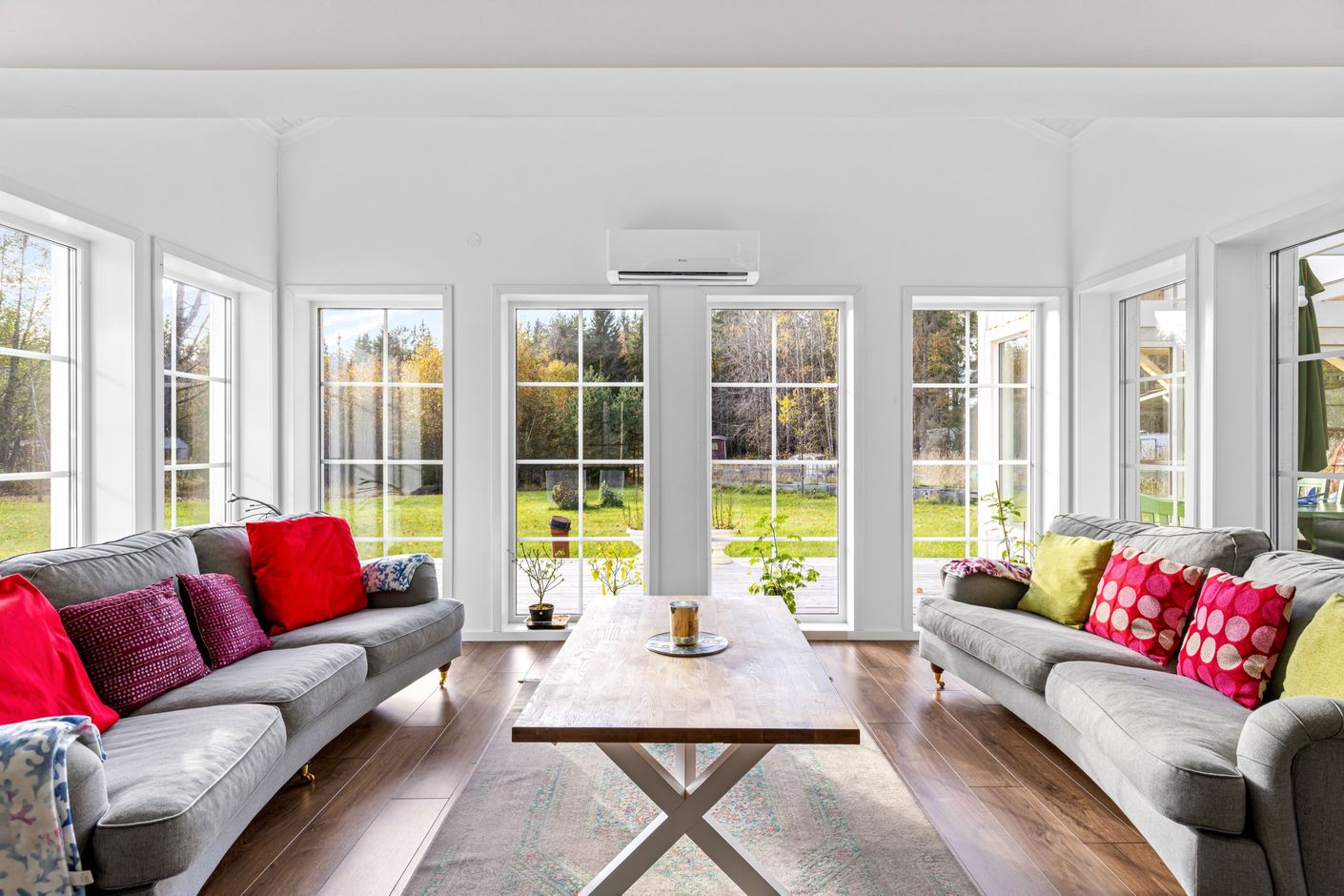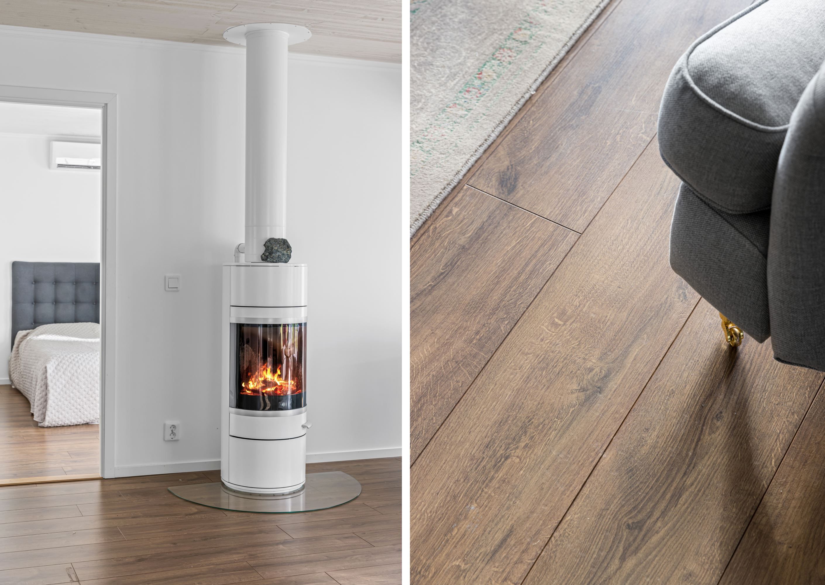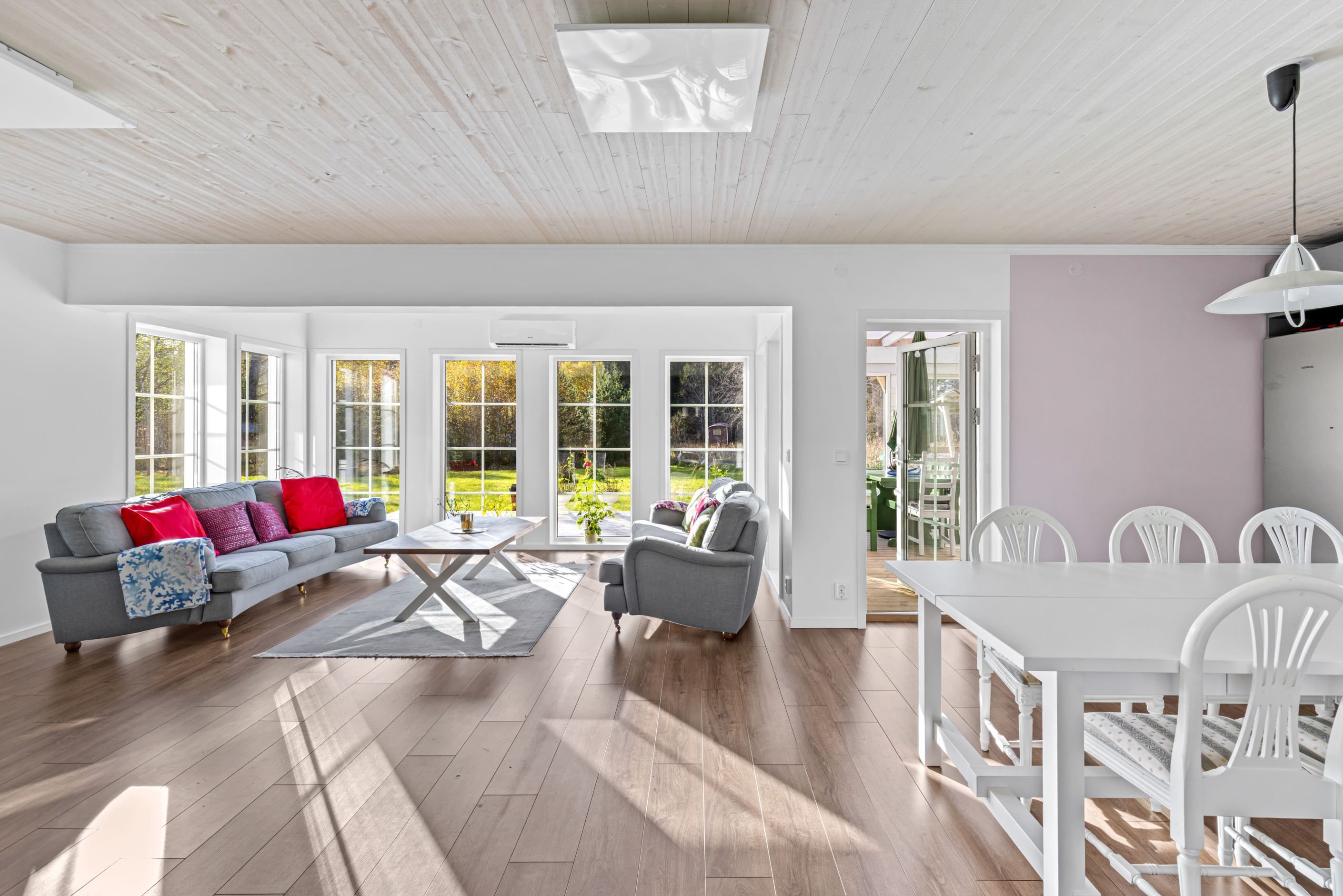 Planlösningen rymmer 3–4 rum, vilket gör bostaden flexibel och lätt att anpassa efter behov – exempelvis med plats för hemmakontor eller gästrum. De stora fönsterpartierna släpper in rikligt med dagsljus och ger vackra vyer mot omgivande natur.
