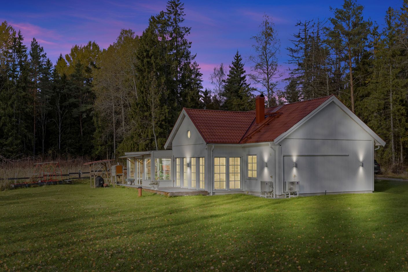 Tomten är generös och omgiven av skog och natur, vilket skapar en lugn och avskild atmosfär. Här finns gott om plats för lek, odling eller bara avkoppling i grönskan.
