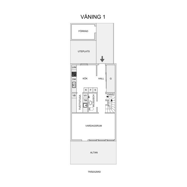 När du kliver in möts du av en öppen och välkomnande hall med gott om plats för ytterkläder och förvaring. Entréplanet rymmer ett helkaklat badrum med dusch, en praktisk tvättstuga samt ett rymligt och modernt kök. Köket är stilrent, generösa arbetsytor och gott om förvaring i både över- och underskåp. Här finns plats för ett stort matbord intill det stora fönsterpartiet. Från det luftiga vardagsrummet når du bostadens trevliga altan och allmän grästäppa i gavelläge – perfekt för både barnens lek och härliga sommarkvällar.