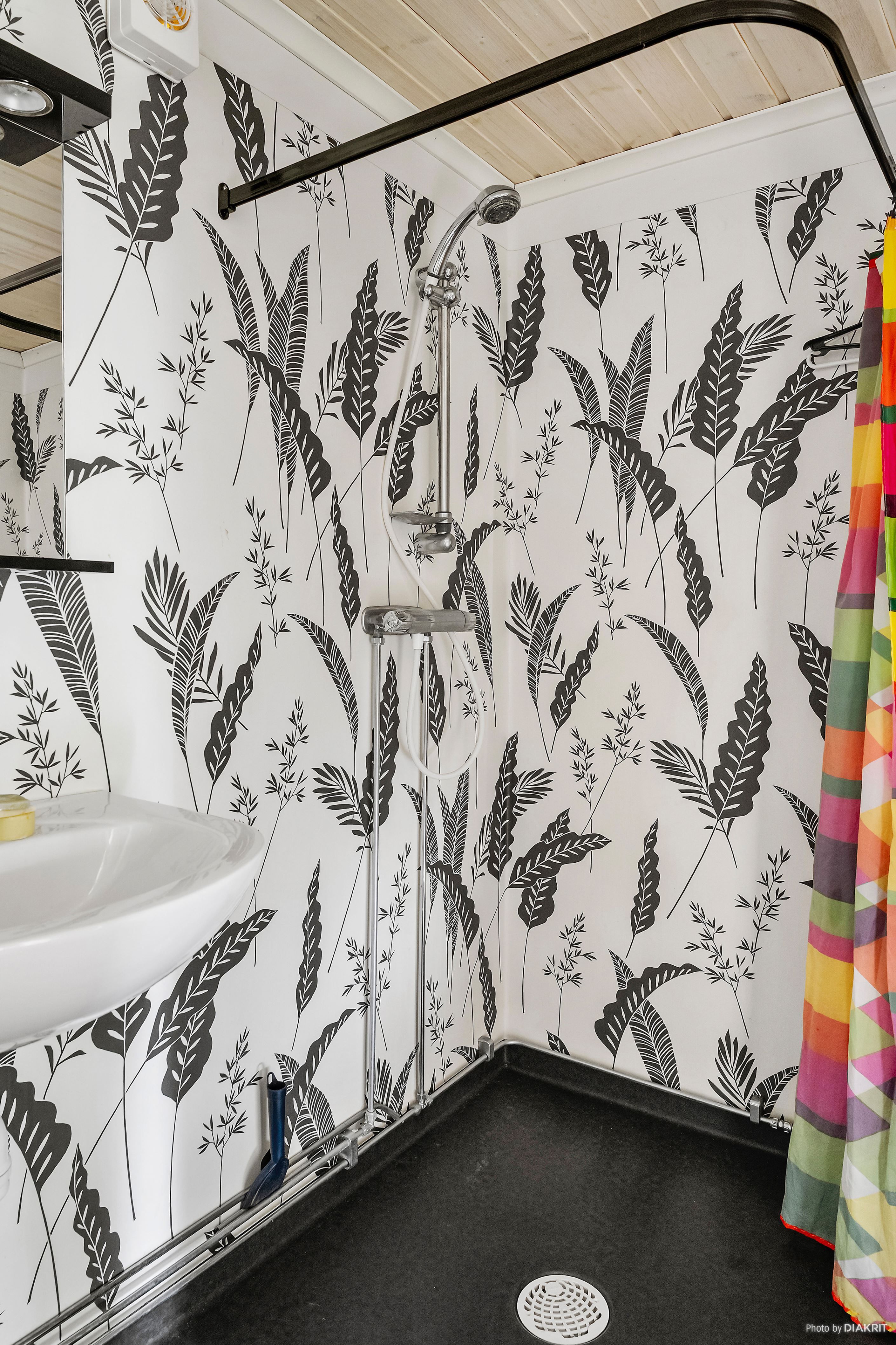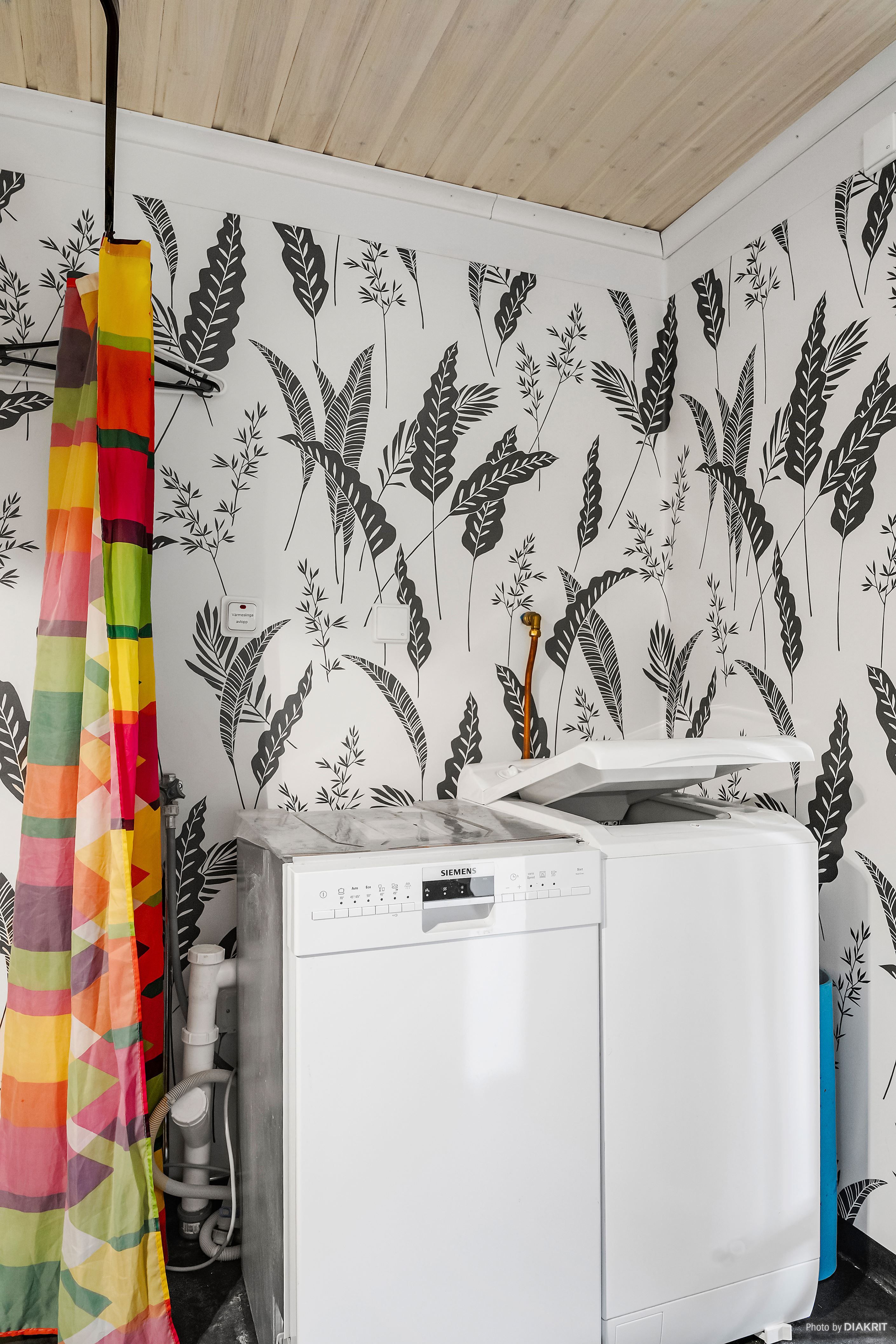 Allrummet har ett generöst ljusinsläpp från fyra håll, vilket tillsammans med full takhöjd ger en luftig och öppen känsla. Det brunt betsade trägolvet som är genomgående i hela stugan ger rummet värme och karaktär. Från allrummet leder en balkongdörr ut på terrassen. Köket, praktiskt placerat längs en hel vägg i allrummet, är inrett med ängsgröna köksluckor med gott om förvaring, rostfri nedsänk ho, traditionell spis med fläktkåpa, modern kyl/frys. Sovrummet har en lugn och avkopplande atmosfär med vitmålad liggande panel på väggarna och vitbetsad panel i taket.