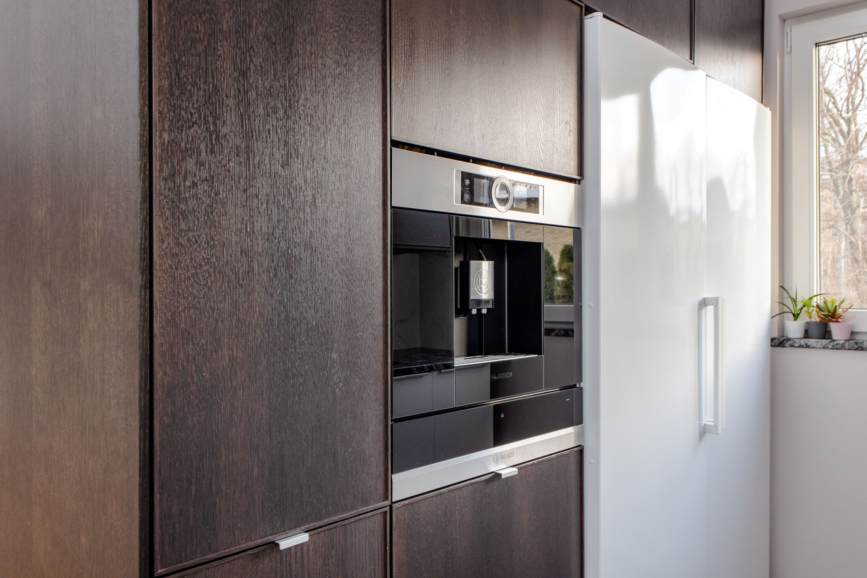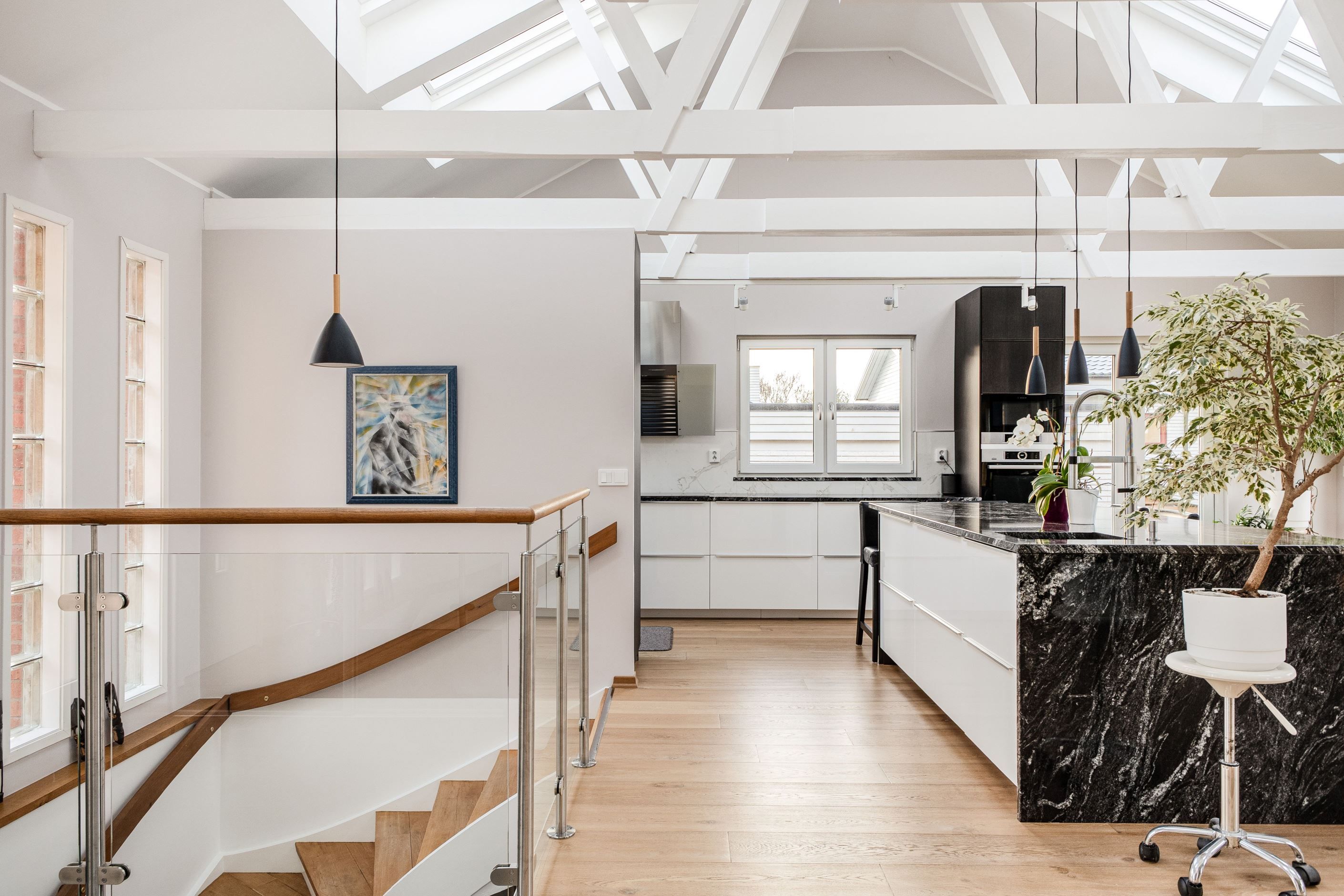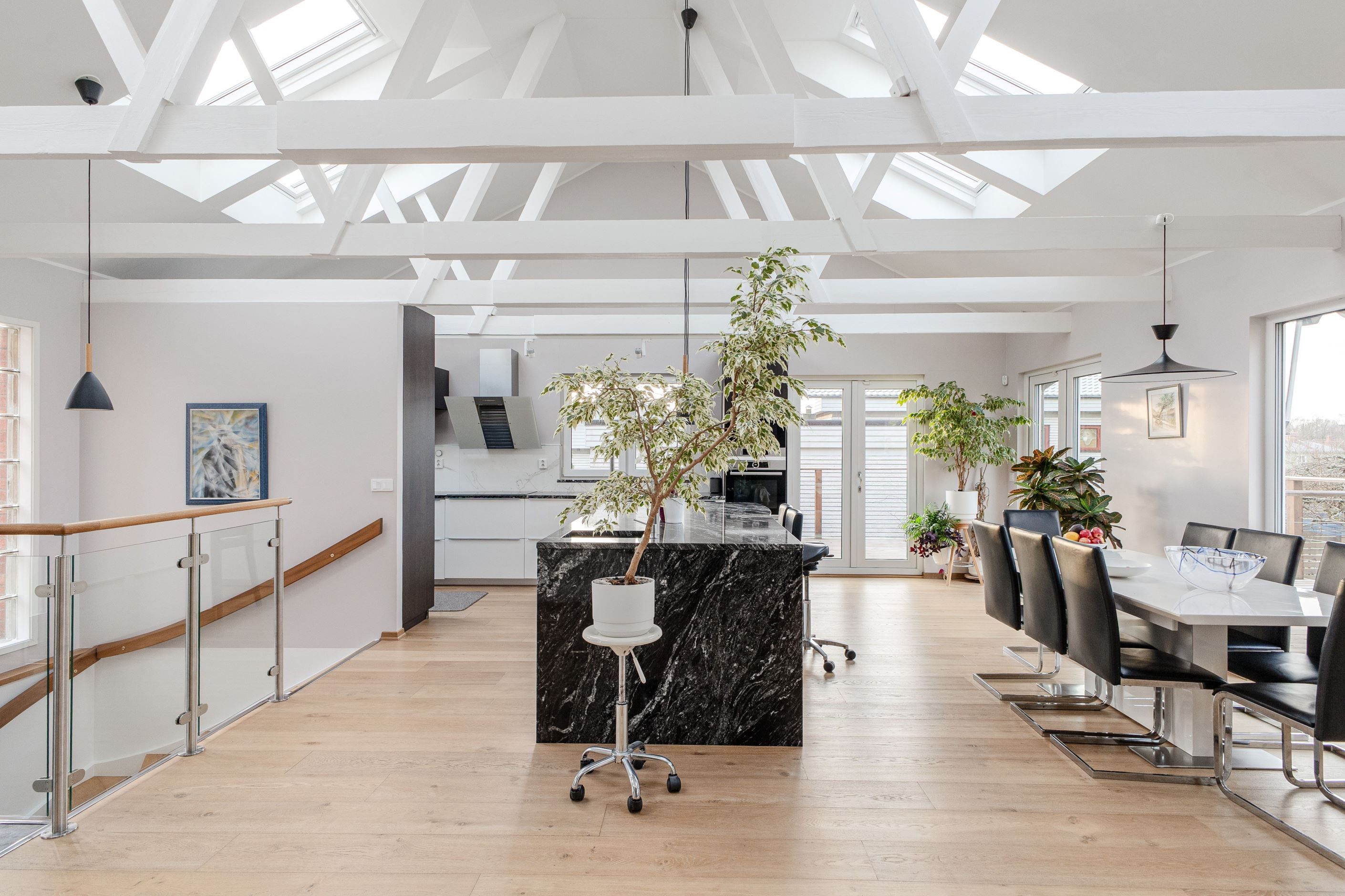 Redan när dörren öppnas möts du av ett hem som andas både rymd och exklusiv karaktär. De framtagna takstolarna reser sig sex meter upp mot nock och skapar en fantastisk atmosfär där ljuset flödar in genom takfönster som är utrustade med markiser. Här sveps du in i en miljö som är både storslagen och ombonad på samma gång - ett socialt hjärta att längta hem till.