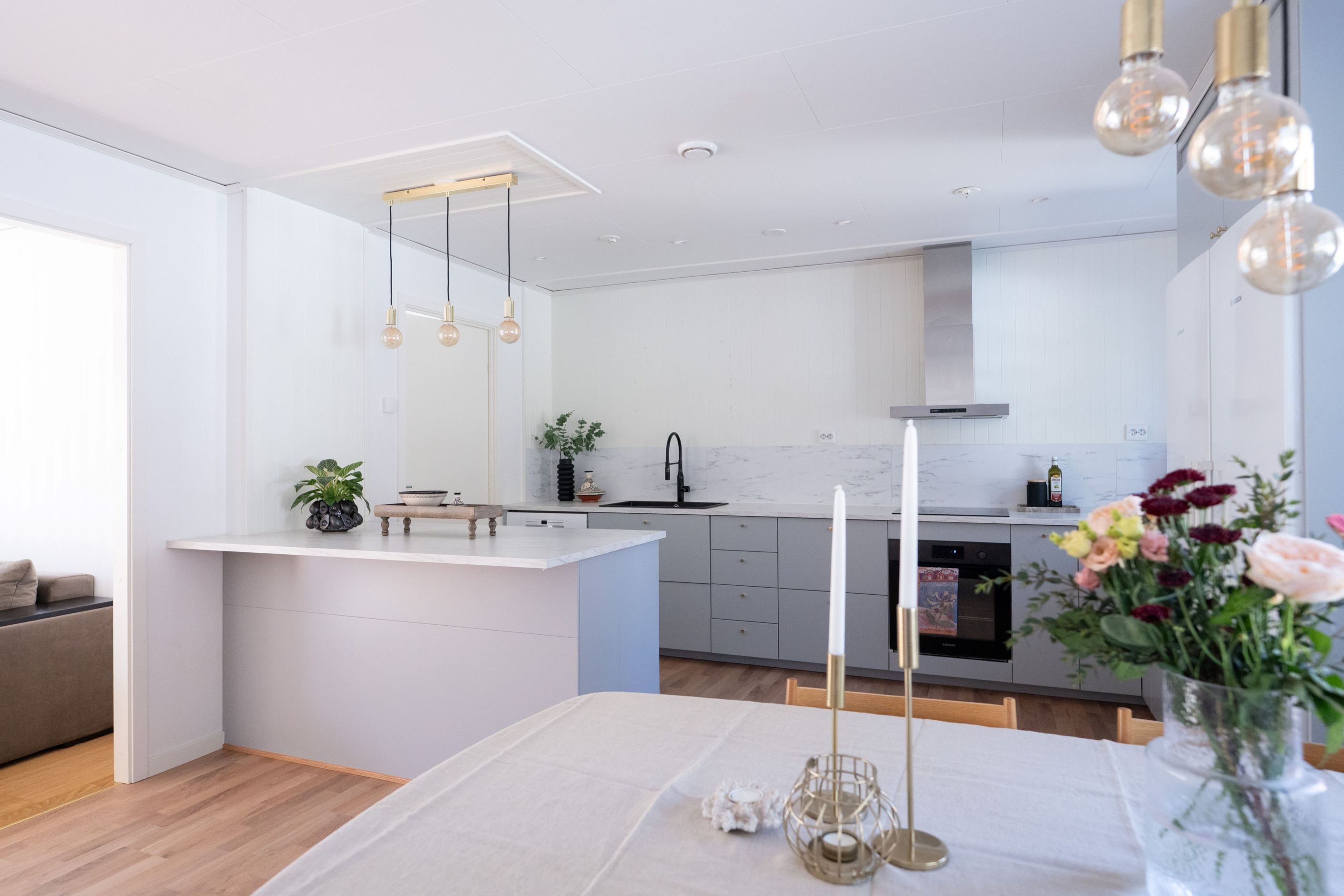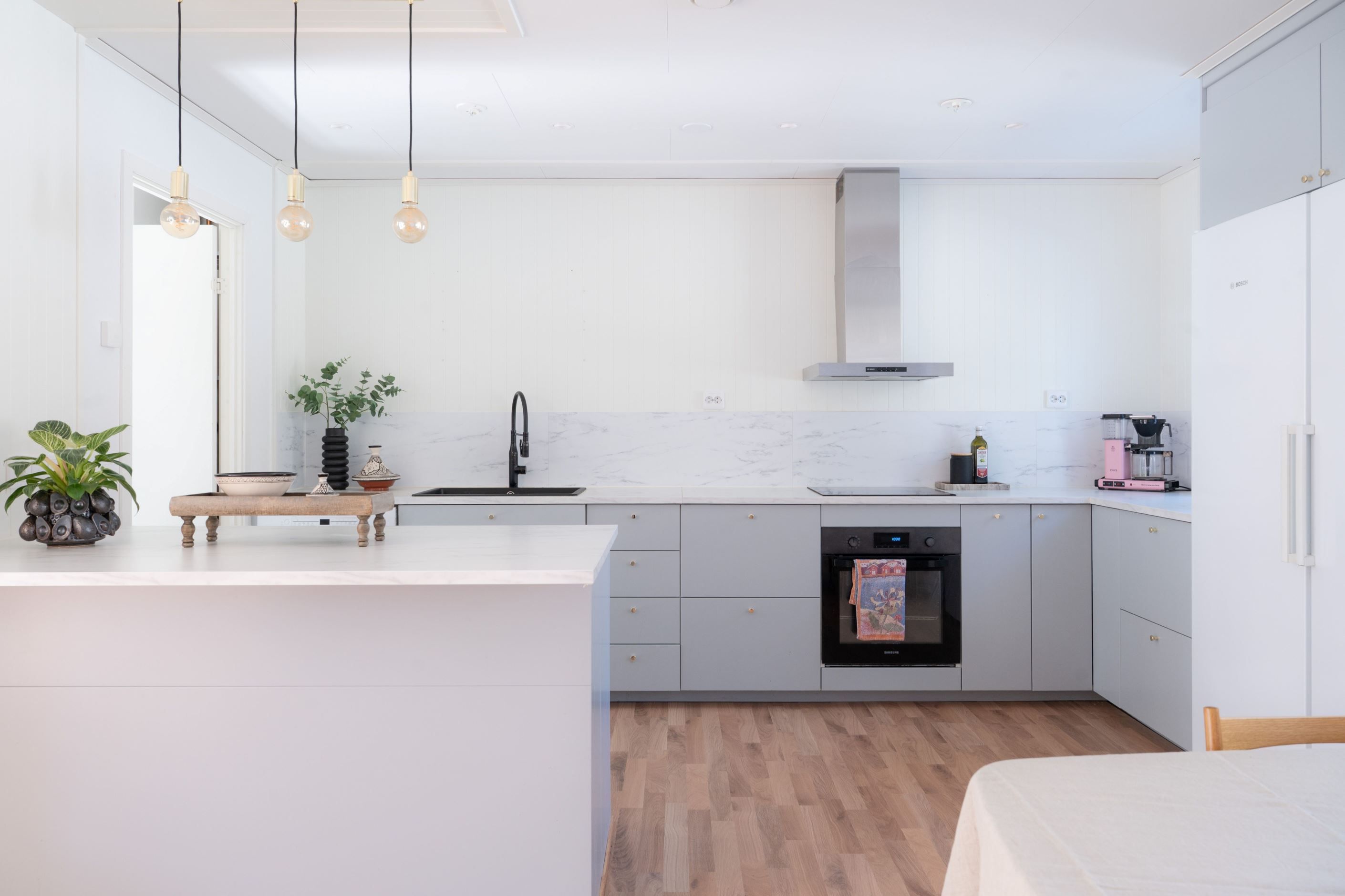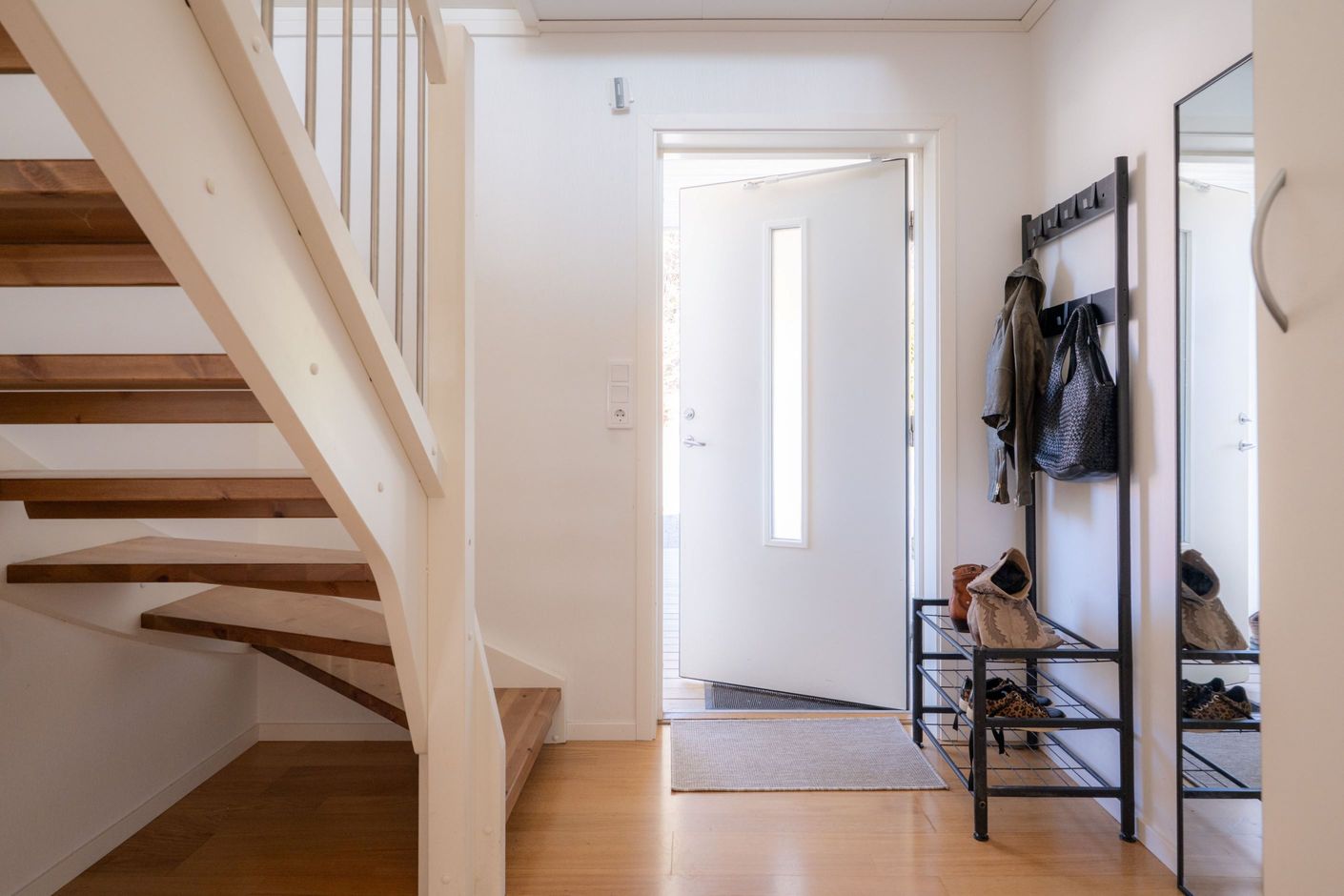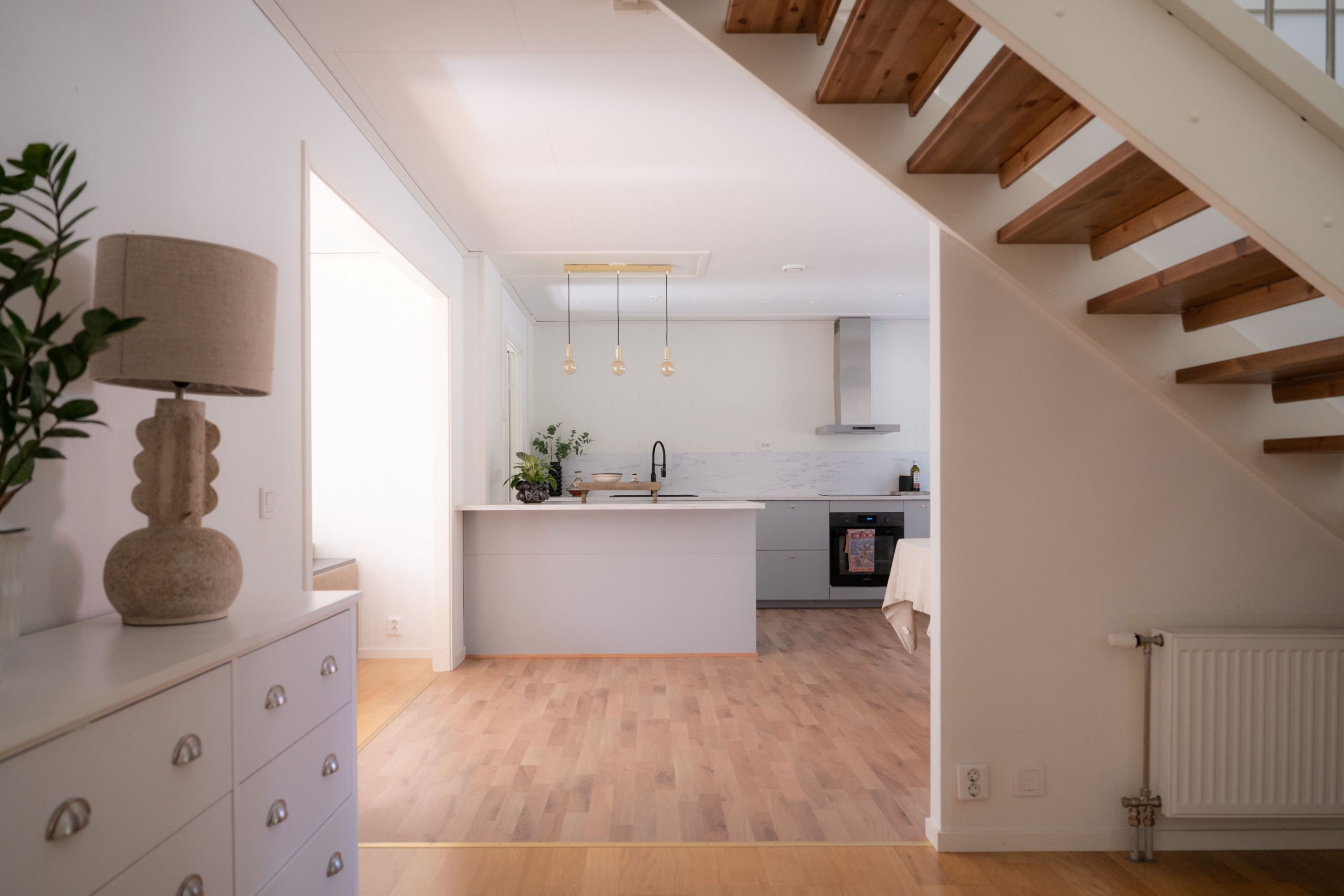 Entréplanet präglas av öppna och ljusa ytor där kök, matplats och vardagsrum smälter samman på ett naturligt sätt. Det fina köket har goda arbetsytor och en köksö. Intill finns matplats med plats för ett större matbord. I anslutning ligger vardagsrummet, där stora fönsterpartier släpper in rikligt med ljus och skapar en trivsam atmosfär. Härifrån nås även bostadens uteplats– en härlig förlängning av vardagsrummet under årets varmare månader.