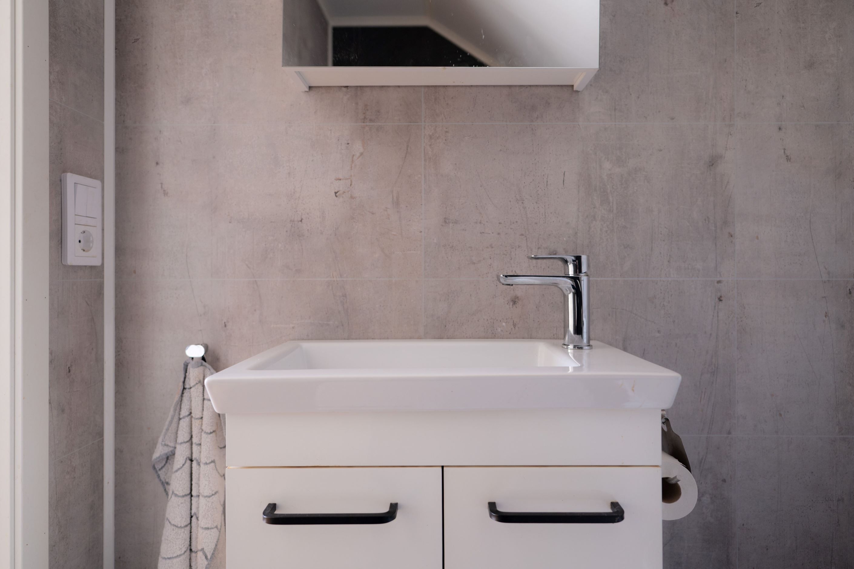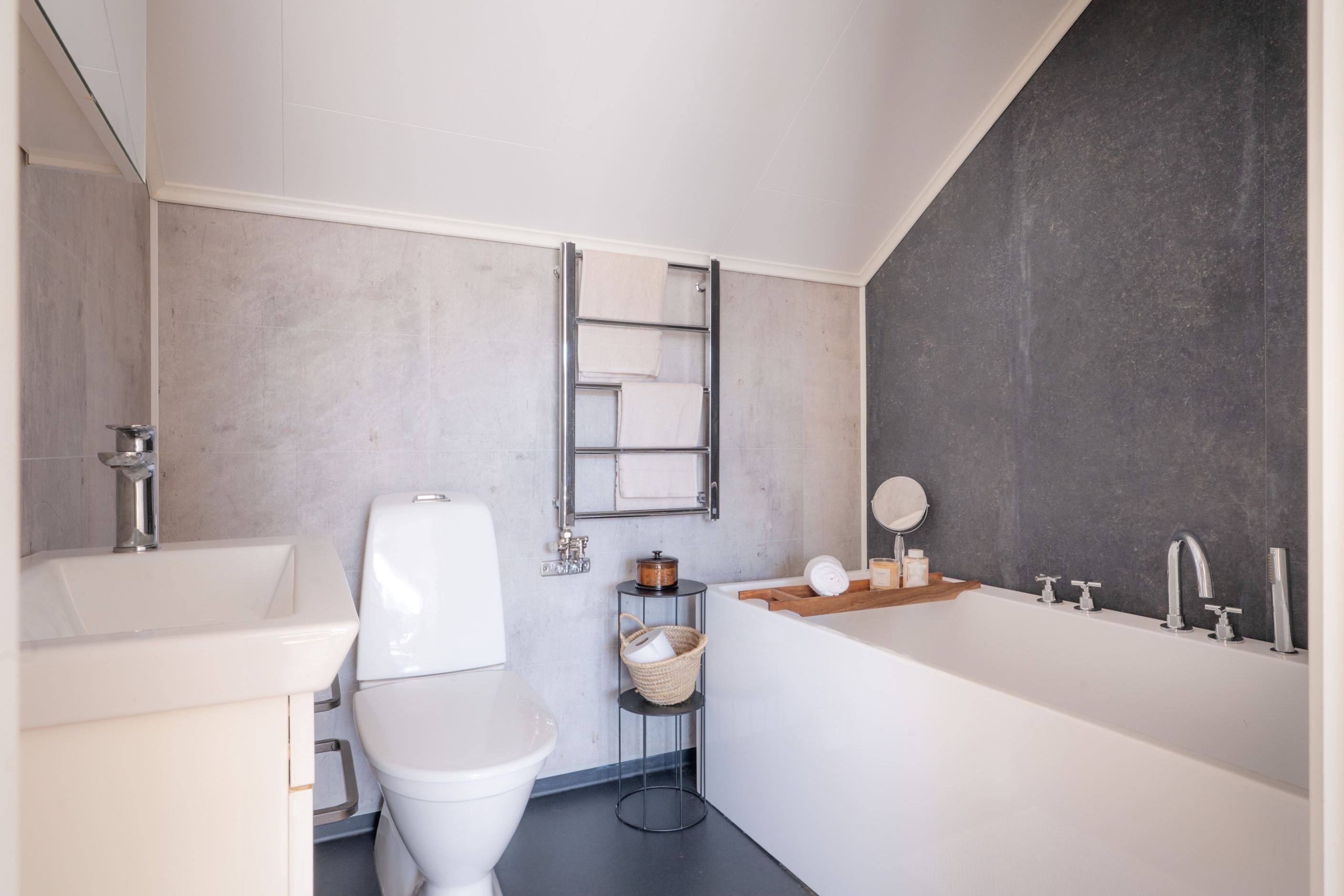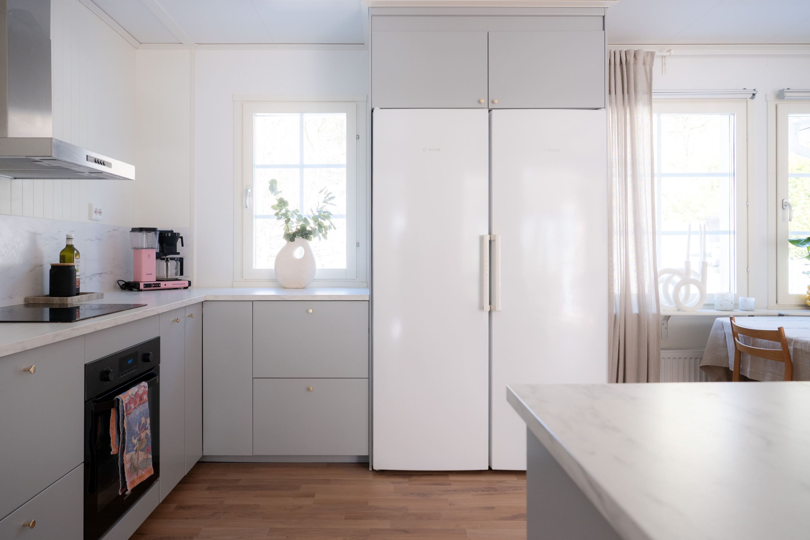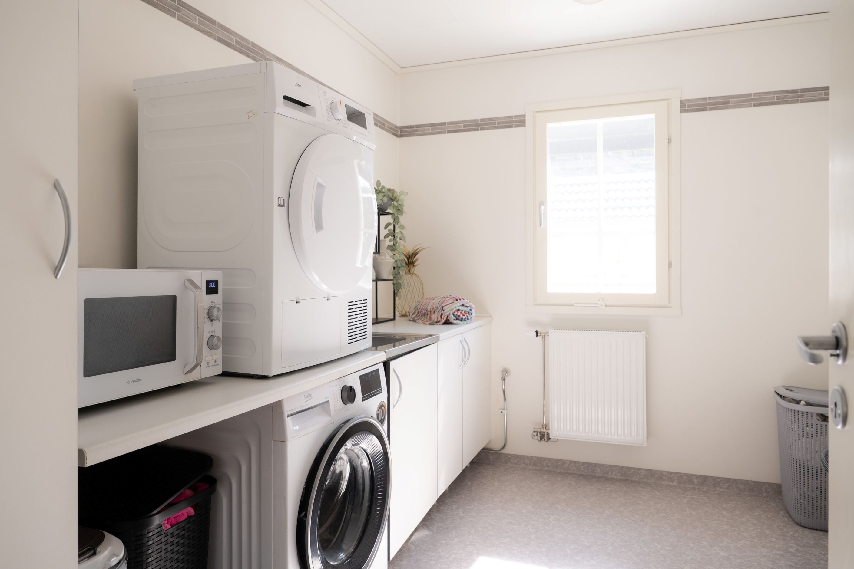På entréplanet finns även två sovrum i bra storlek, ett kontor, ett badrum med dusch samt en praktisk tvättstuga som dessutom erbjuder direkt access till garaget, vilket underlättar vardagen.