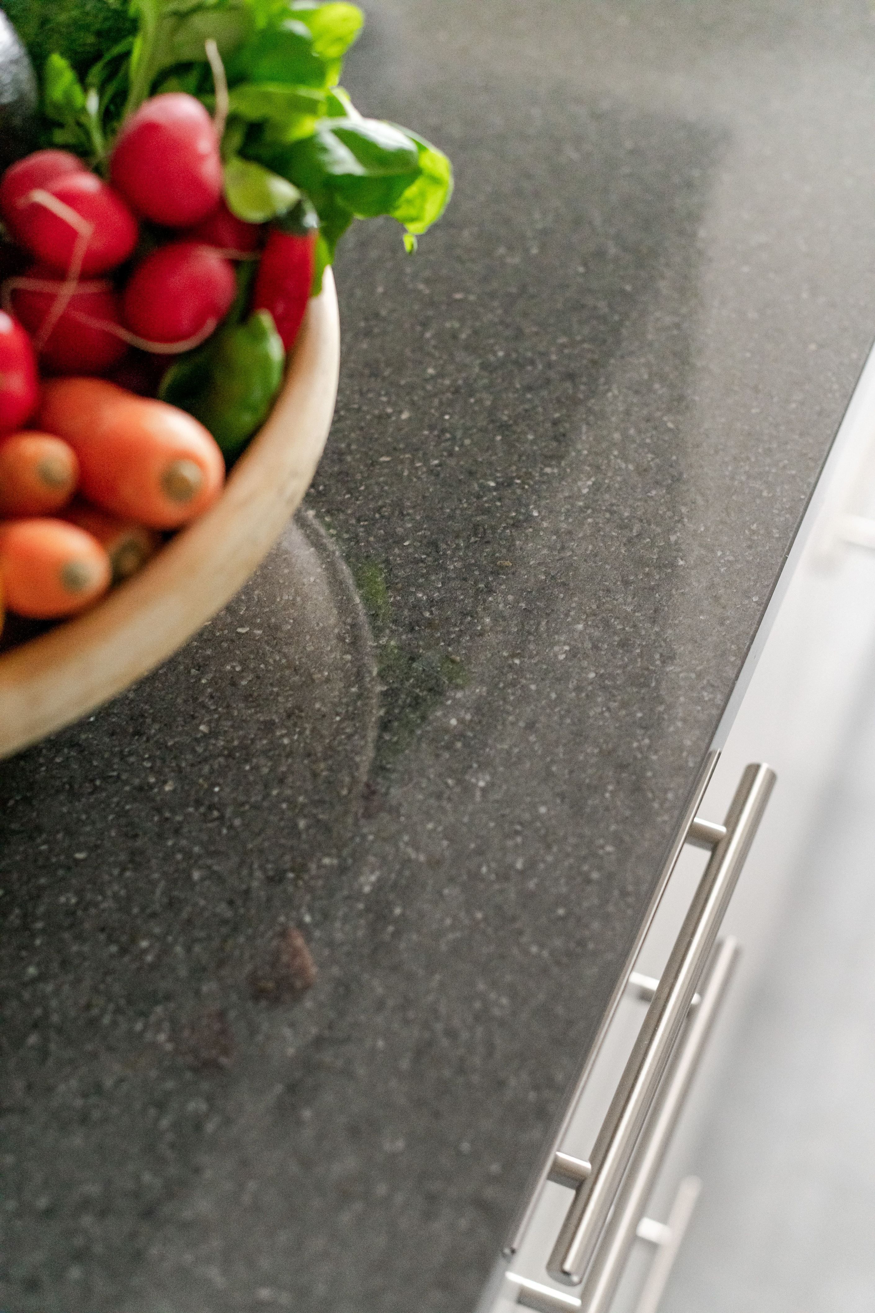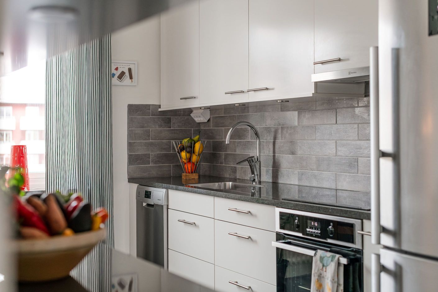 Hallen är välkomnande och öppnar upp fint mot resten av bostaden. Vidare in i bostaden till höger ligger köket, som är ljust och praktiskt med vita skåpsluckor och grått kakel som harmoniserar mot laminatbänkskiva i stenimitation. Köket har rostfri och full maskinell utrustning, både praktiskt och modernt. Här finns gott om köksförvaring och arbetsyta som gör matlagningen till ett nöje.