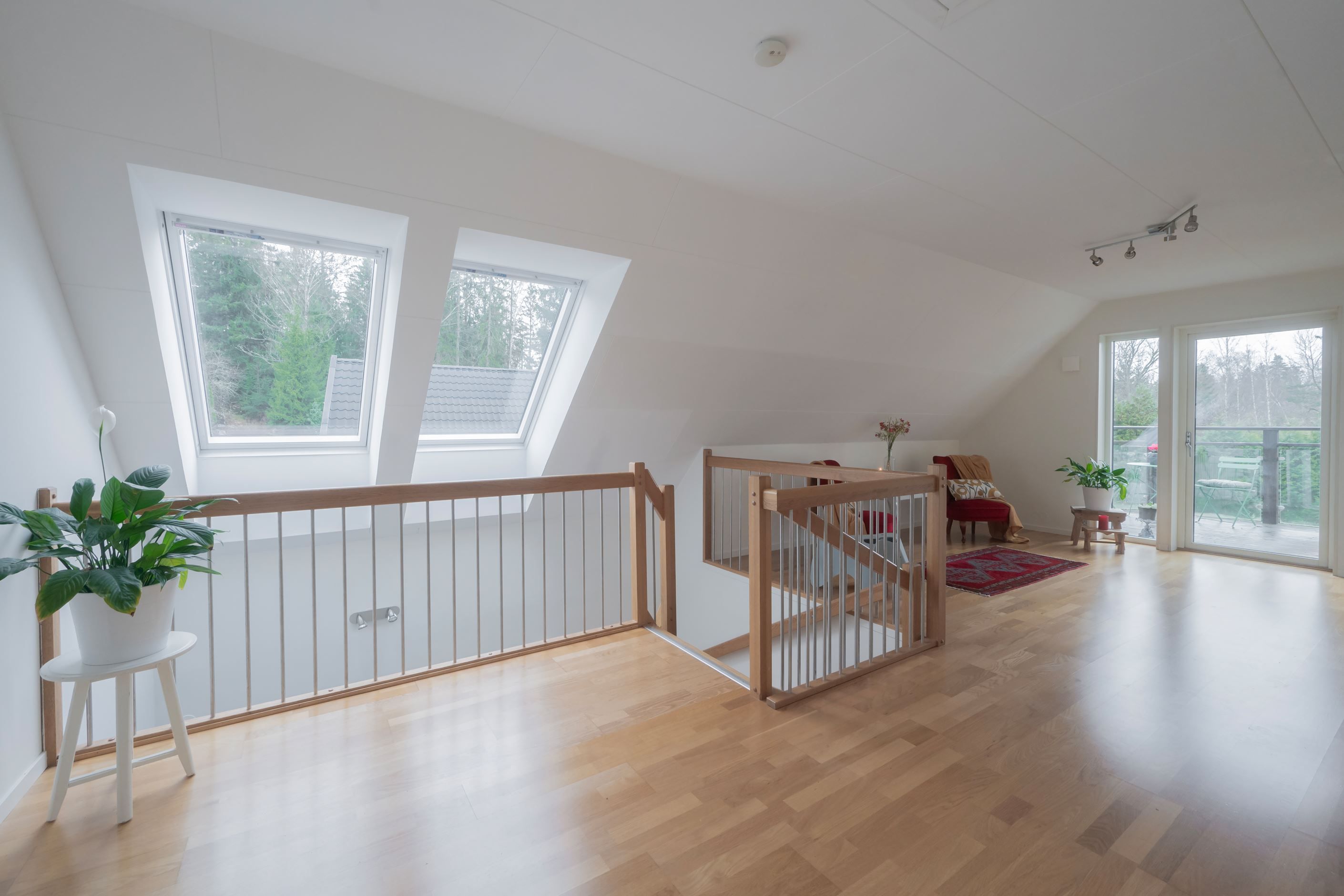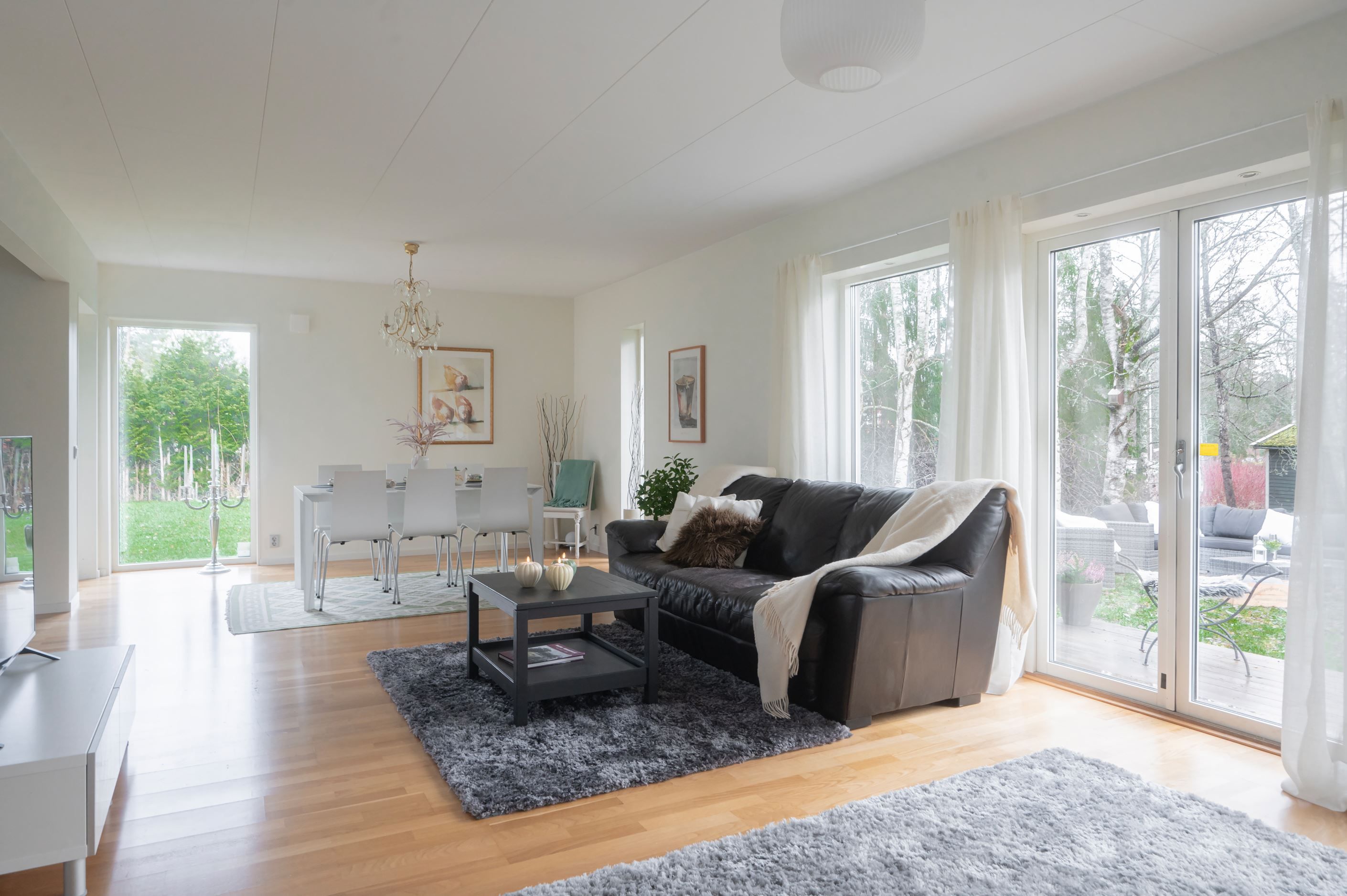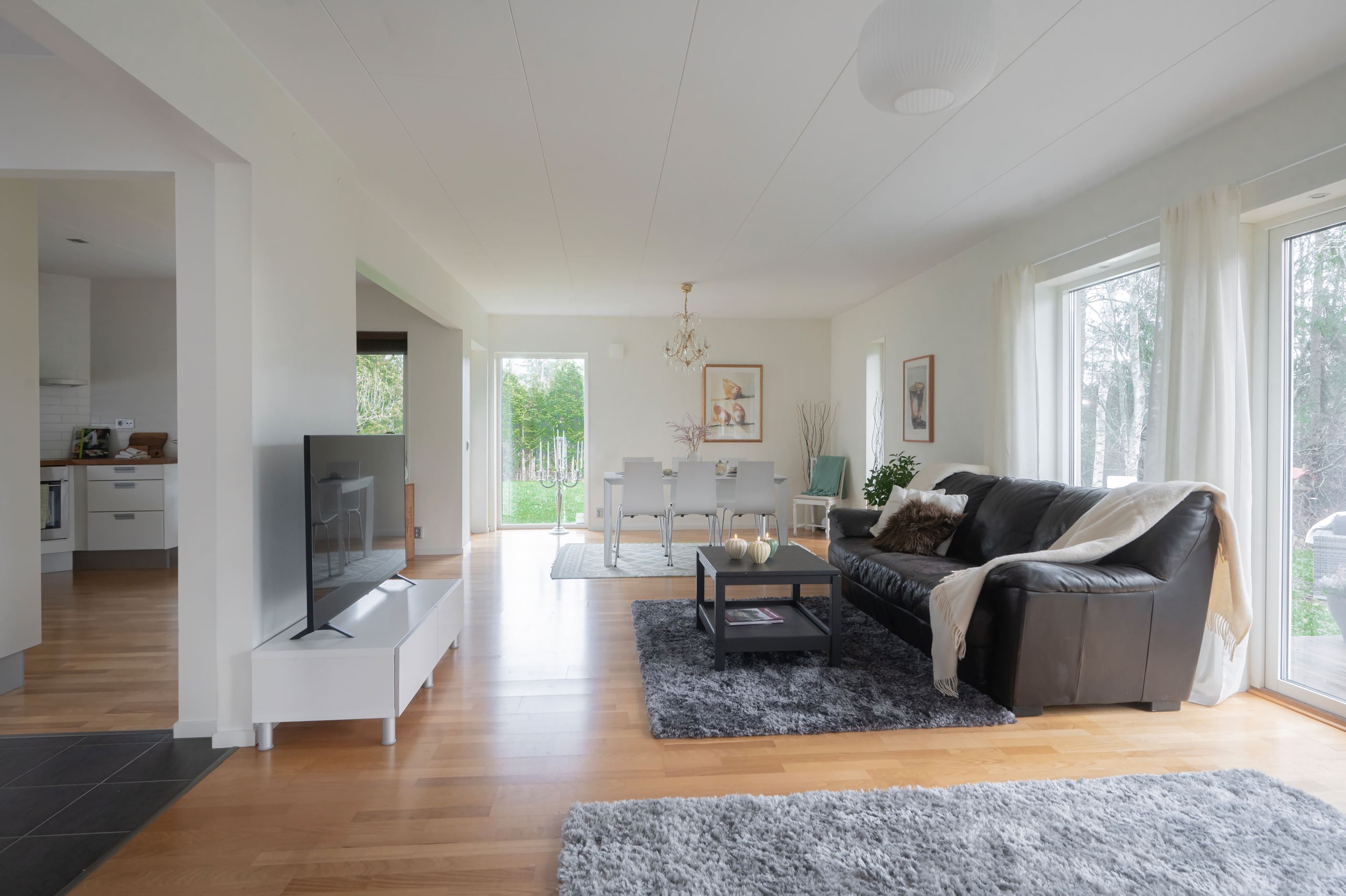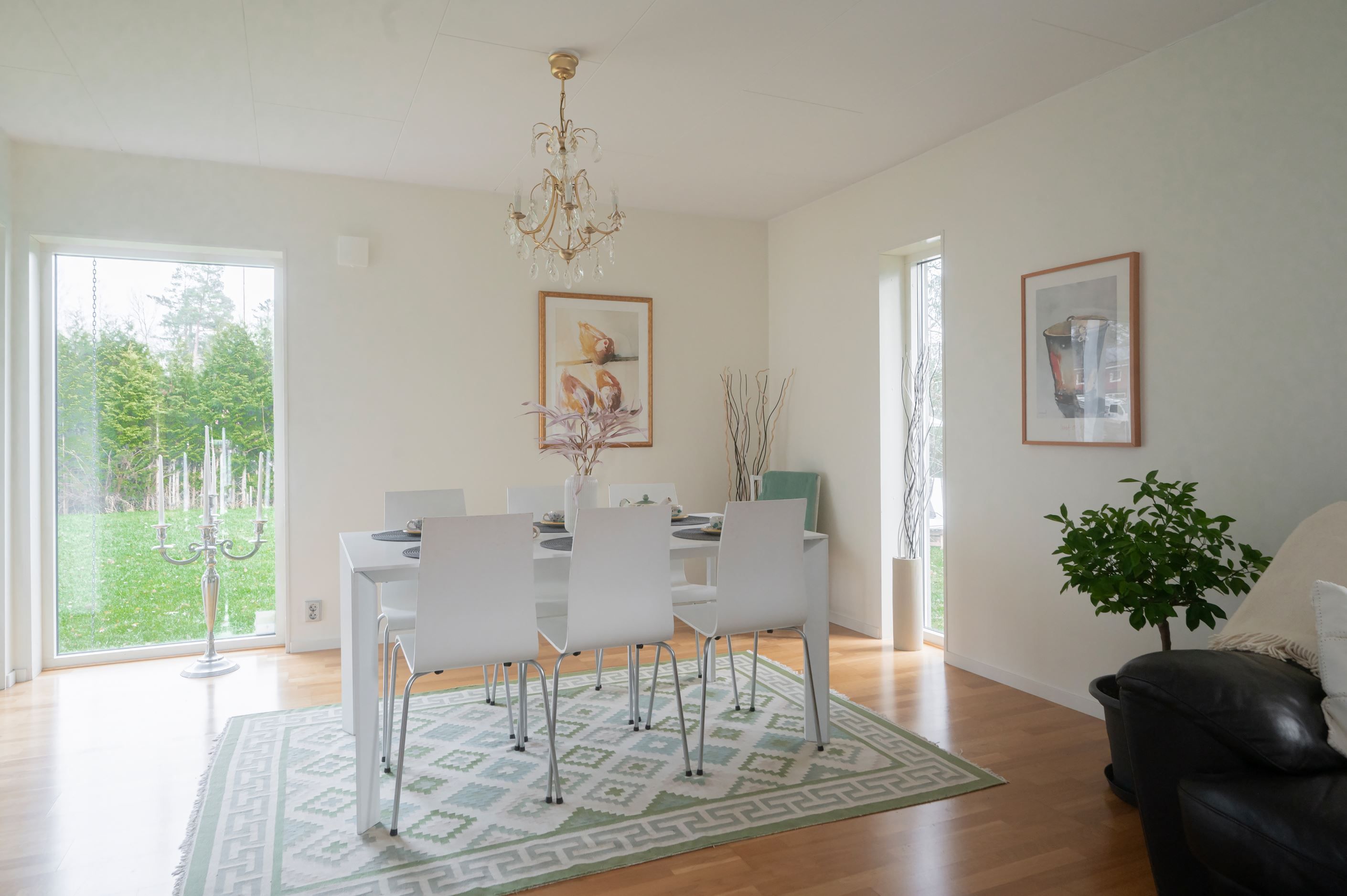 Detta hus med stilren träpanel imponerar med sitt genomtänkta utförande och den öppna känsla som präglar hela bostaden. De stora fönstren och takfönstren släpper in rikligt med ljus och låter de moderna, vita väggarna och parkettgolven komma till sin rätt. Köket flyter naturligt ihop med vardagsrummet och matsalsdelen, vilket skapar en social och trivsam yta för både vardagsliv och umgänge. Från vardagsrummet når du även uteplatsen på baksidan, perfekt för avkoppling och samvaro i lugn miljö.
