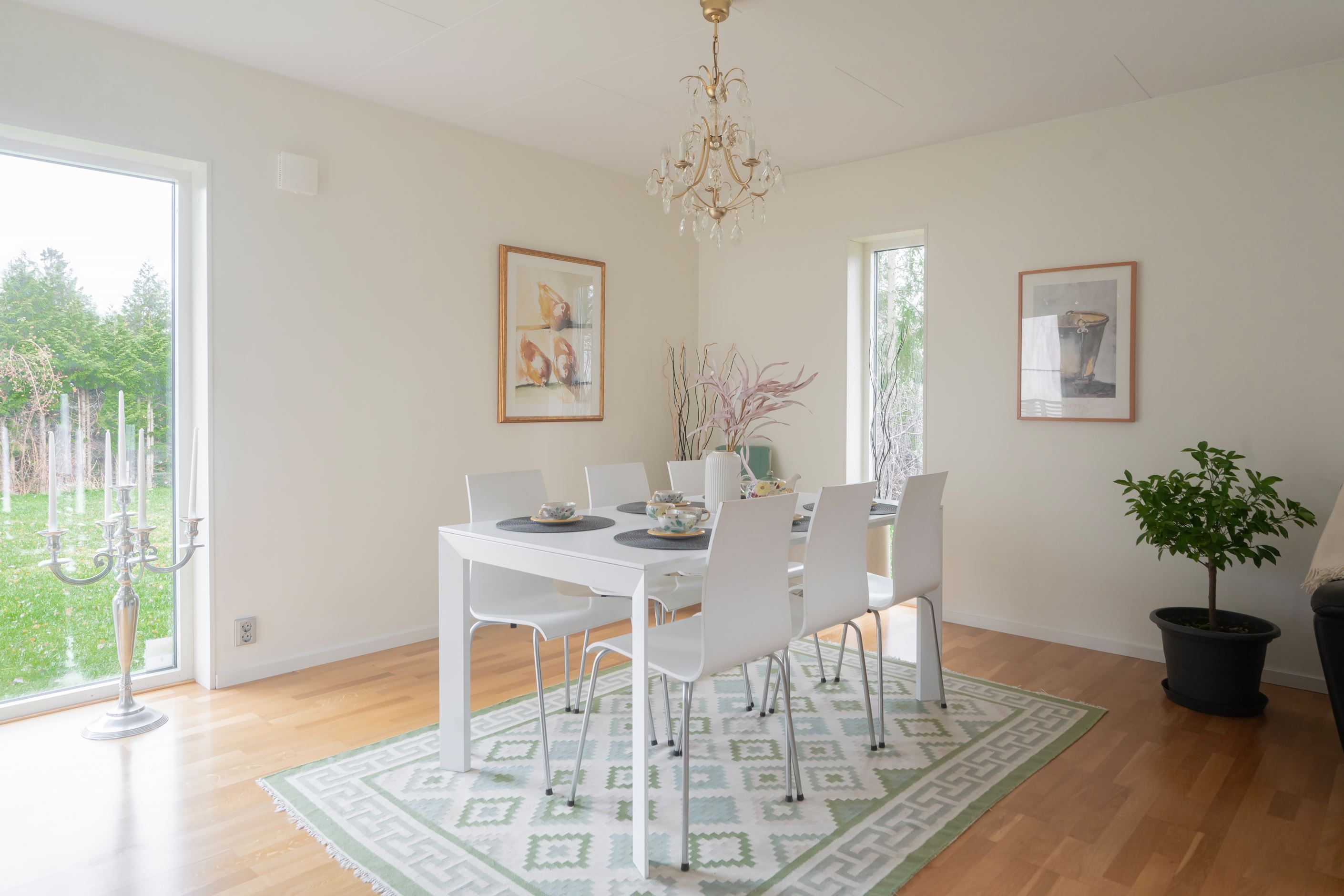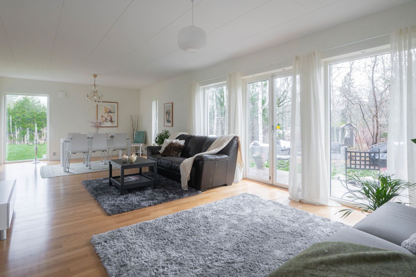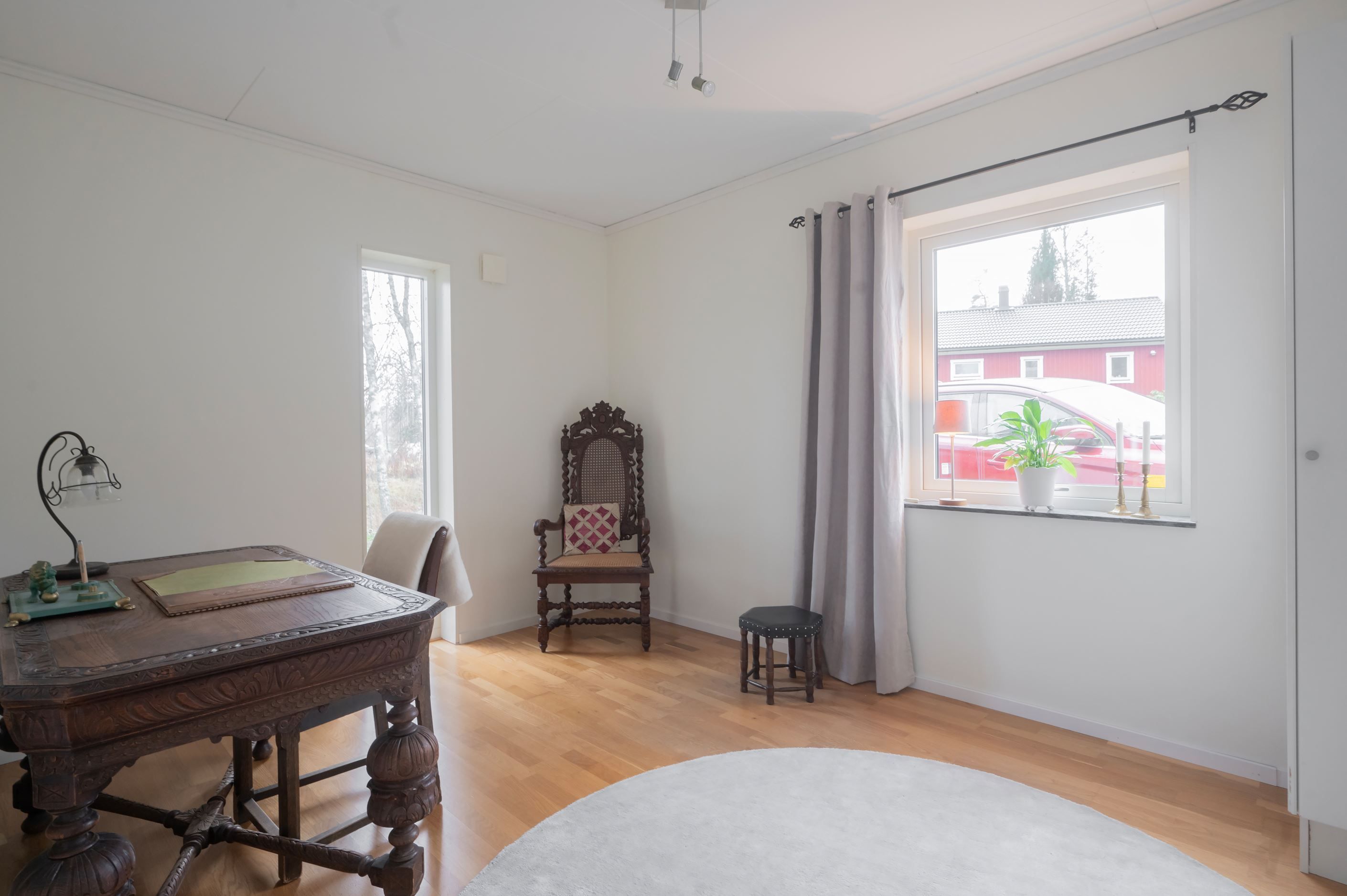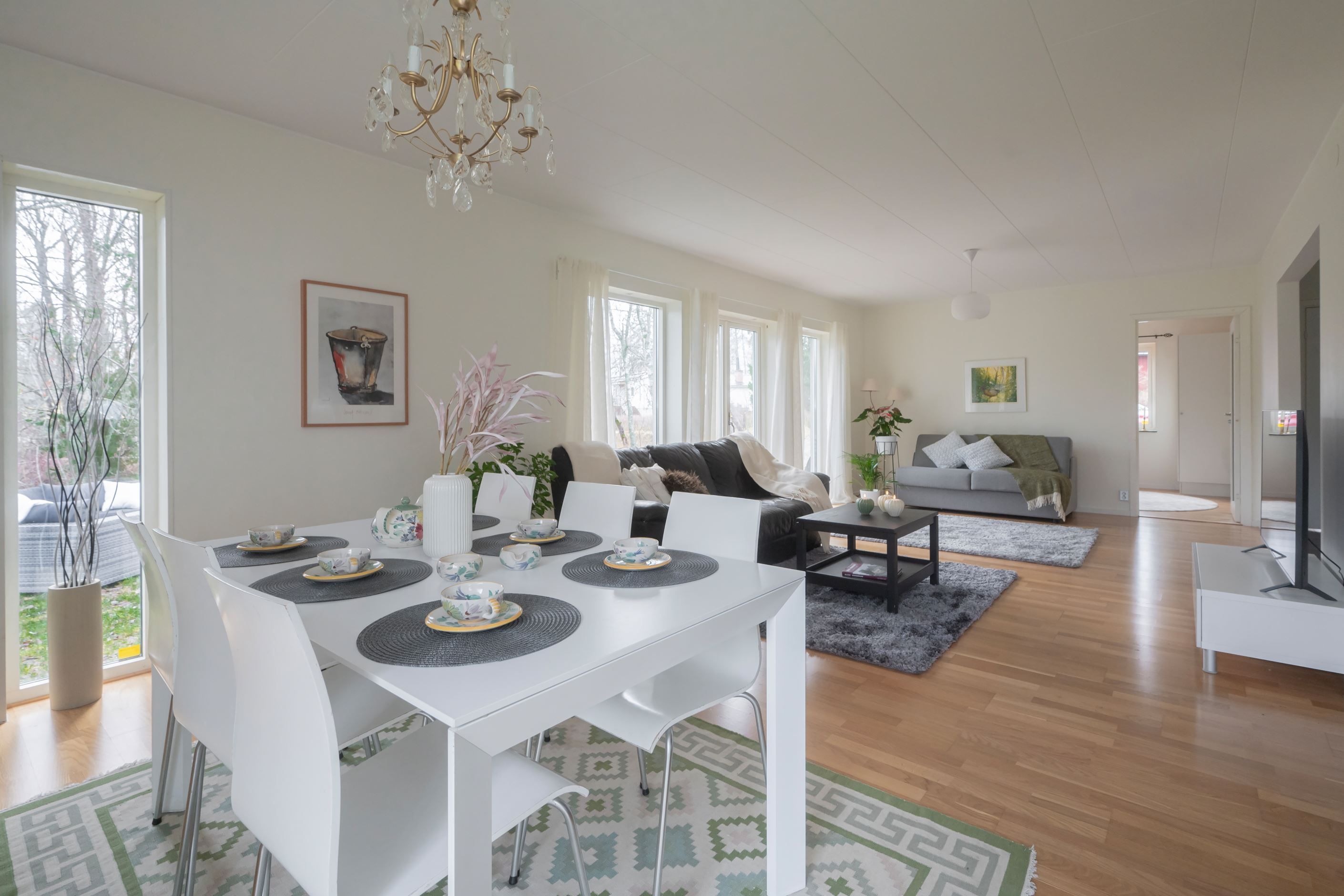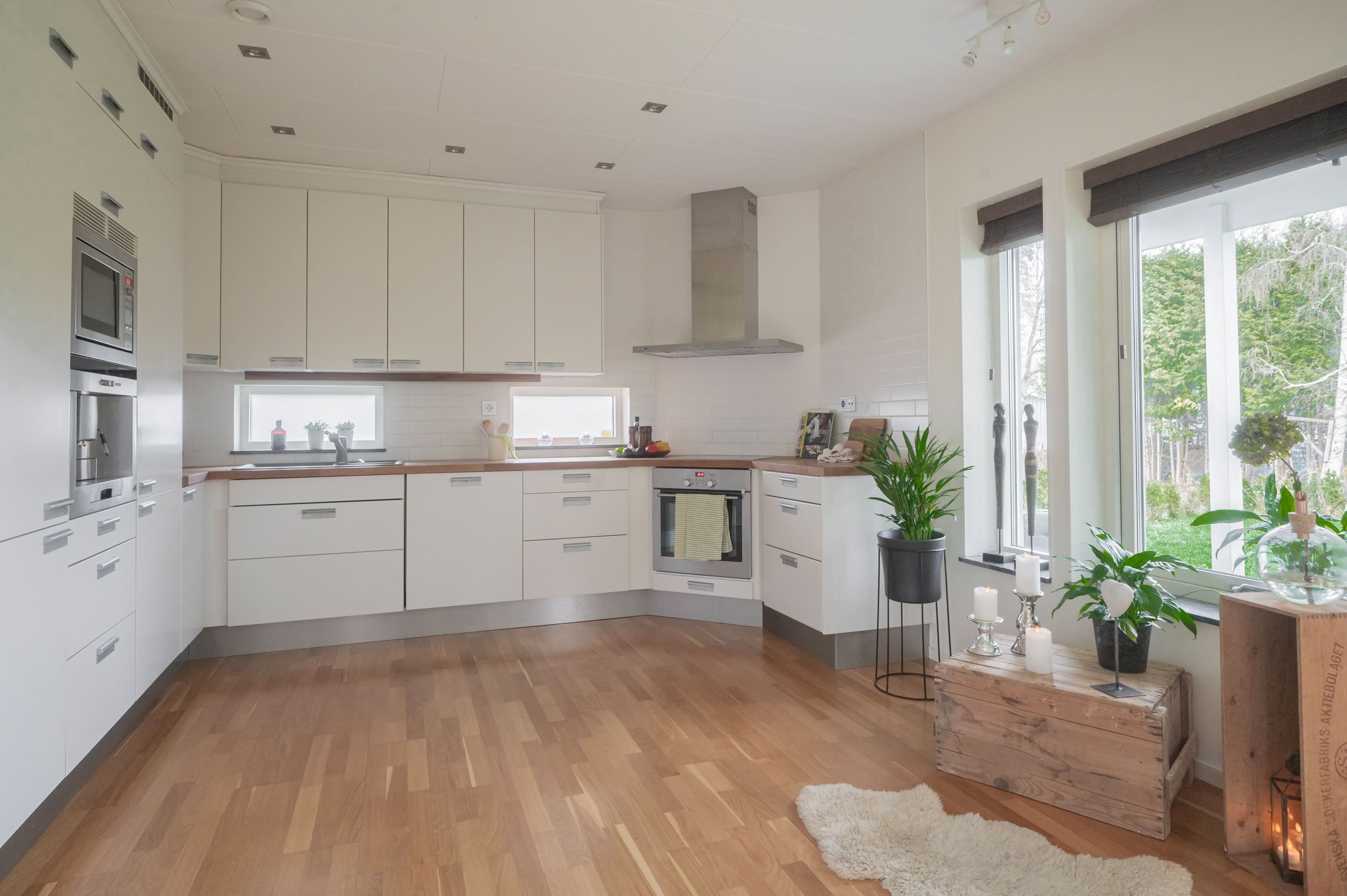 Detta hus med stilren träpanel imponerar med sitt genomtänkta utförande och den öppna känsla som präglar hela bostaden. De stora fönstren och takfönstren släpper in rikligt med ljus och låter de moderna, vita väggarna och parkettgolven komma till sin rätt. Köket flyter naturligt ihop med vardagsrummet och matsalsdelen, vilket skapar en social och trivsam yta för både vardagsliv och umgänge. Från vardagsrummet når du även uteplatsen på baksidan, perfekt för avkoppling och samvaro i lugn miljö.