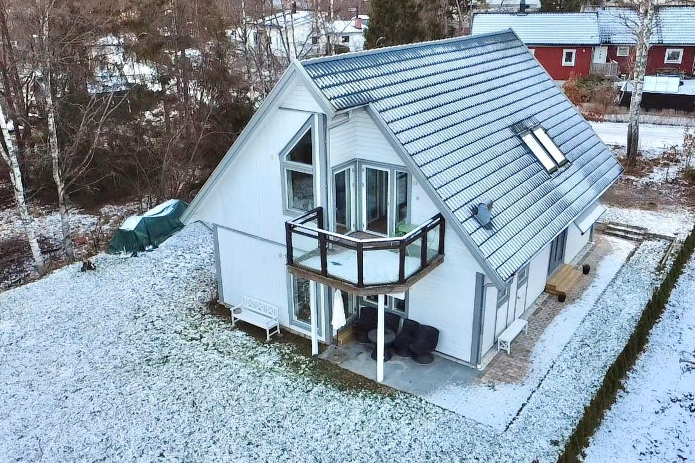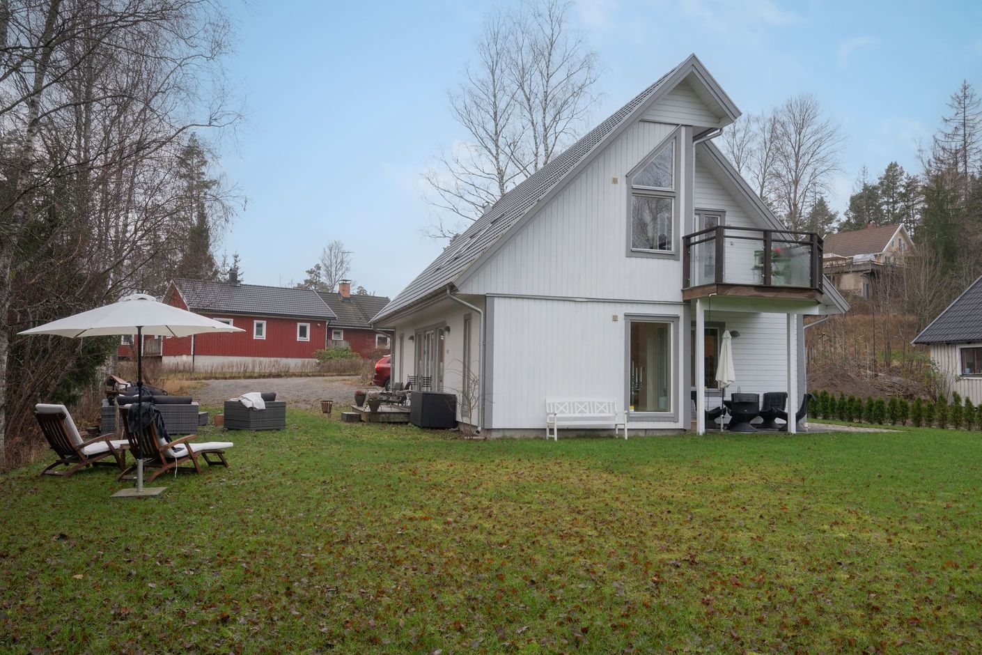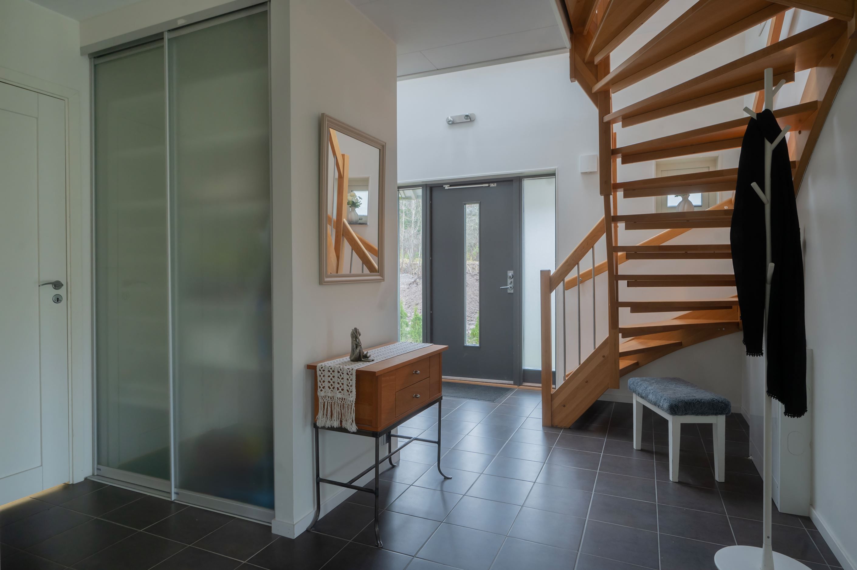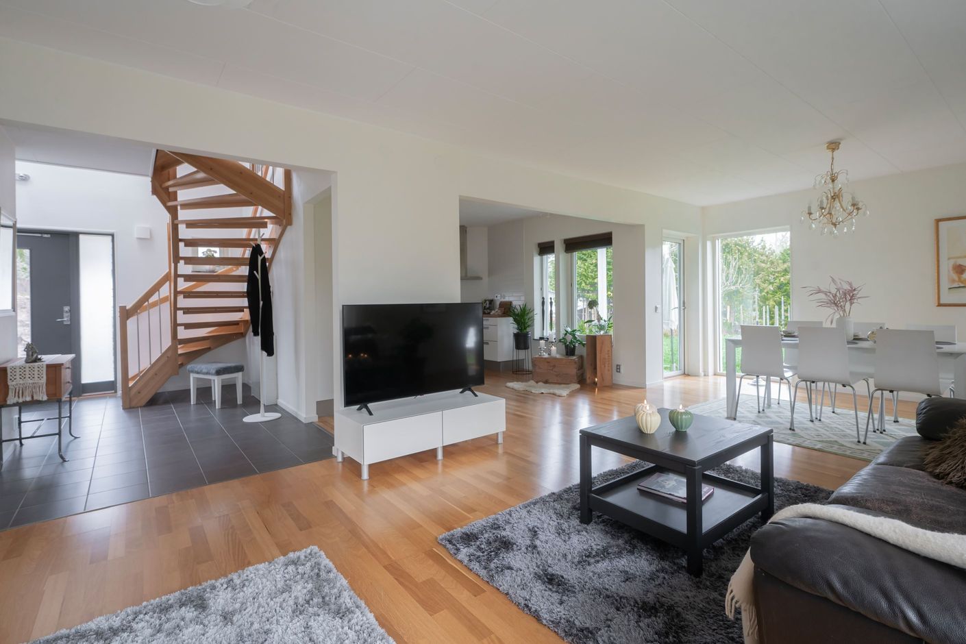 Detta hus med stilren träpanel imponerar med sitt genomtänkta utförande och den öppna känsla som präglar hela bostaden. De stora fönstren och takfönstren släpper in rikligt med ljus och låter de moderna, vita väggarna och parkettgolven komma till sin rätt. Köket flyter naturligt ihop med vardagsrummet och matsalsdelen, vilket skapar en social och trivsam yta för både vardagsliv och umgänge. Från vardagsrummet når du även uteplatsen på baksidan, perfekt för avkoppling och samvaro i lugn miljö.