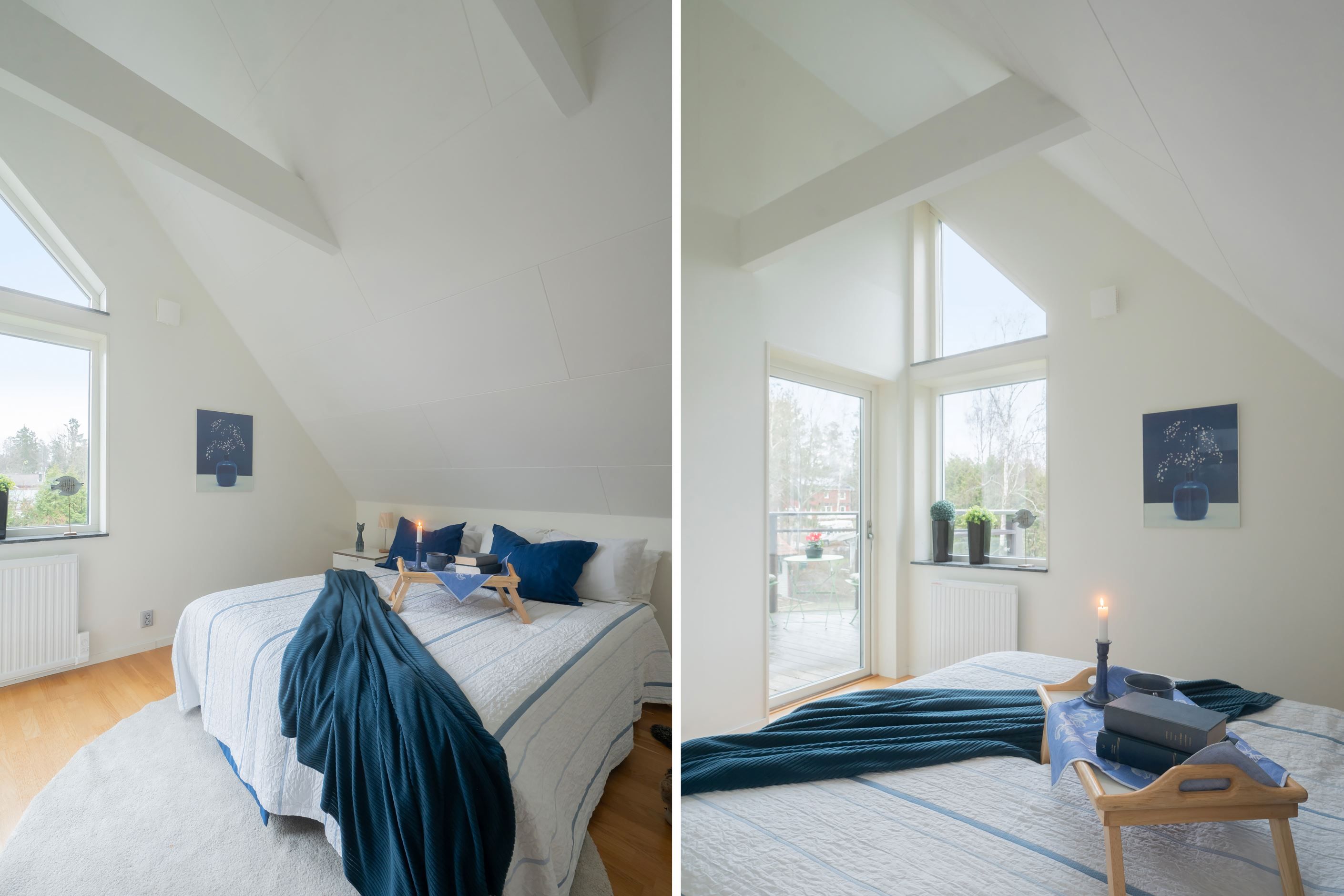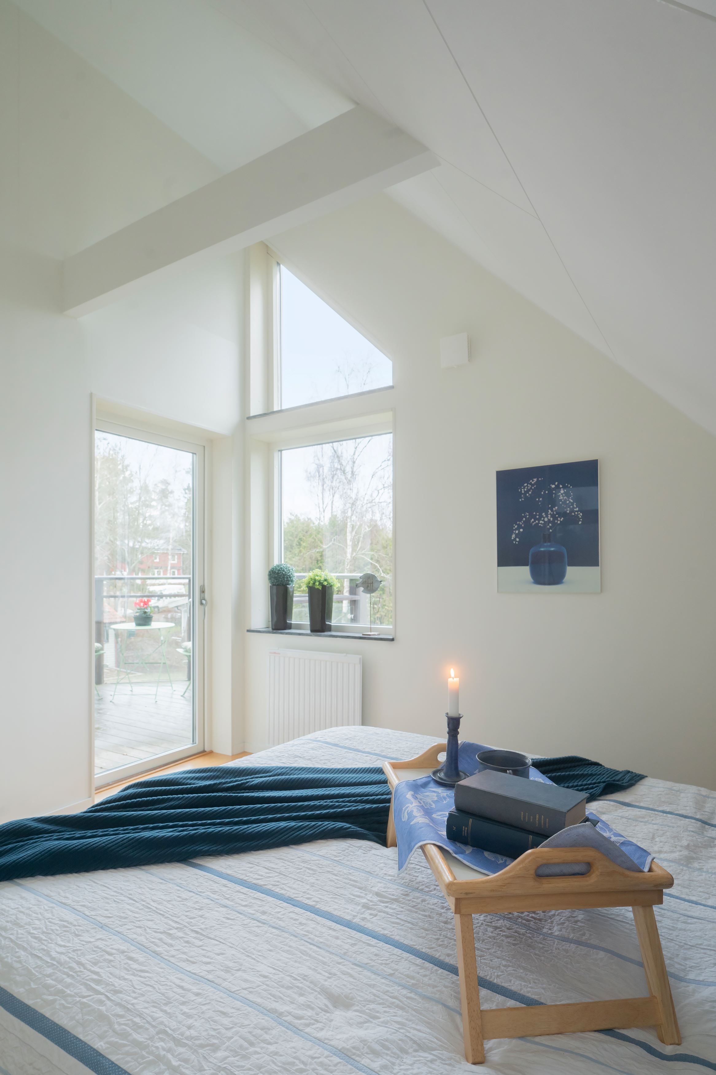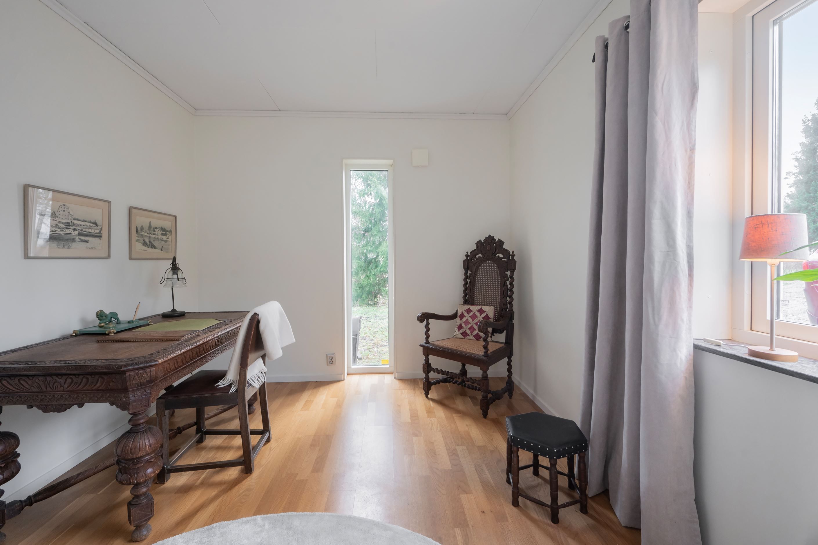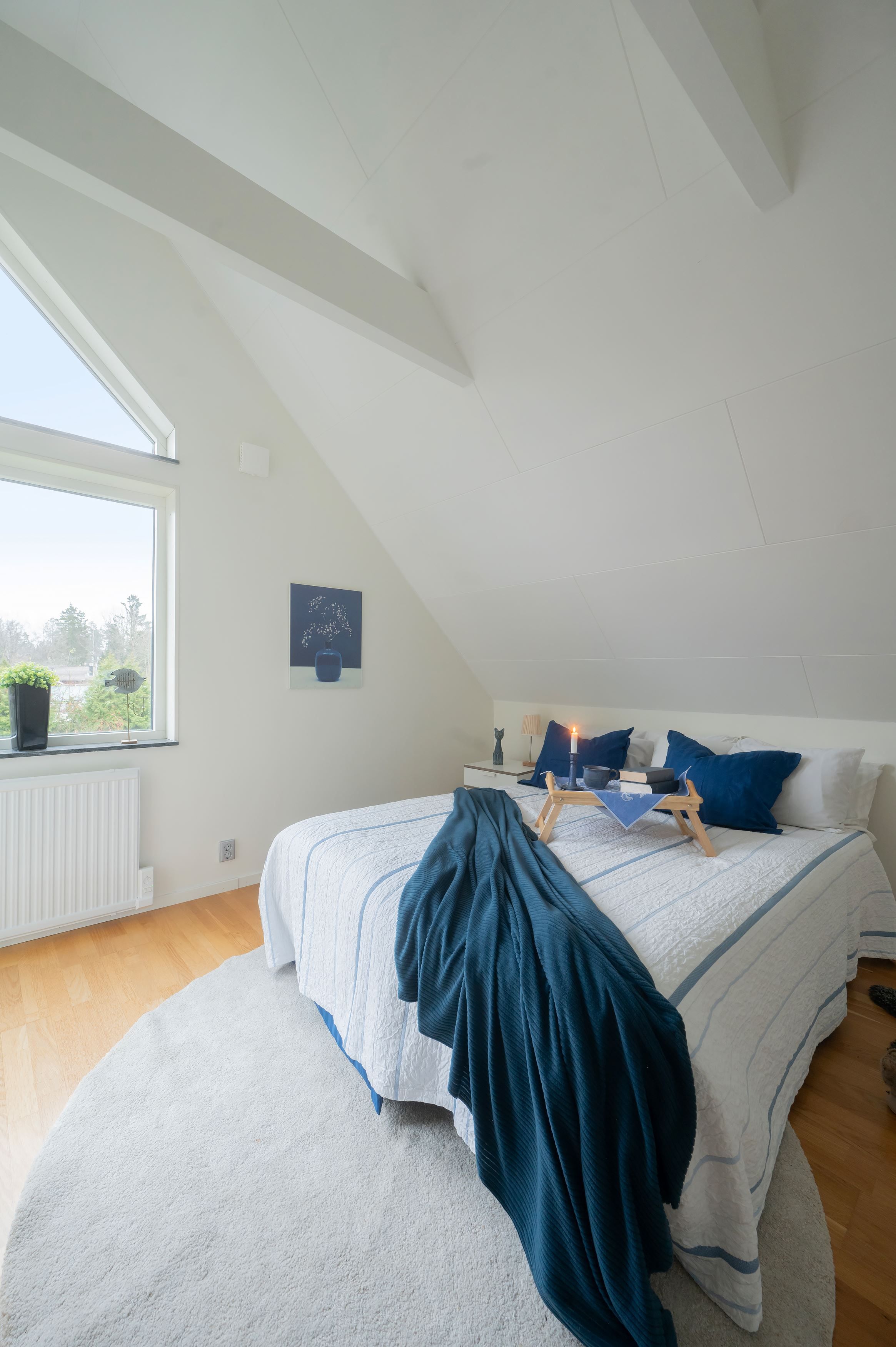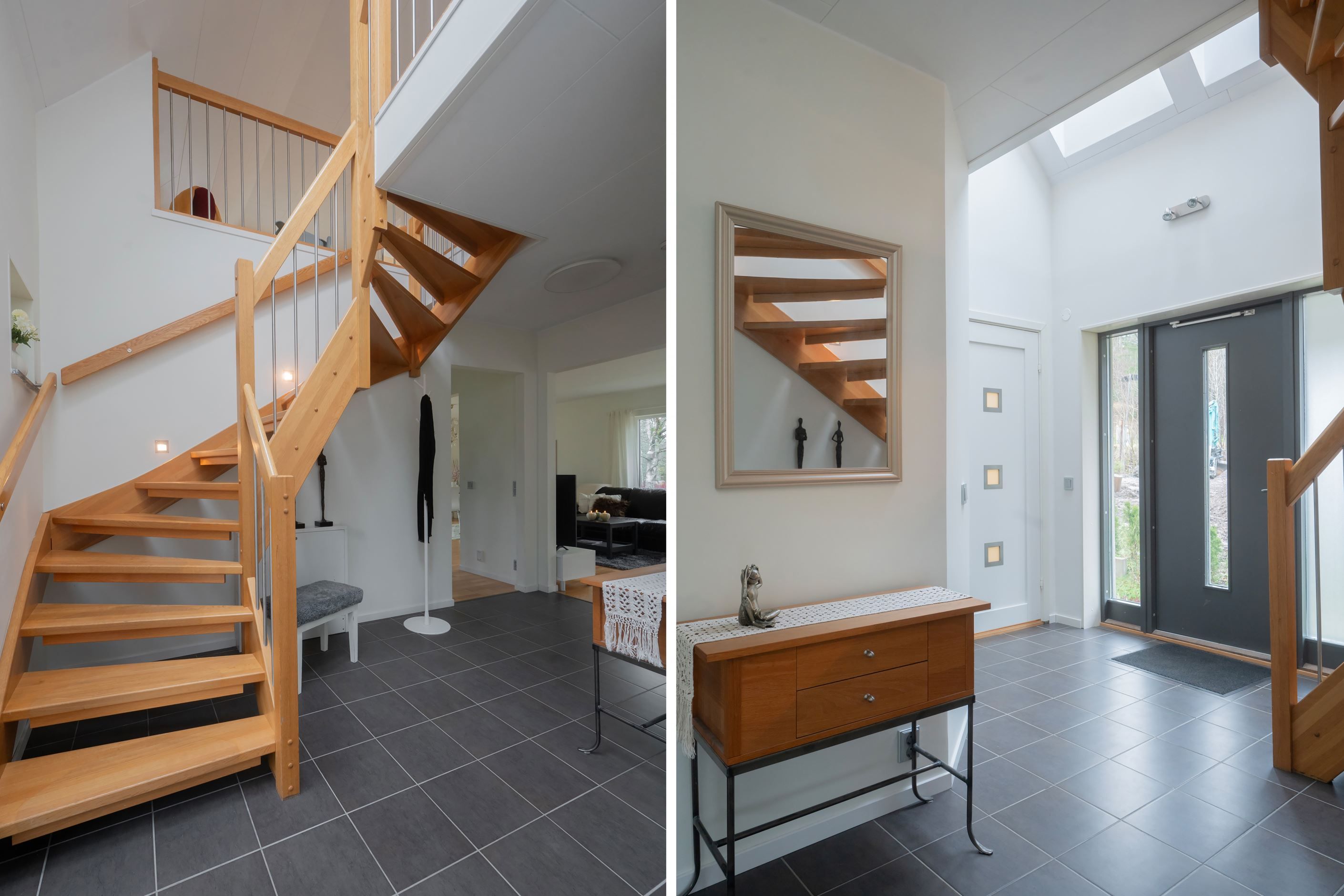 Detta hus med stilren träpanel imponerar med sitt genomtänkta utförande och den öppna känsla som präglar hela bostaden. De stora fönstren och takfönstren släpper in rikligt med ljus och låter de moderna, vita väggarna och parkettgolven komma till sin rätt. Köket flyter naturligt ihop med vardagsrummet och matsalsdelen, vilket skapar en social och trivsam yta för både vardagsliv och umgänge. Från vardagsrummet når du även uteplatsen på baksidan, perfekt för avkoppling och samvaro i lugn miljö.