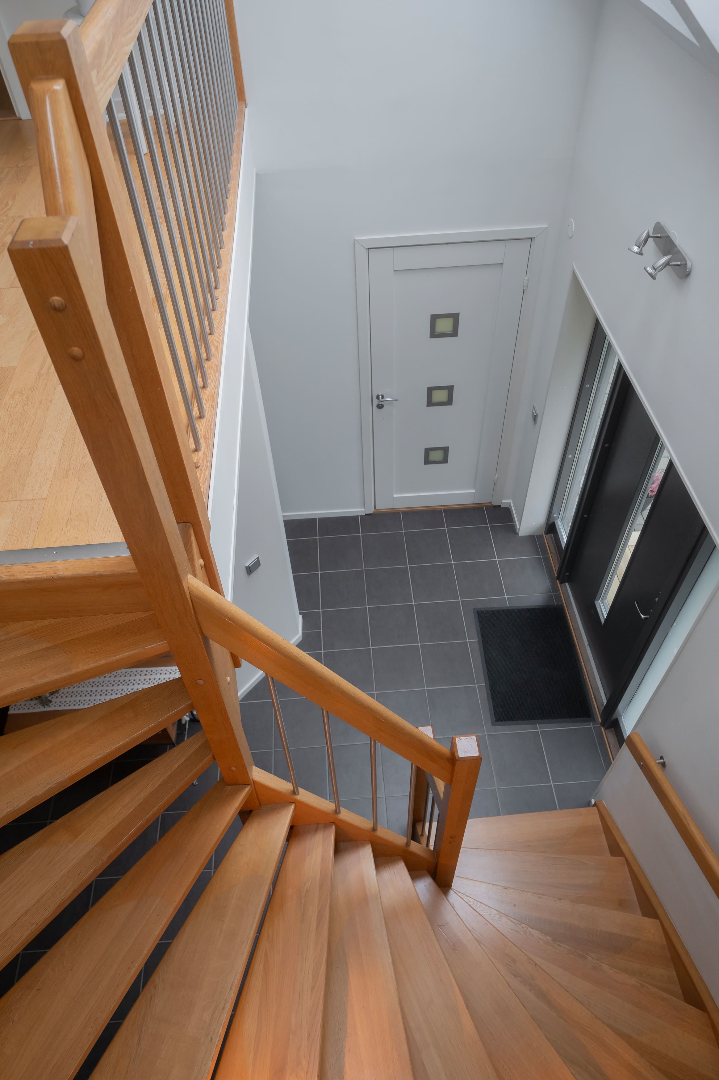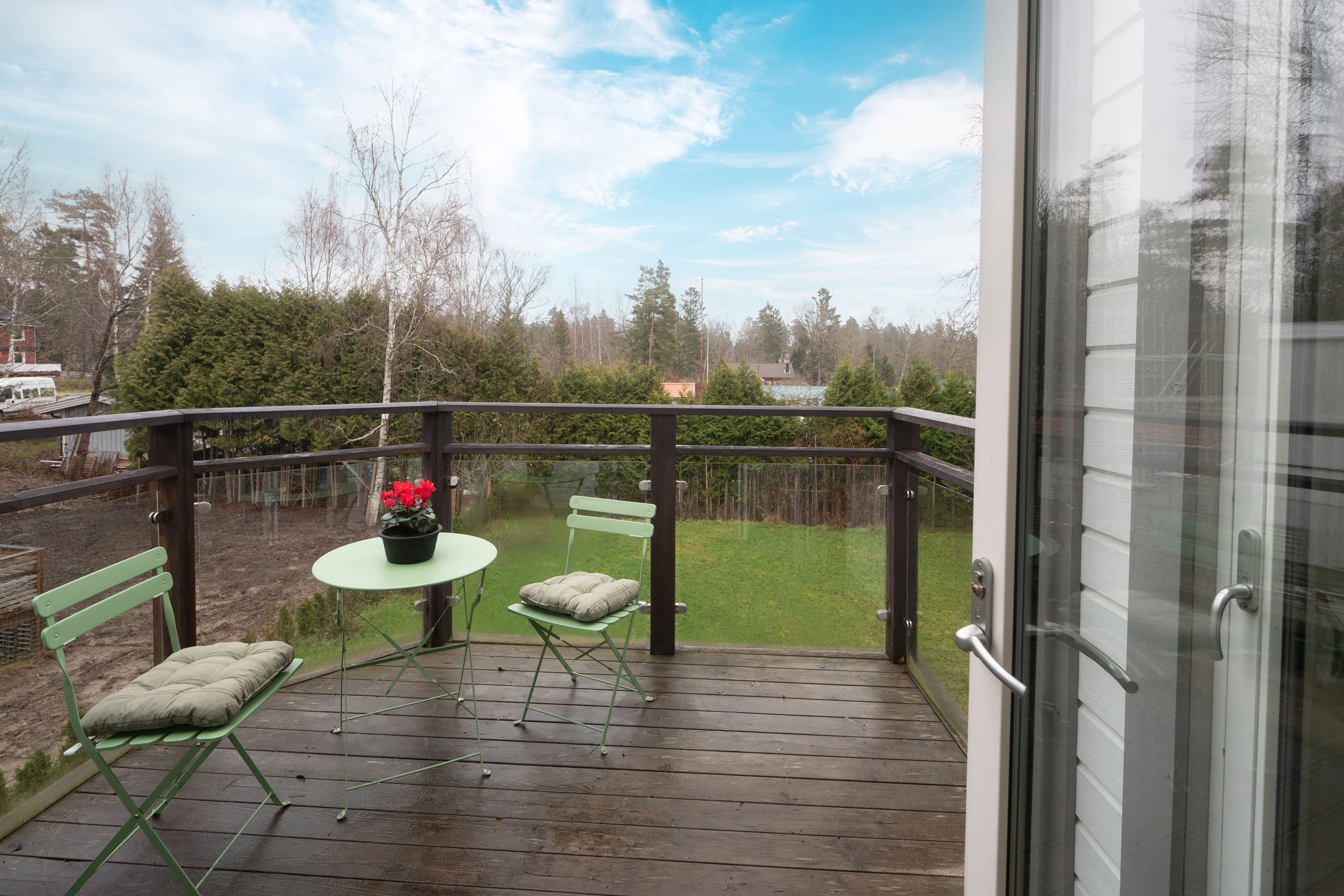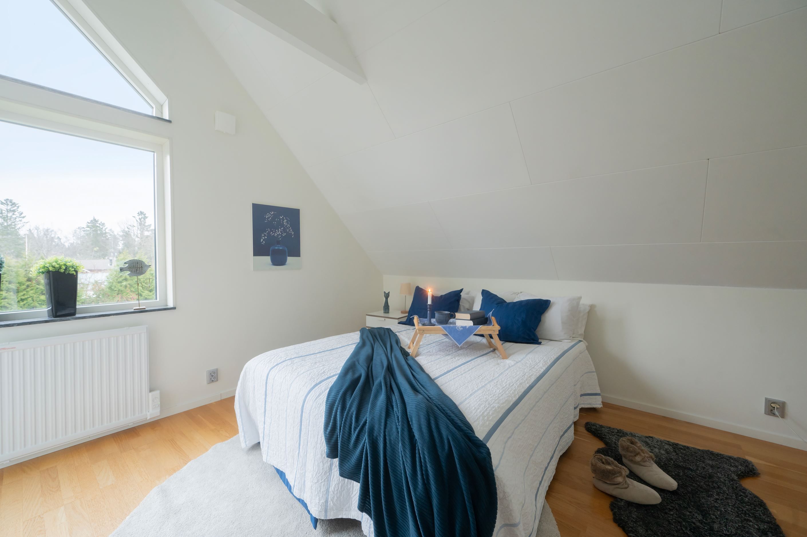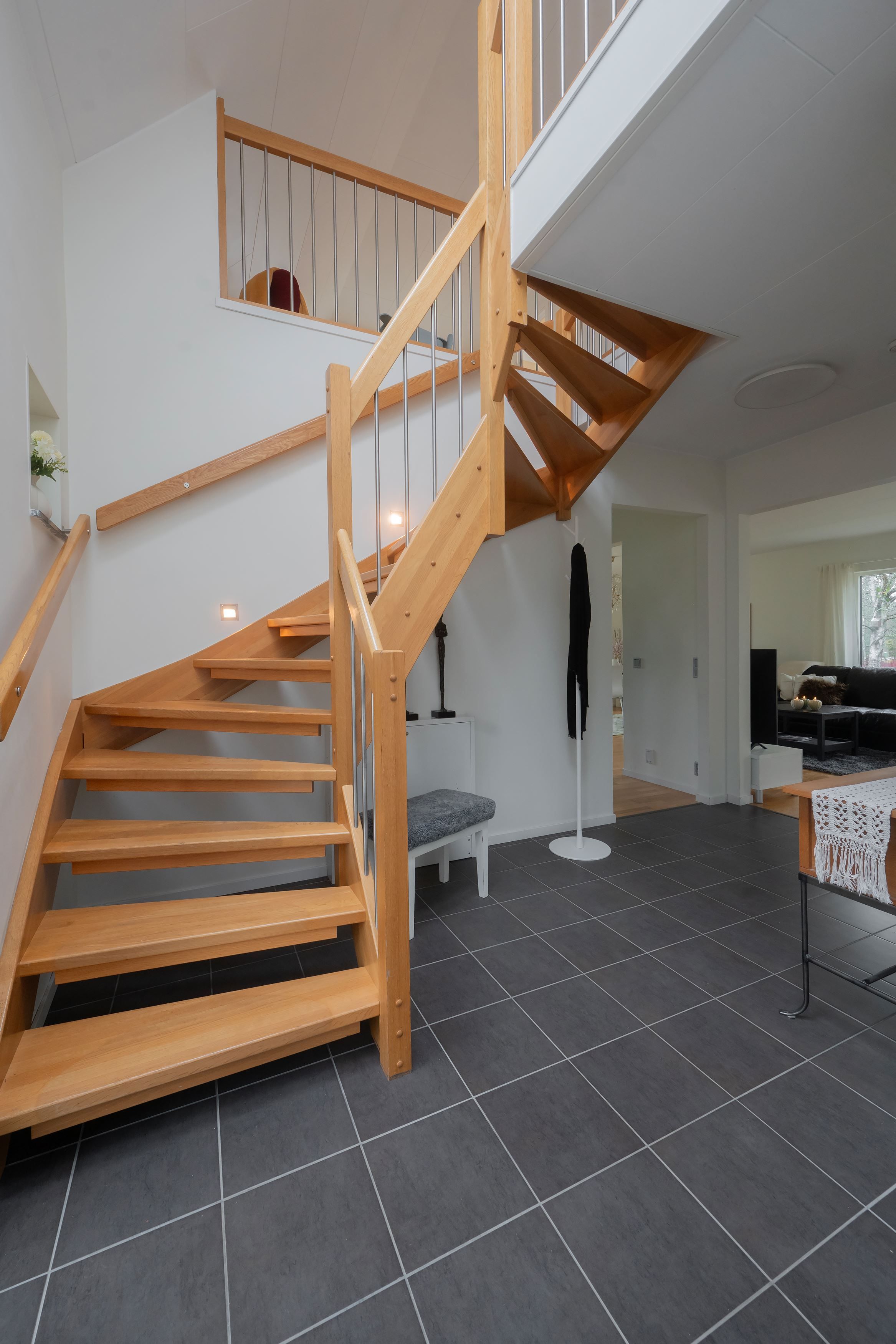 Detta hus med stilren träpanel imponerar med sitt genomtänkta utförande och den öppna känsla som präglar hela bostaden. De stora fönstren och takfönstren släpper in rikligt med ljus och låter de moderna, vita väggarna och parkettgolven komma till sin rätt. Köket flyter naturligt ihop med vardagsrummet och matsalsdelen, vilket skapar en social och trivsam yta för både vardagsliv och umgänge. Från vardagsrummet når du även uteplatsen på baksidan, perfekt för avkoppling och samvaro i lugn miljö.