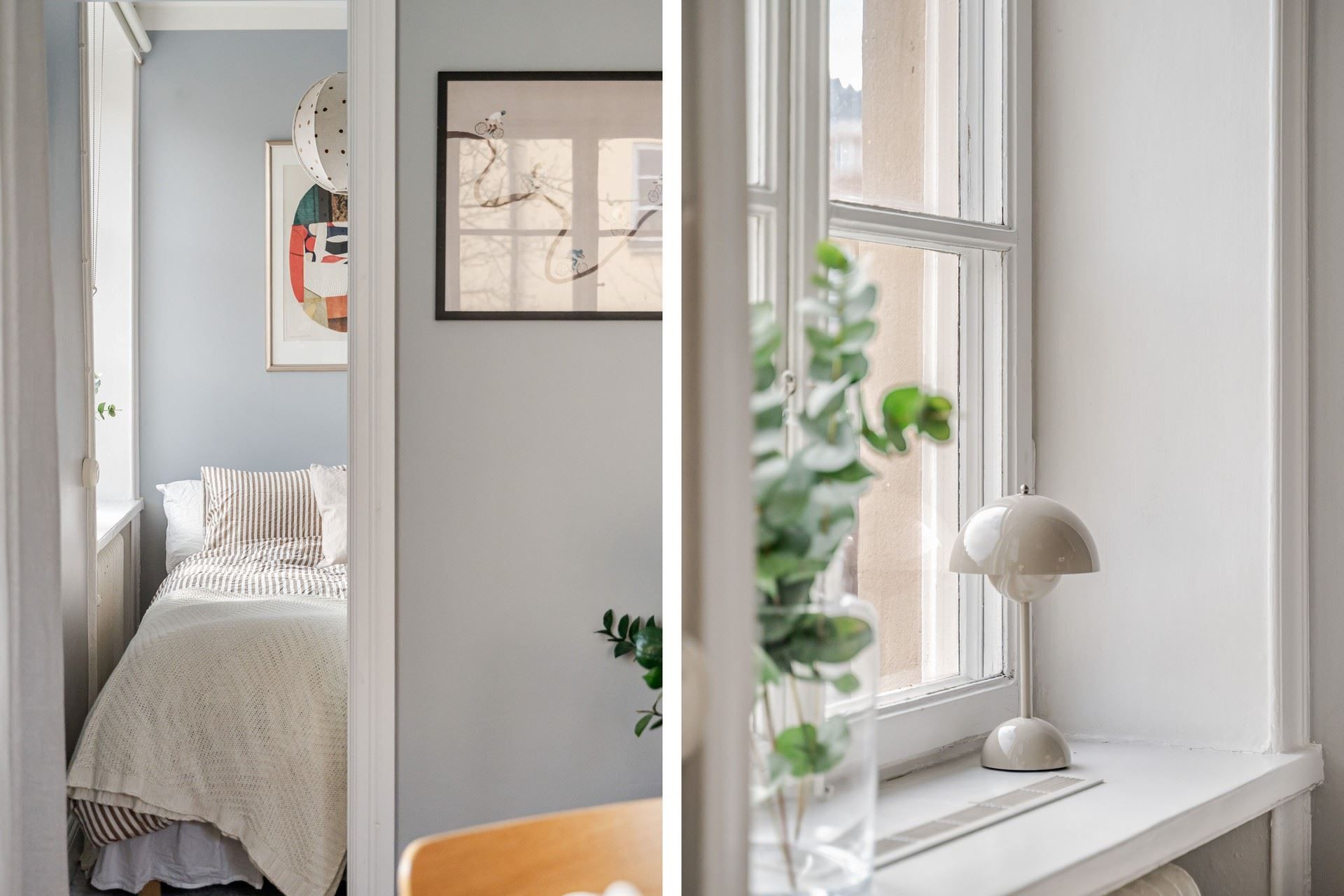 Sovrummet är rofyllt och ligger avskilt med plats för säng. Här skapas en lugn miljö för vila samtidigt som glaspartiet mot köket ger ett fint ljusinsläpp. I bostaden finns också en walk-in garderob och upphängningsyta i hallen.