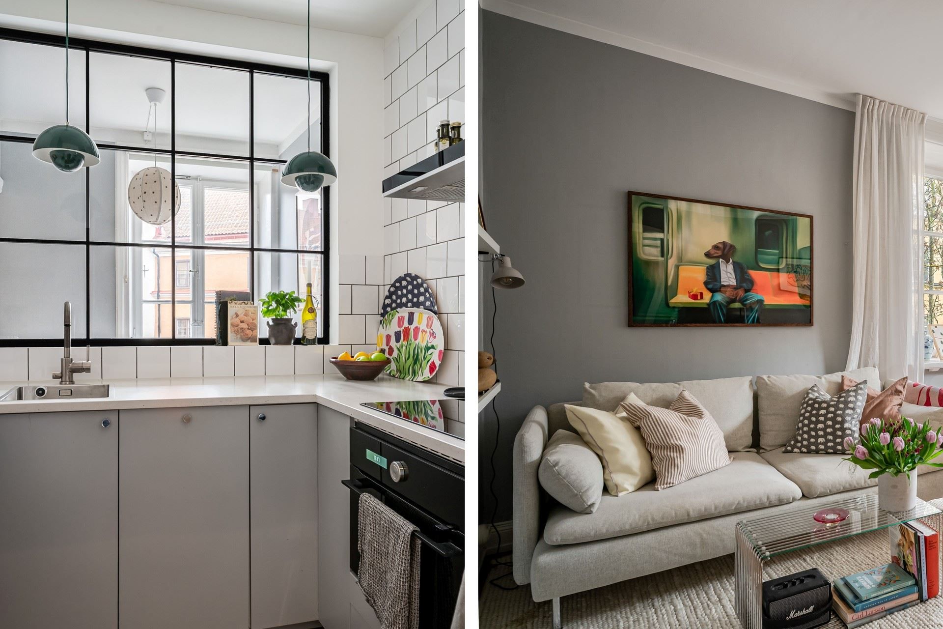 Köket är smakfullt utformat med ljust gråa skåpsluckor, arbetsbänk i sten och vitt kakel ovan bänkskiva. Ljuset från fönstret mot sovrummet skapas genom ett stilrent glasparti som ger ljusflöde mellan rummen.