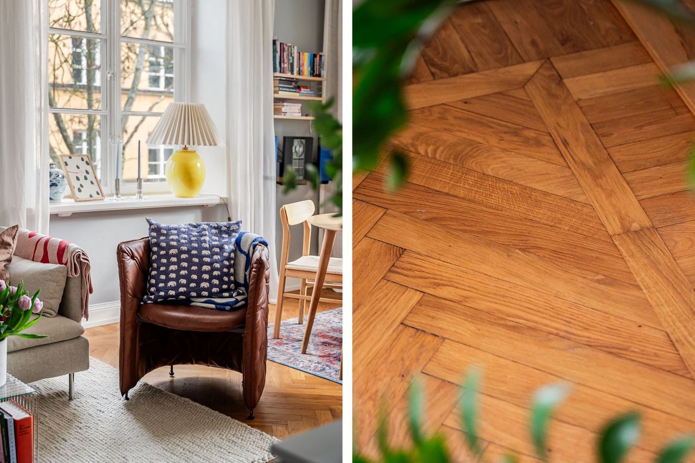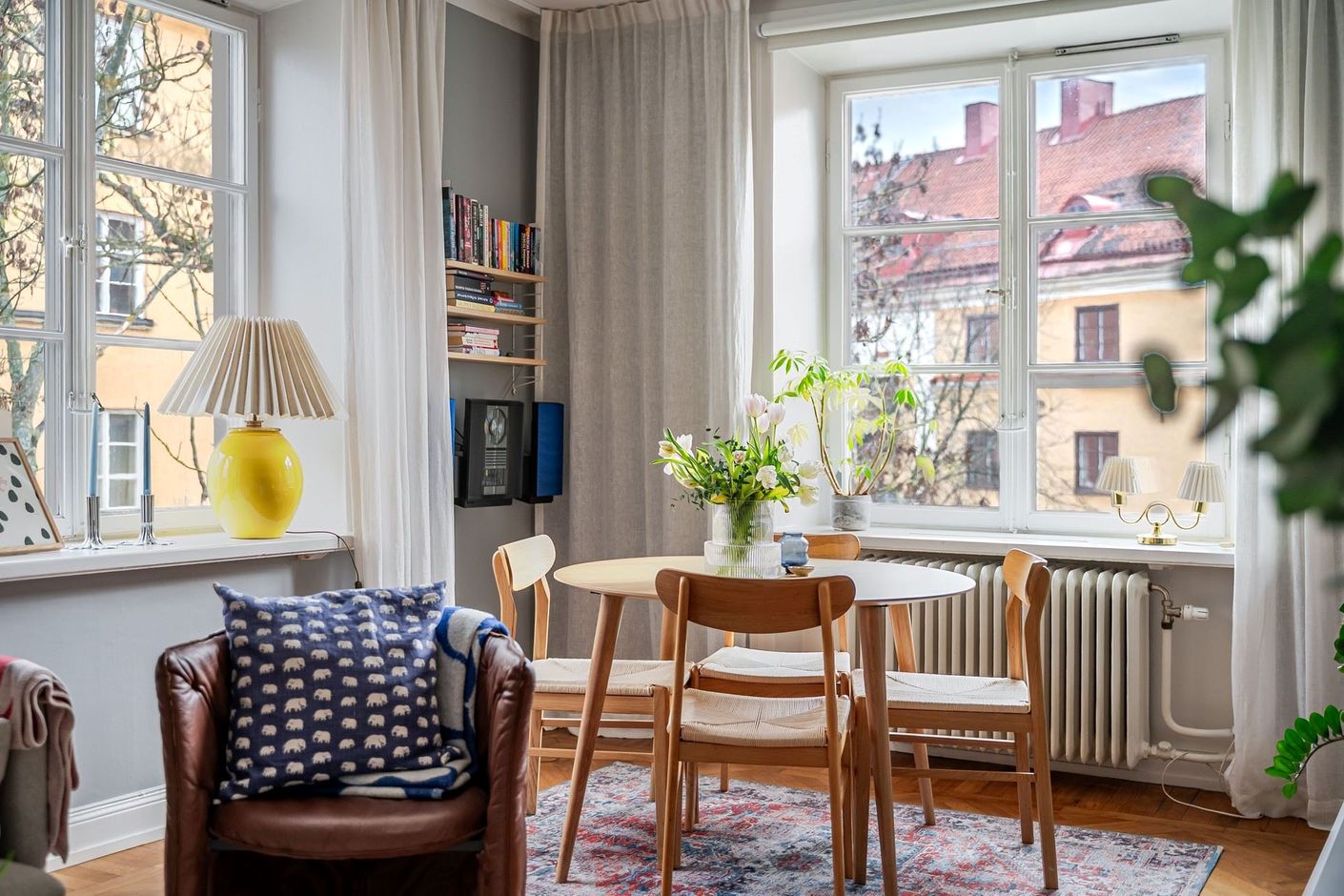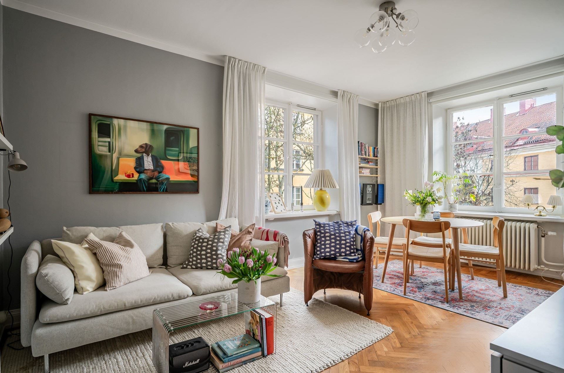 Vardagsrummet ligger i ett vackert hörnläge vilket gör att det känns rymligt och luftigt med stora fönsterpartier som släpper in rikligt med dagsljus. Här finns gott om plats för både soffgrupp och matplats. De vackra parkettgolven i fiskbensmönster bidrar till bostadens klassiska känsla och skapar en varm atmosfär. Ljuset flödar oavsett om vädret är soligt eller inte.