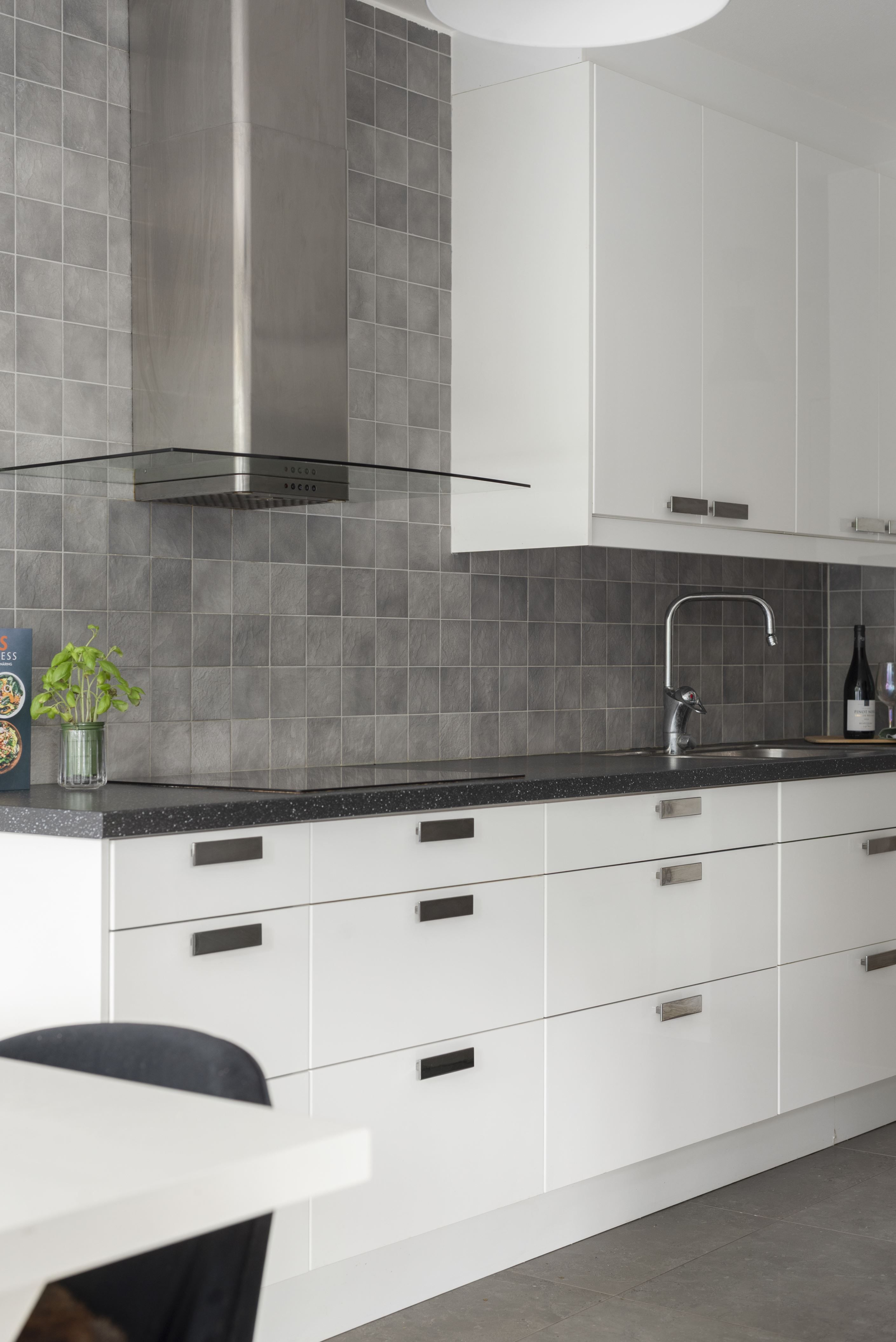 Köket är ljust och funktionellt, med vita skåpluckor, svart laminatbänkskiva och gott om förvaring. Här finns utrymme för matplats vid fönster – perfekt för både vardagsmiddagar och helgfrukostar.